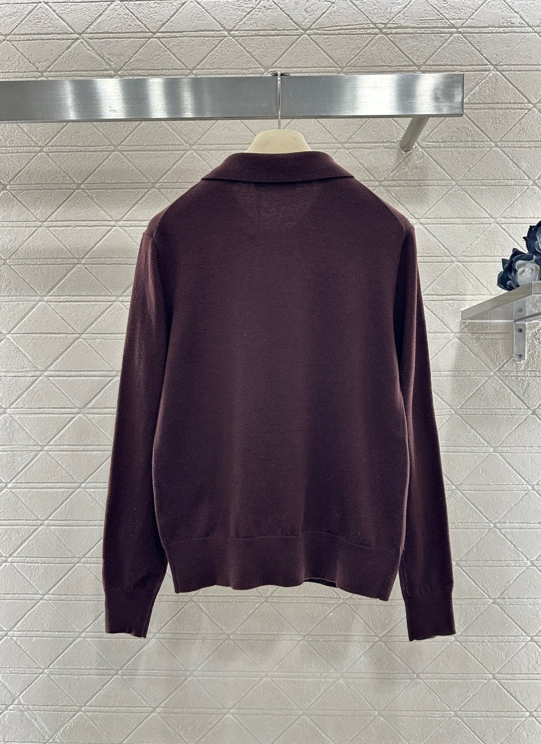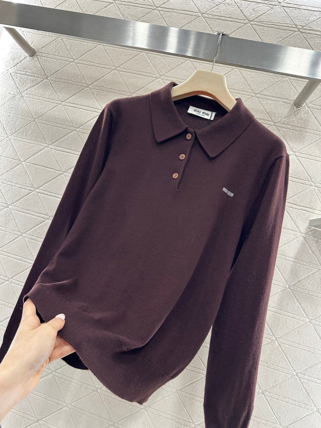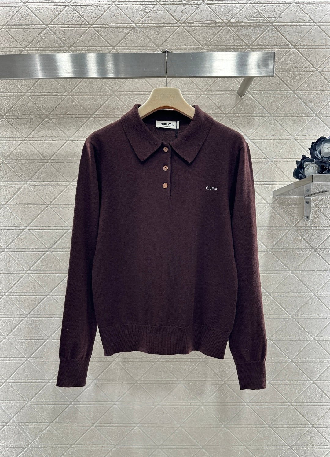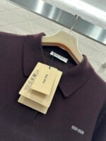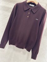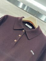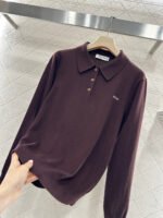 Crafted from wool yarn, this soft and cozy knit features a comfortable, skin-friendly texture. The half-open collar and long sleeves offer a relaxed fit with dropped shoulders. This vintage-inspired dark brown knit sweater is absolutely charming. The soft knit texture pairs perfectly with the classic collar, while the three-button closure offers simplicity with thoughtful detail. The subtle chest logo adds a finishing touch. Pair it with a skirt or jeans to instantly elevate your look with effortless vintage charm.