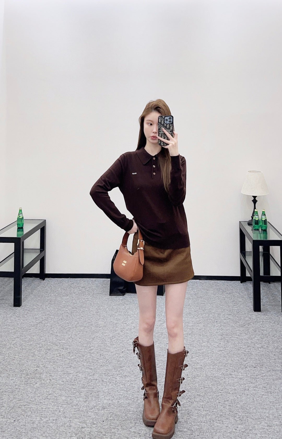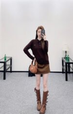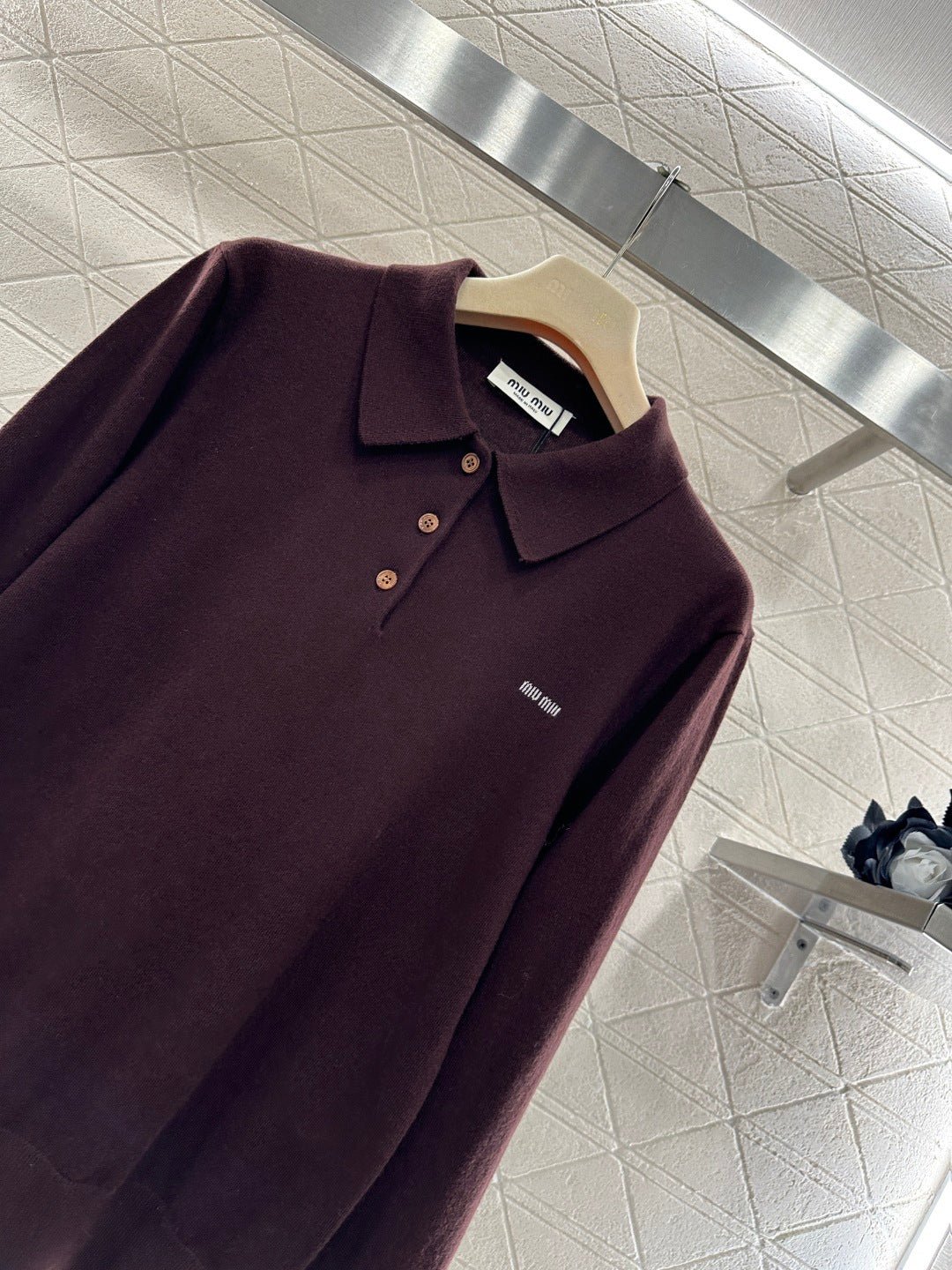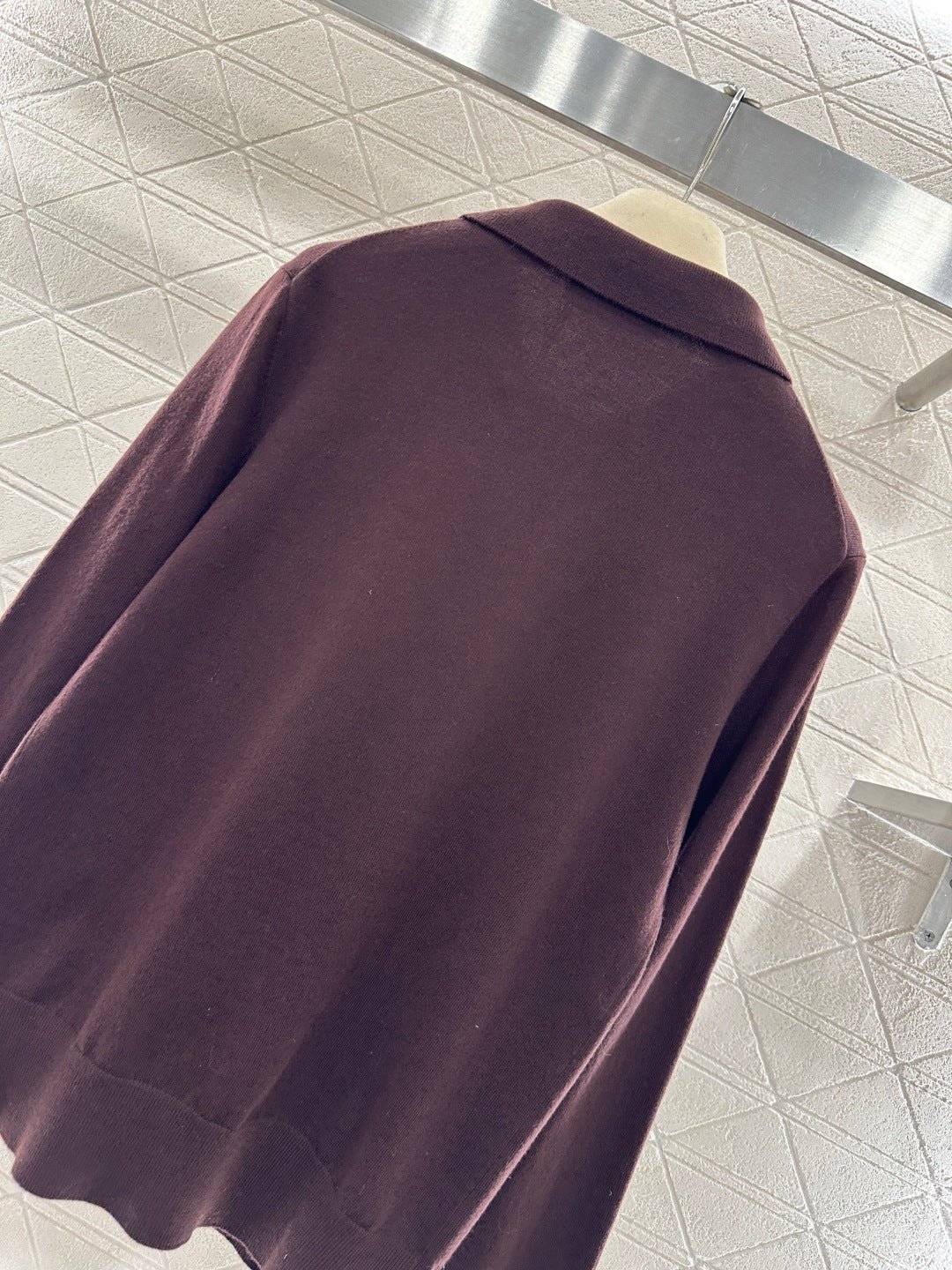 Crafted from wool yarn, this soft and cozy knit features a comfortable, skin-friendly texture. The half-open collar and long sleeves offer a relaxed fit with dropped shoulders. This vintage-inspired dark brown knit sweater is absolutely charming. The soft knit texture pairs perfectly with the classic collar, while the three-button closure offers simplicity with thoughtful detail. The subtle chest logo adds a finishing touch. Pair it with a skirt or jeans to instantly elevate your look with effortless vintage charm.
