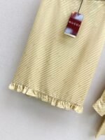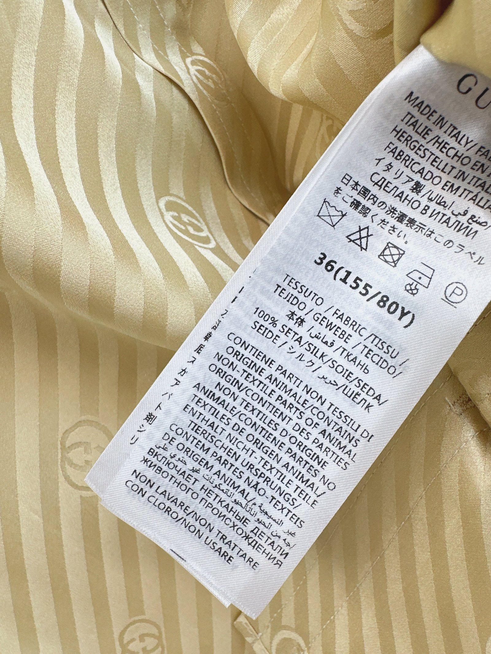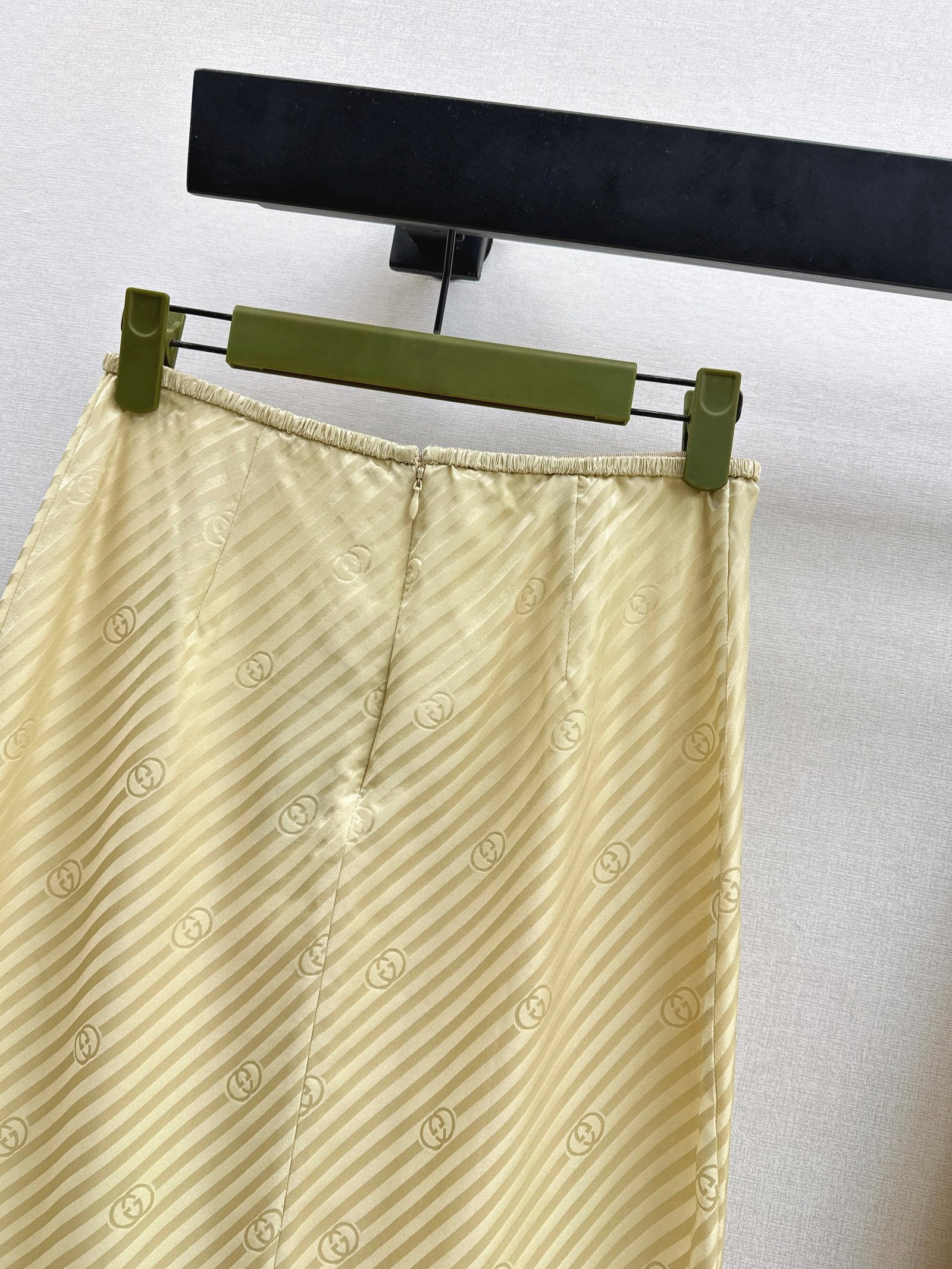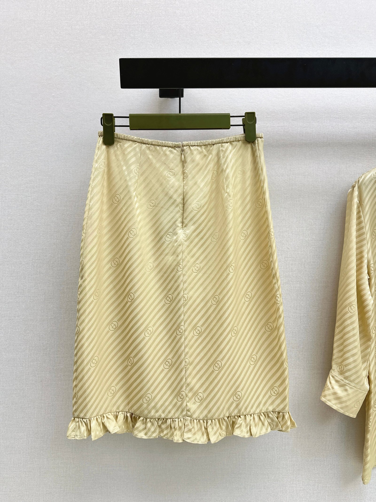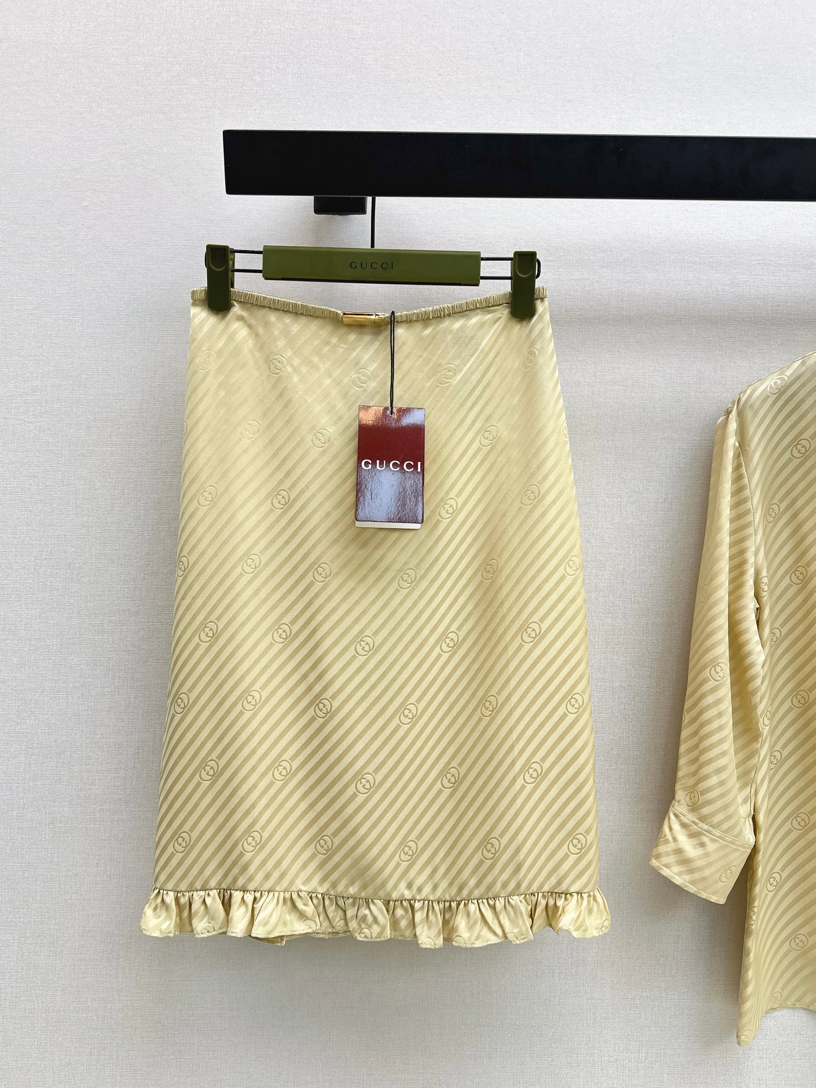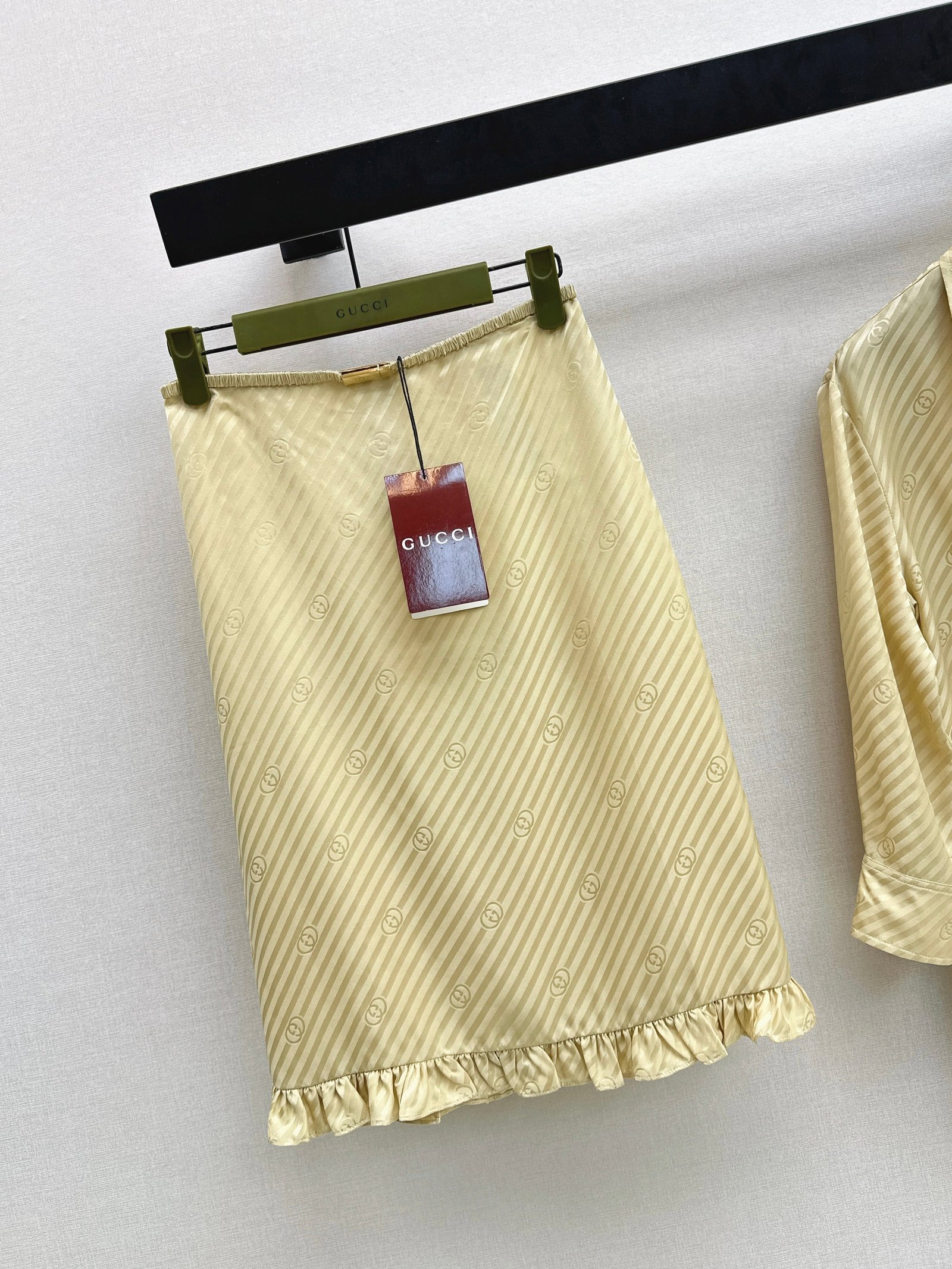 Made from imported jacquard silk, this set boasts a luxurious sheen and is incredibly comfortable against the skin. It perfectly embodies a gentle, feminine style. The clear, hazy blue hue enhances a refined and elegant look. The subtle double-G jacquard pattern adds a touch of understated sophistication. The draping silk fabric exudes a relaxed yet luxurious feel. The shirt and skirt combination is effortless and versatile, perfect for everyday wear or dates, easily creating an elegant and sophisticated style.