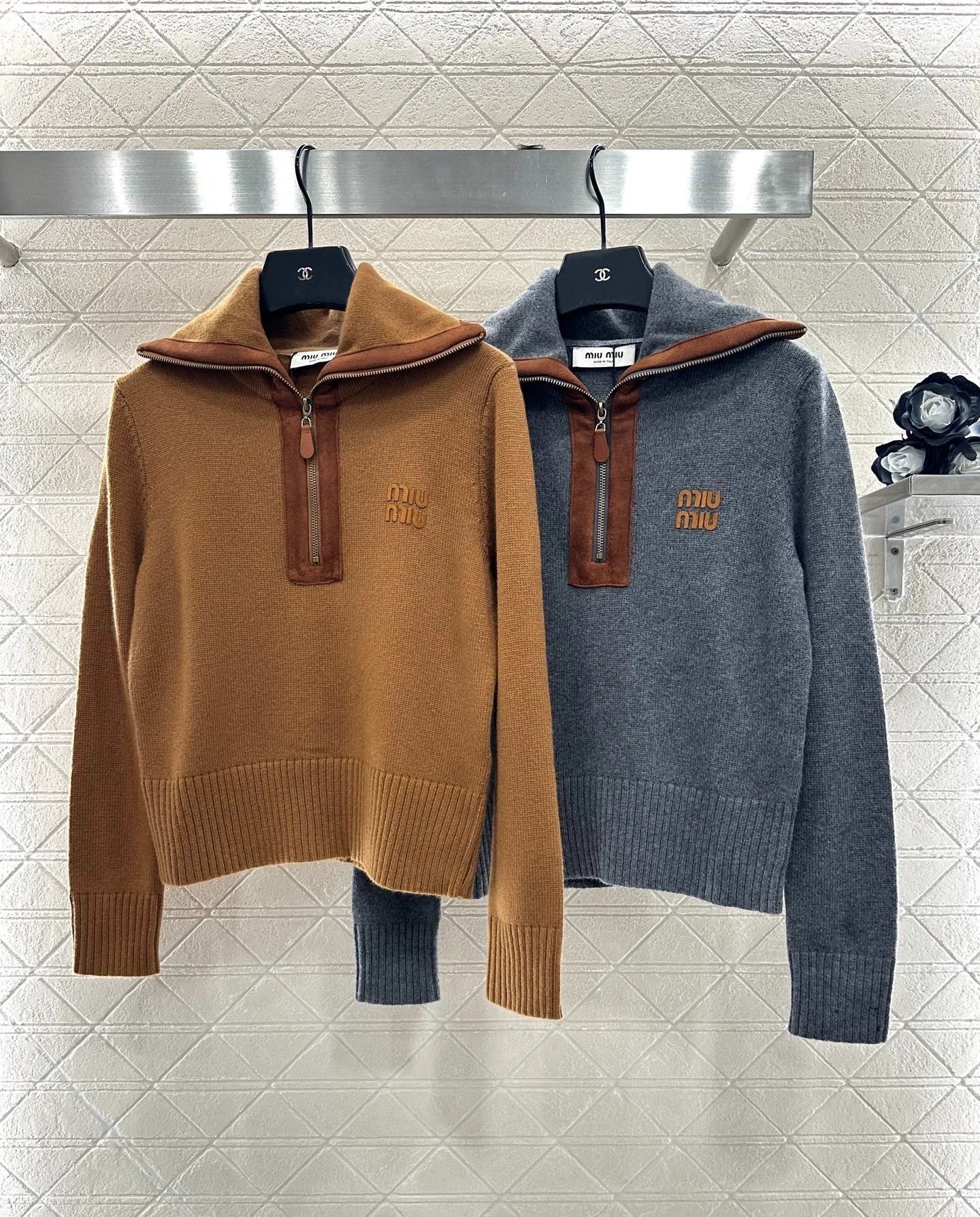 Crafted from cashmere and wool yarn, this sweater has a premium texture and is comfortable and soft. It features a large lapel and shoulder length long sleeved design, with a semi open suede silhouette collar that extends to the front zipper design. The hem and cuffs are lined with vertical grooves, and the cuffs are threaded with elastic edges, highlighting a gentle temperament. The chest letter logo decoration highlights a high-end tone. The regular version does not choose body shape or age, and is a simple and versatile item for daily use in all seasons