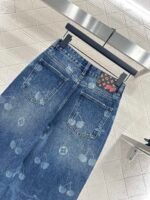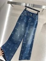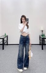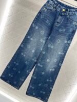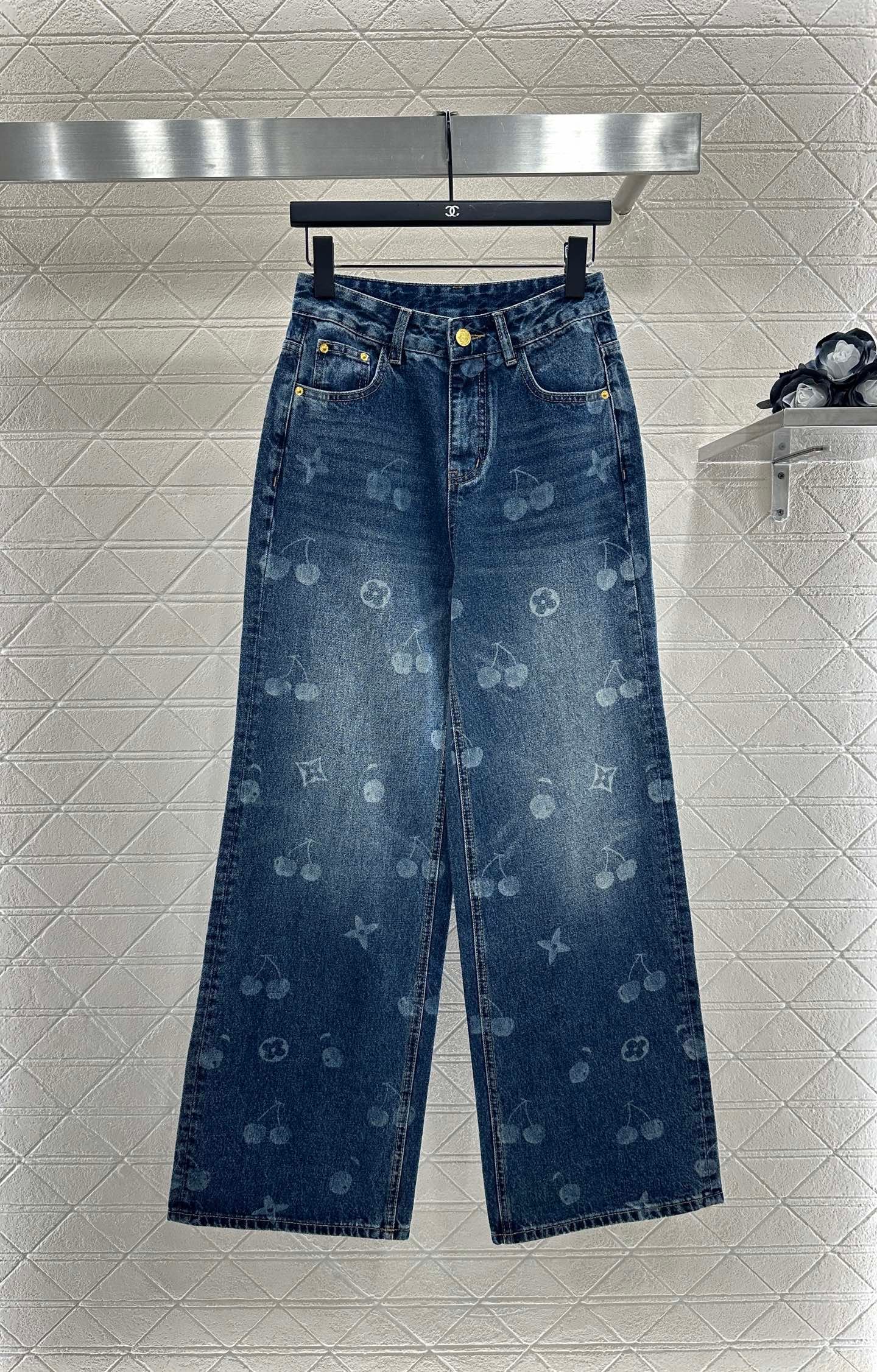 The twill cotton denim material has a comfortable and crisp texture, with a stylish buckle and wide leg pants. The symmetrical pocket design, combined with the four leaf clover element and cherry pattern on the pants legs, exudes a sense of youthfulness and fashion. The back waist is embellished with leather tags, adding design highlights. The high-end western-style wide leg straight tube version modifies the leg shape