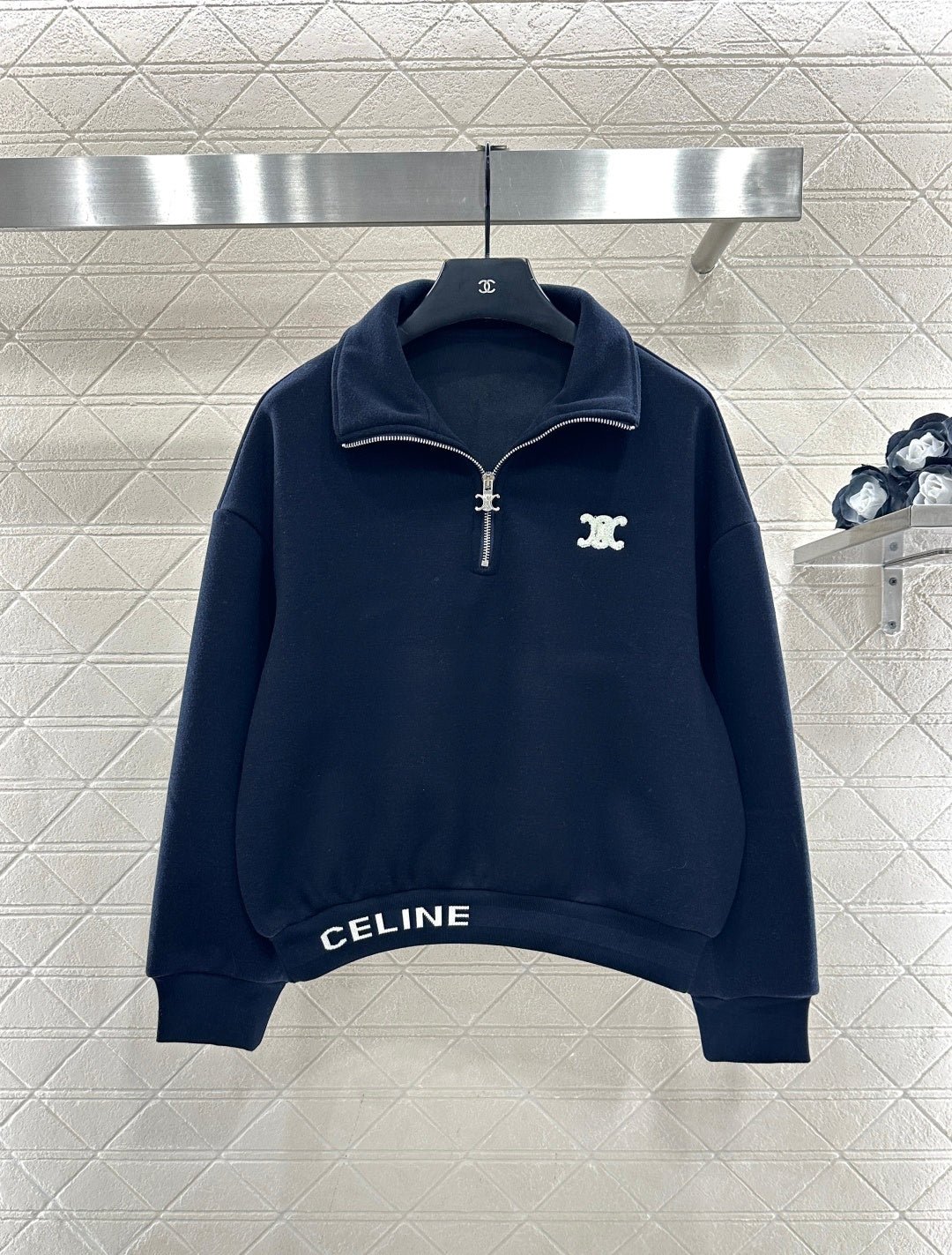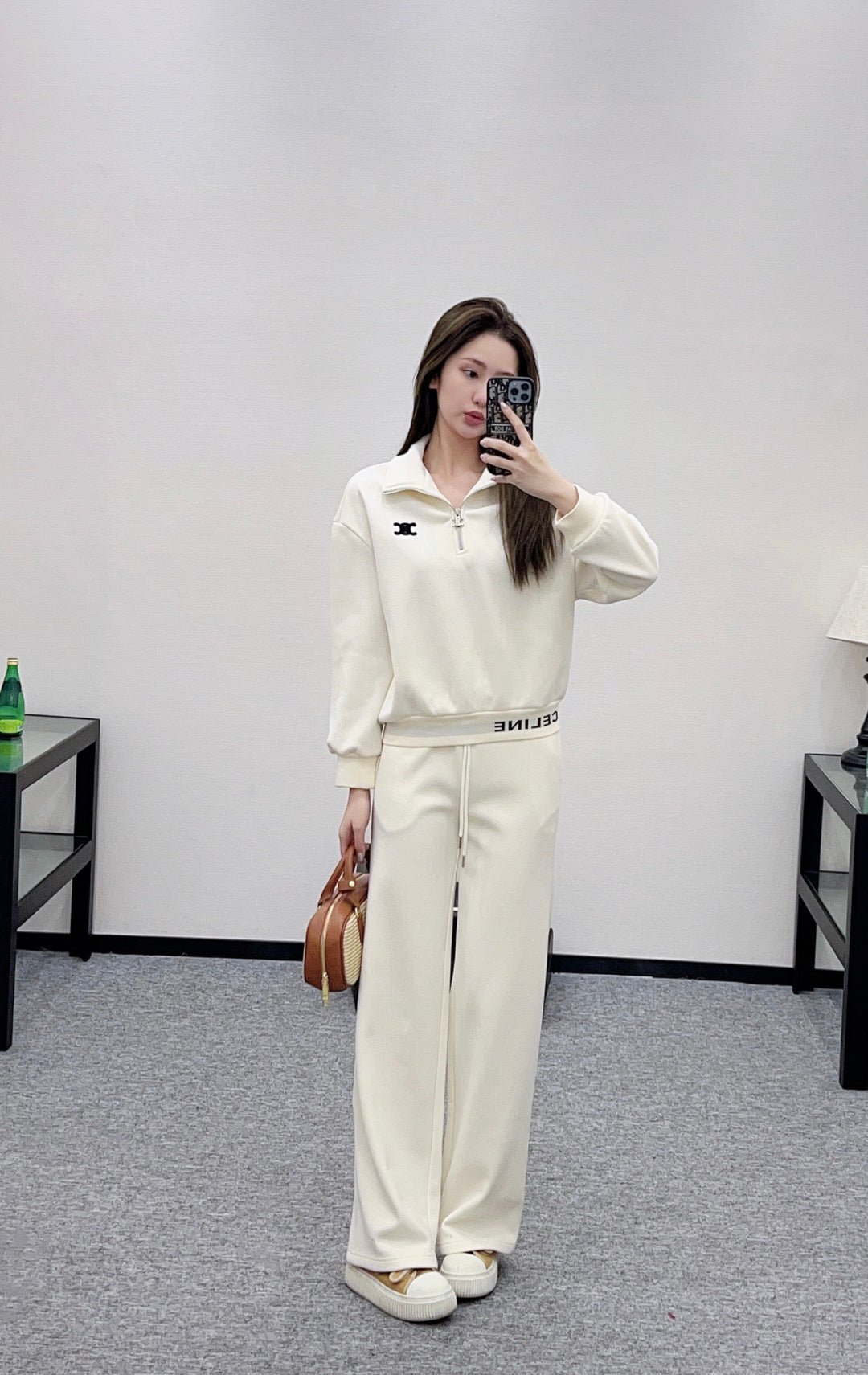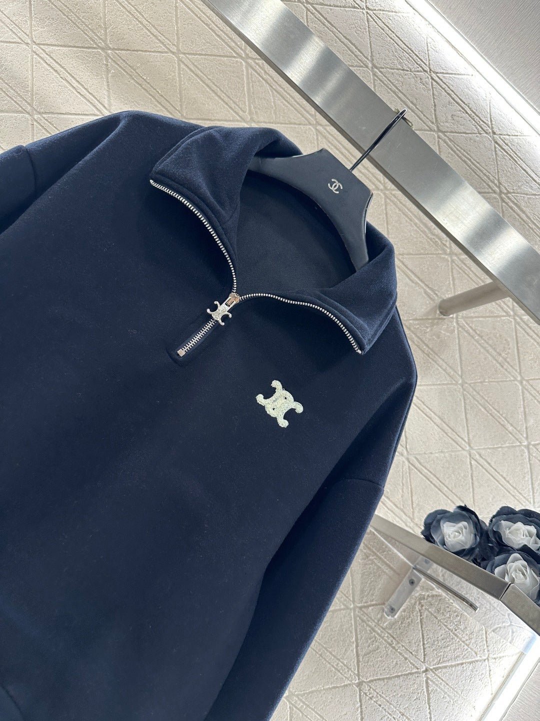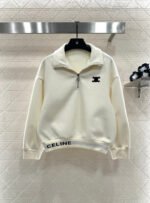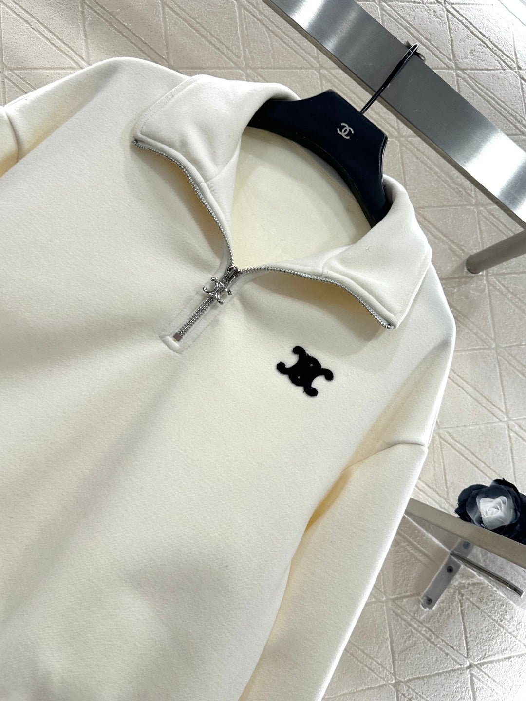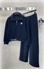 Made from a wool blend, this sweatshirt is soft and skin-friendly, offering a stylish look. The short fleece lining provides extra warmth for autumn and winter. The collared long-sleeved design is fashionable and casual, featuring a half-zip front opening for adjustable style. The logo button and the Arc de Triomphe embroidered logo on one side of the chest complement each other, while the ribbed hem with lettering adds a touch of sophistication. The relaxed fit adds a touch of energy. Pair it with matching wide-leg straight-leg drawstring trousers for a unified and coordinated look. The relaxed silhouette enhances the casual feel, creating a simple yet elegant style. This autumn/winter set is an essential fashion guide for casual and sporty outfits.