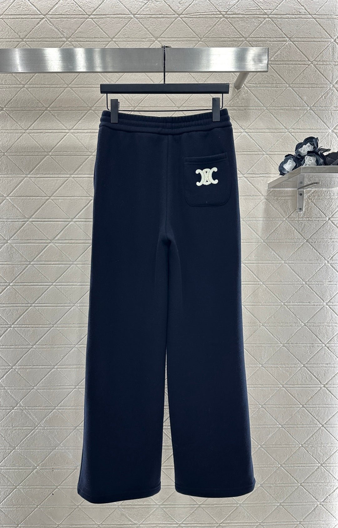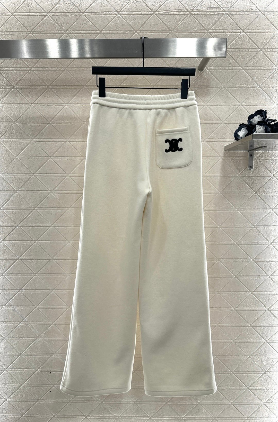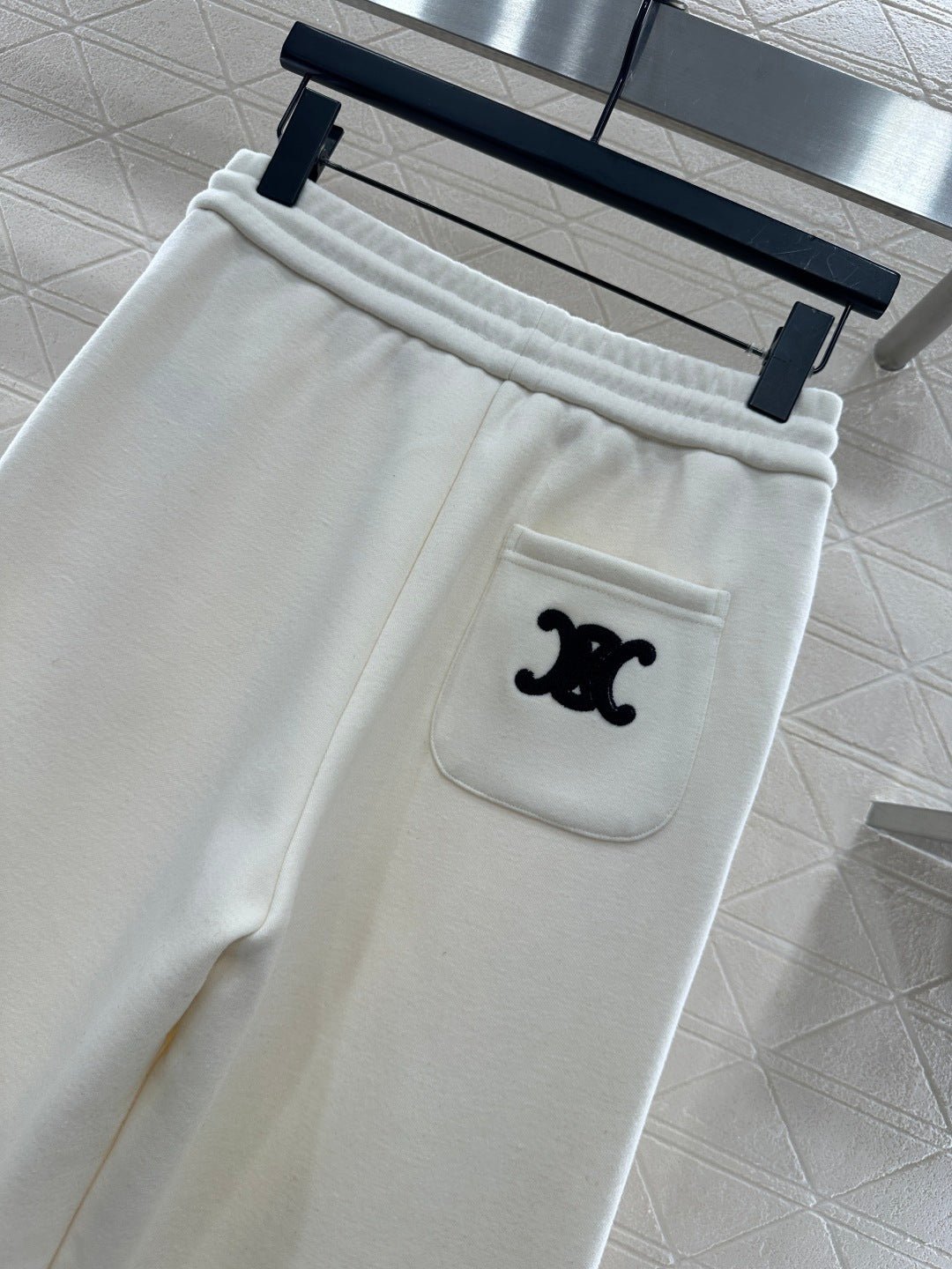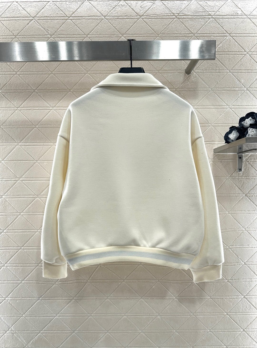 Made from a wool blend, this sweatshirt is soft and skin-friendly, offering a stylish look. The short fleece lining provides extra warmth for autumn and winter. The collared long-sleeved design is fashionable and casual, featuring a half-zip front opening for adjustable style. The logo button and the Arc de Triomphe embroidered logo on one side of the chest complement each other, while the ribbed hem with lettering adds a touch of sophistication. The relaxed fit adds a touch of energy. Pair it with matching wide-leg straight-leg drawstring trousers for a unified and coordinated look. The relaxed silhouette enhances the casual feel, creating a simple yet elegant style. This autumn/winter set is an essential fashion guide for casual and sporty outfits.