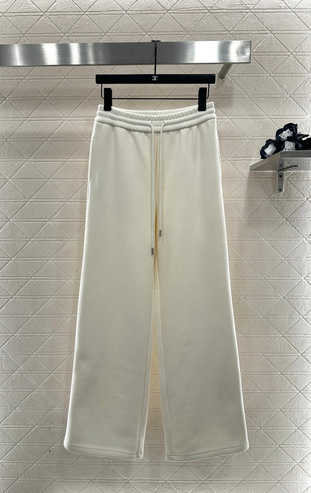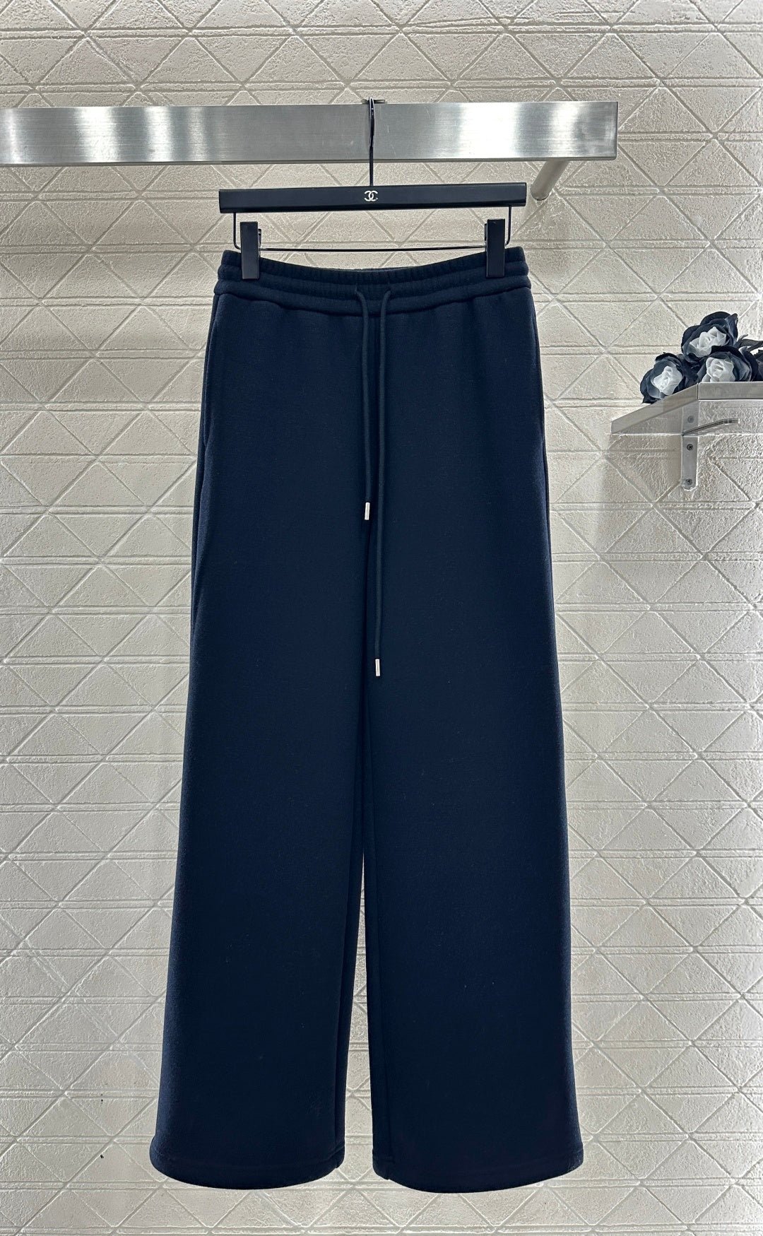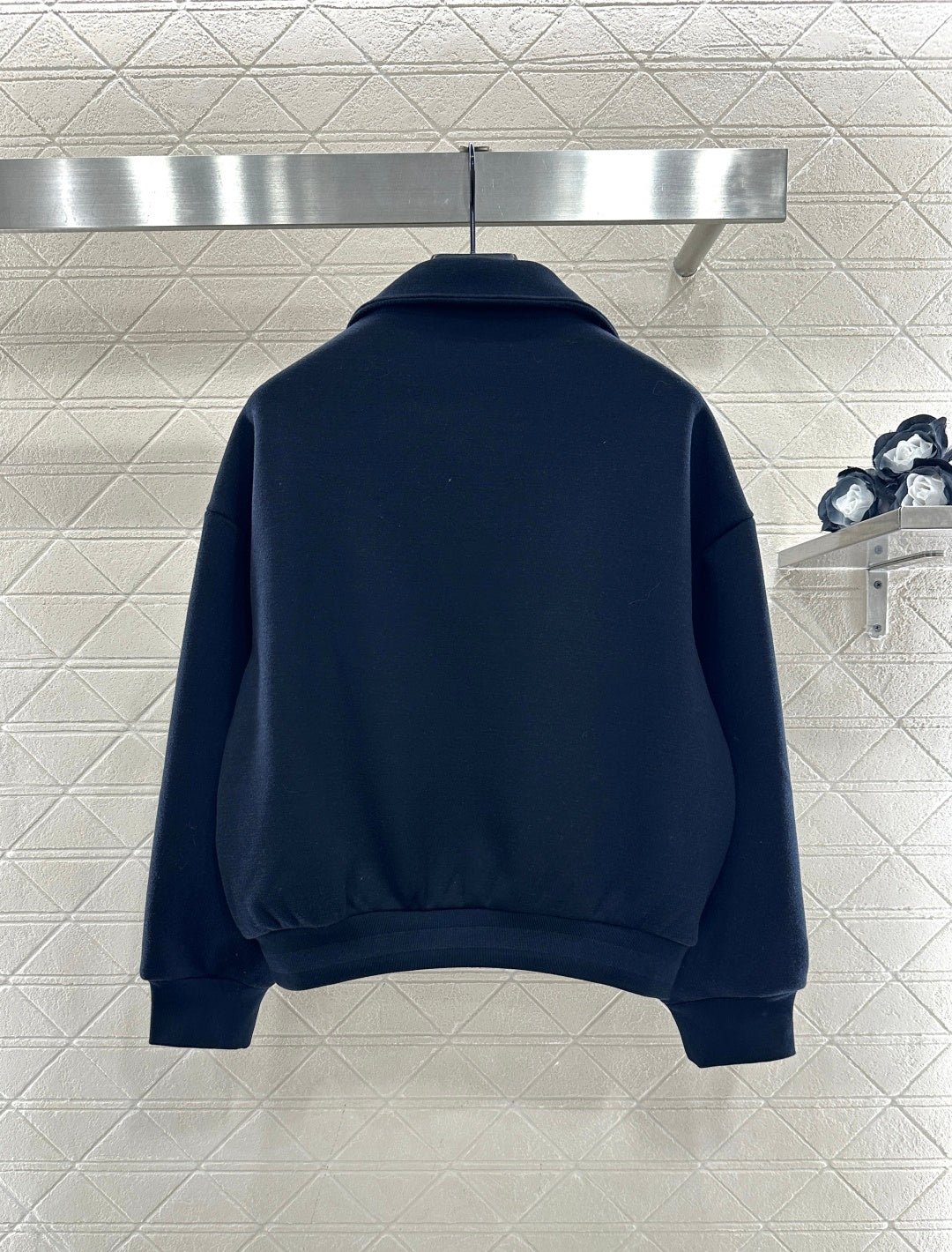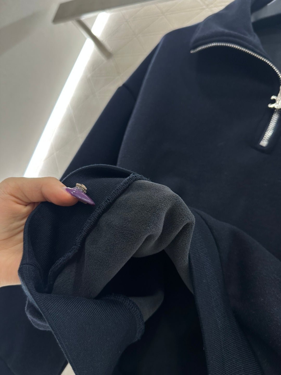Made from a wool blend, this sweatshirt is soft and skin-friendly, offering a stylish look. The short fleece lining provides extra warmth for autumn and winter. The collared long-sleeved design is fashionable and casual, featuring a half-zip front opening for adjustable style. The logo button and the Arc de Triomphe embroidered logo on one side of the chest complement each other, while the ribbed hem with lettering adds a touch of sophistication. The relaxed fit adds a touch of energy. Pair it with matching wide-leg straight-leg drawstring trousers for a unified and coordinated look. The relaxed silhouette enhances the casual feel, creating a simple yet elegant style. This autumn/winter set is an essential fashion guide for casual and sporty outfits.