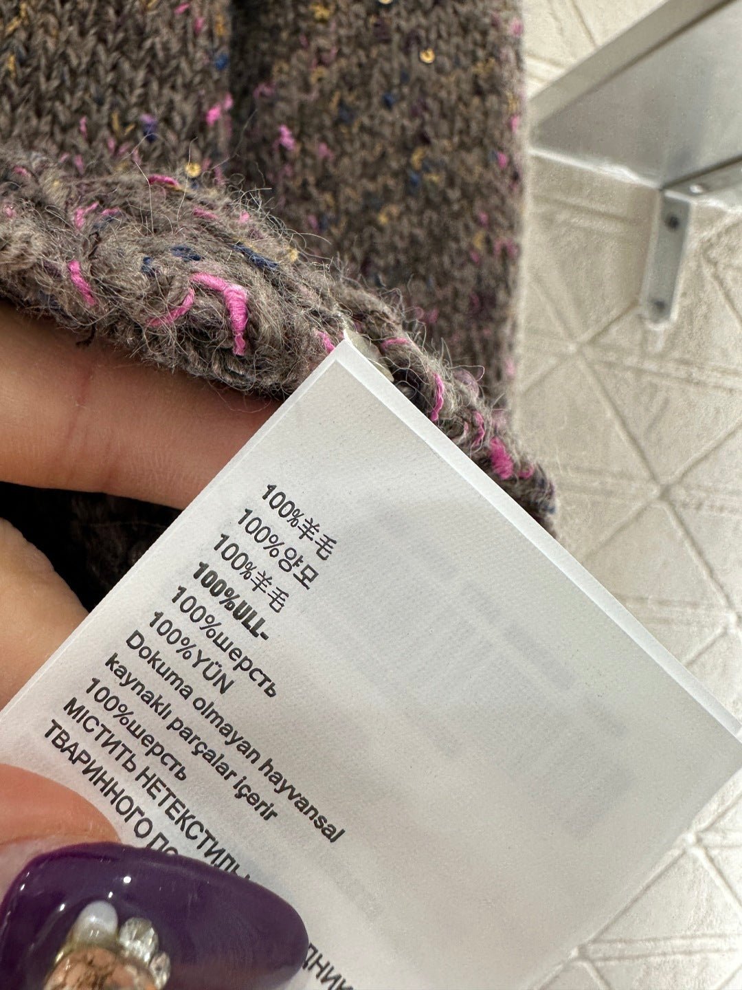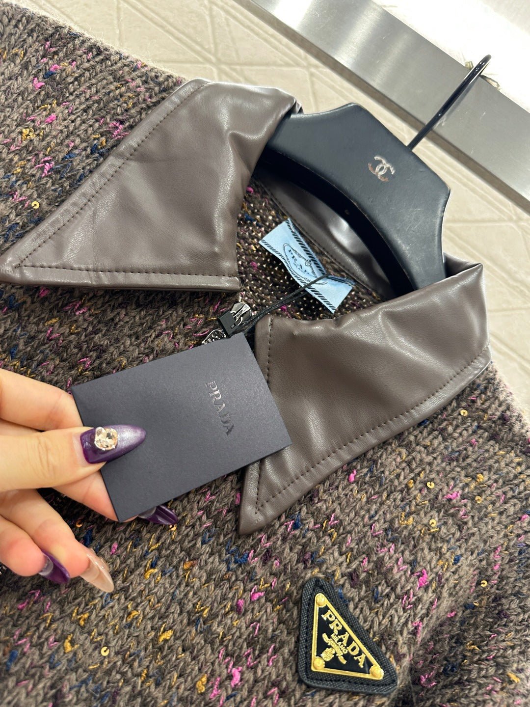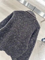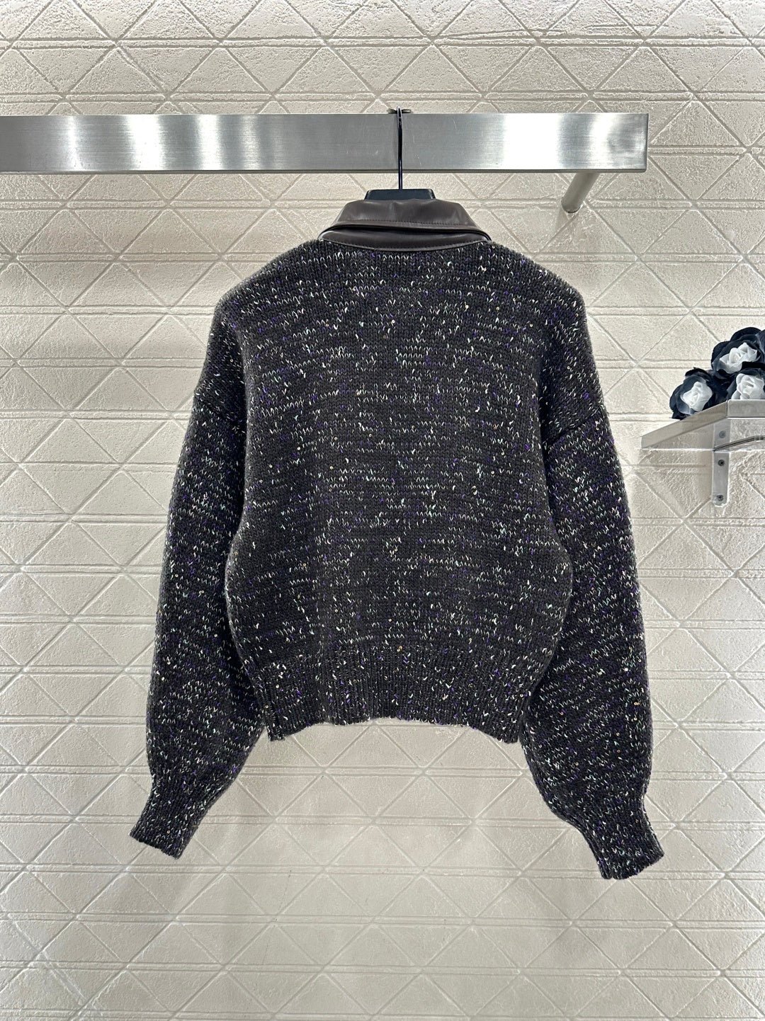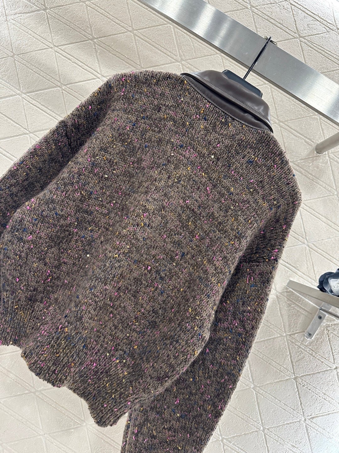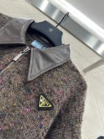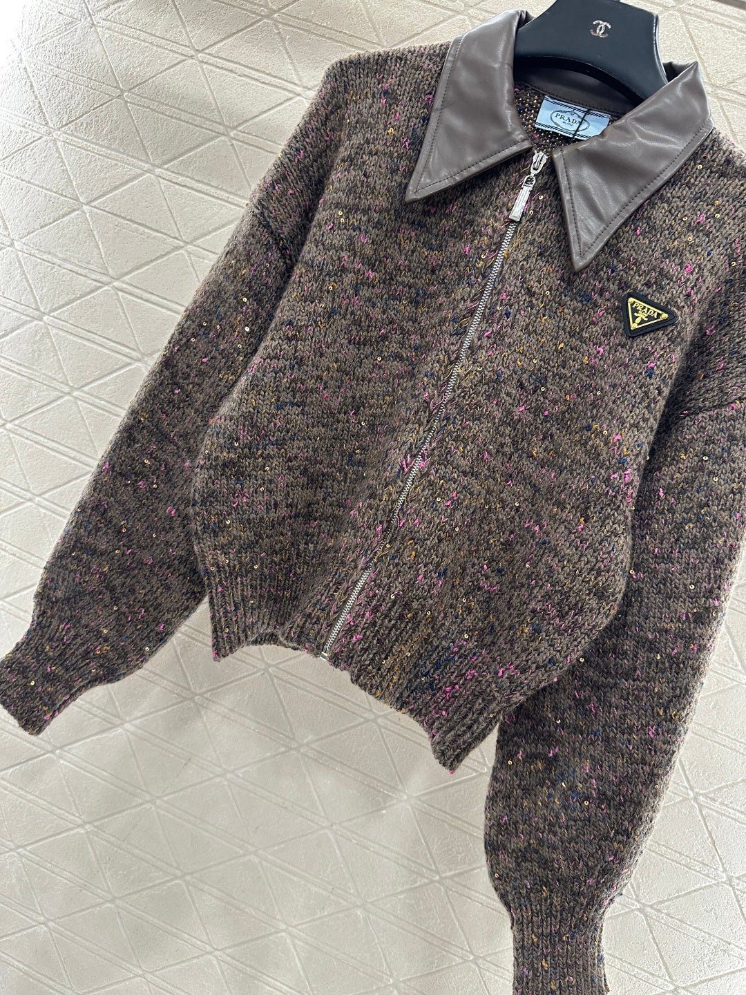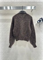 Crafted from wool yarn, this high-quality, soft, and luxurious cardigan features a turn-down collar and a contrasting leather trim. Ribbed edges and colorful yarns interspersed with sequins throughout the body create a sophisticated and refined look. A triangular metal logo adorns the chest, highlighting the brand’s style and adding a touch of chic sophistication. The short, fitted silhouette flatters the figure and offers a relaxed, casual feel.
