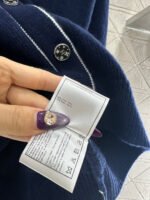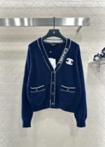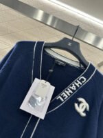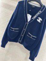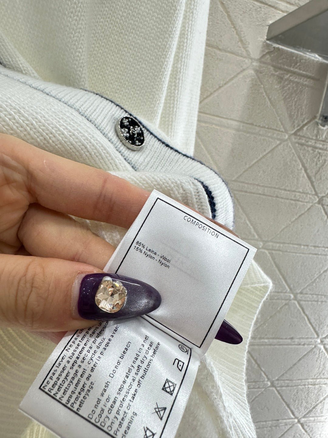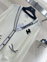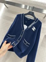 Wool yarn, finely knitted for a soft, comfortable feel against the skin. This V-neck cardigan features a delicate design with round buttons, double C embellishments, pearls, and camellias on the front, complemented by crocheted lettering on the collar and front, and flocked double C embellishments on the chest, enhancing its fashionable appeal.