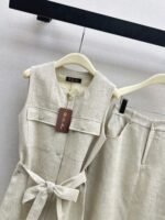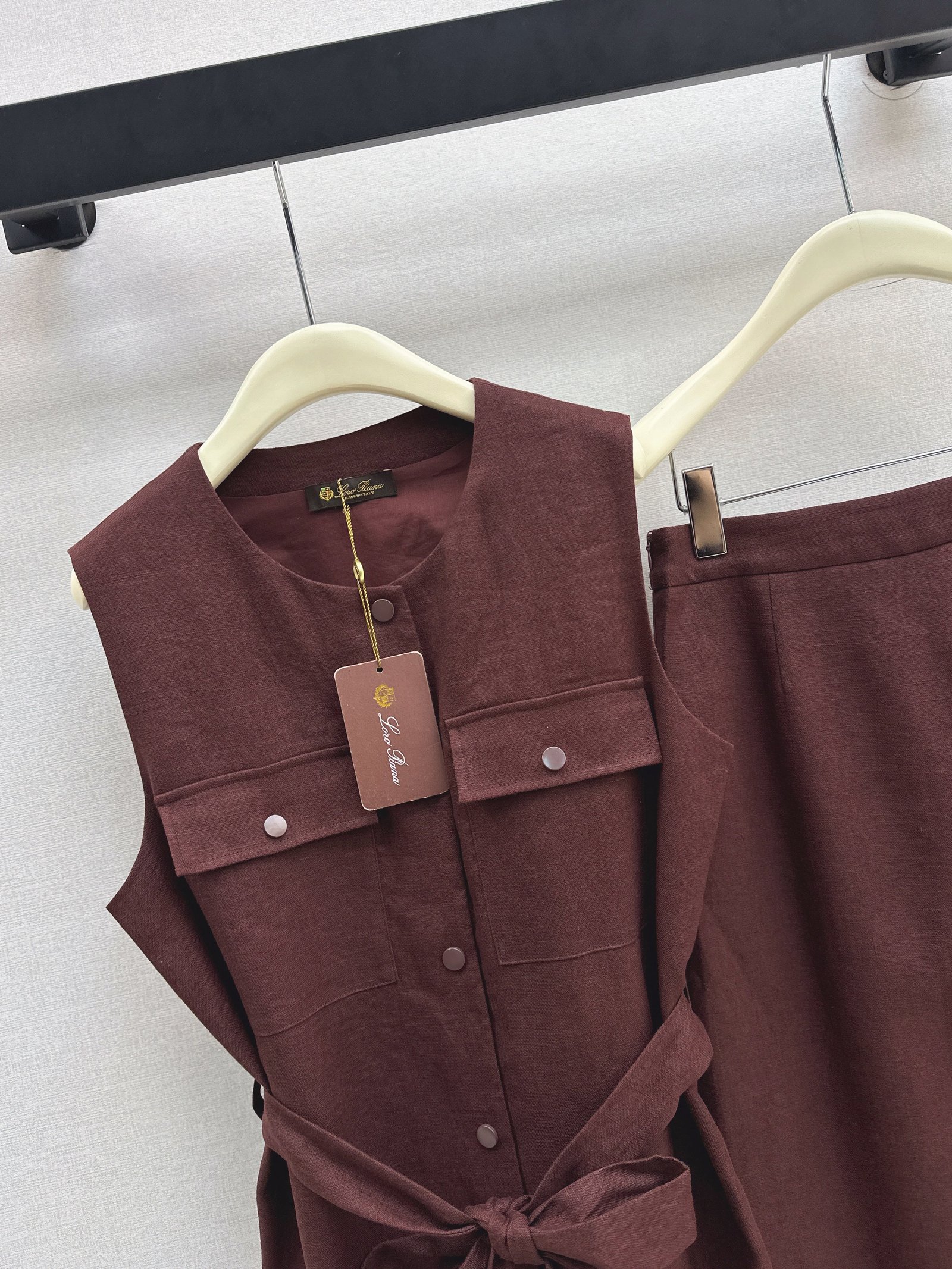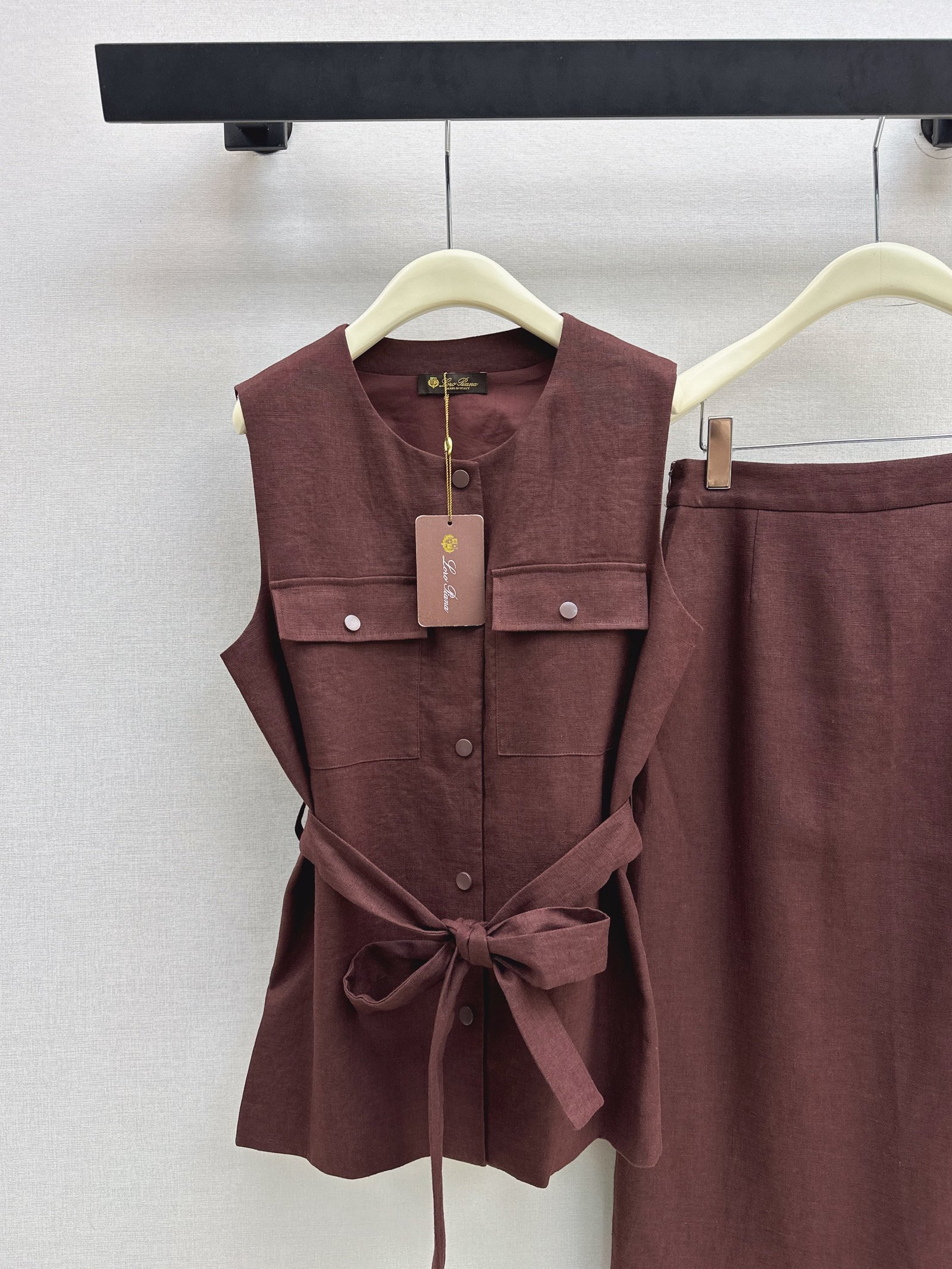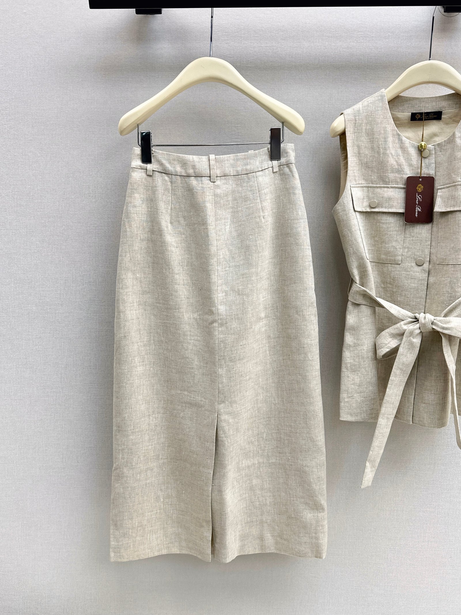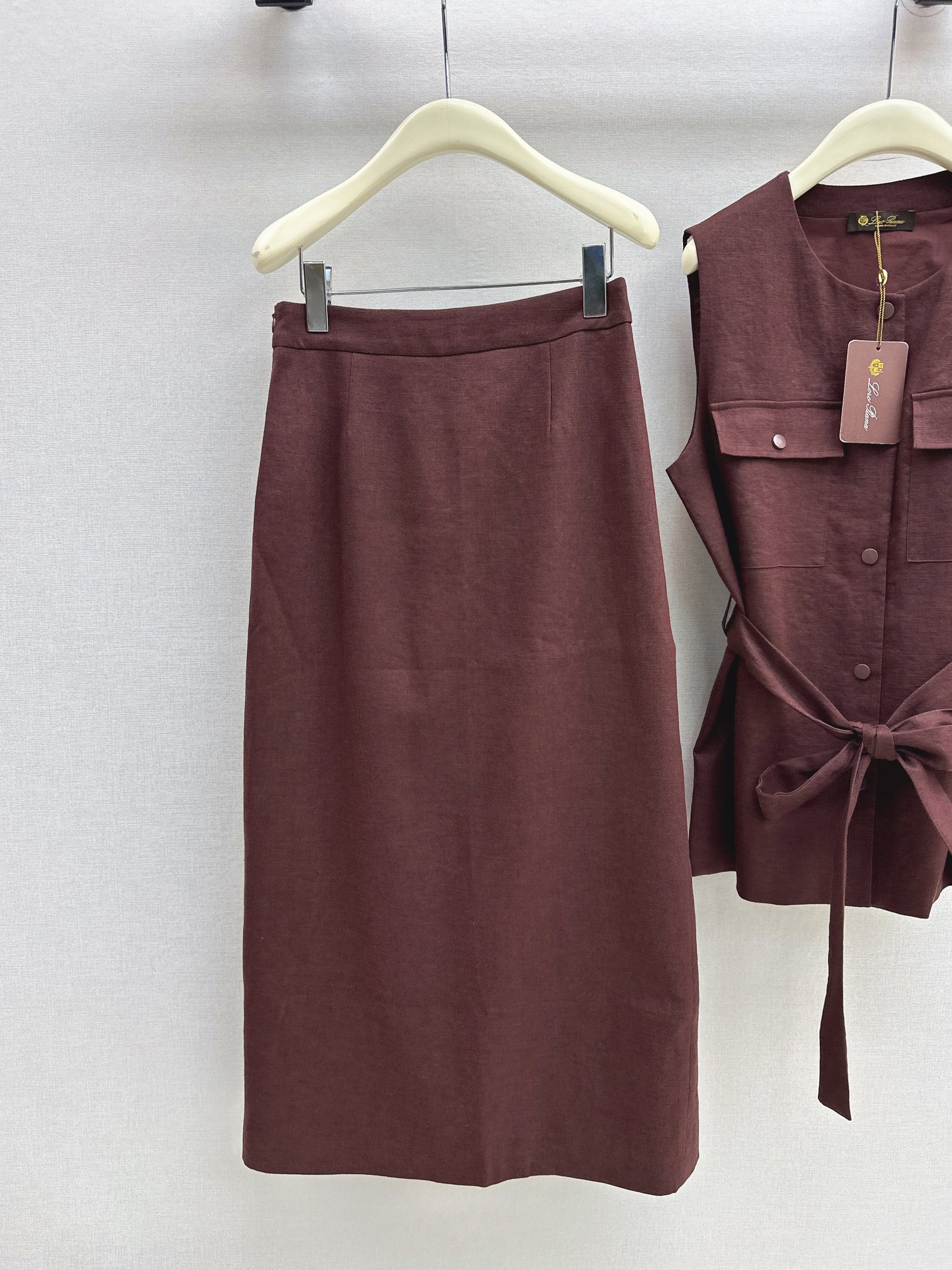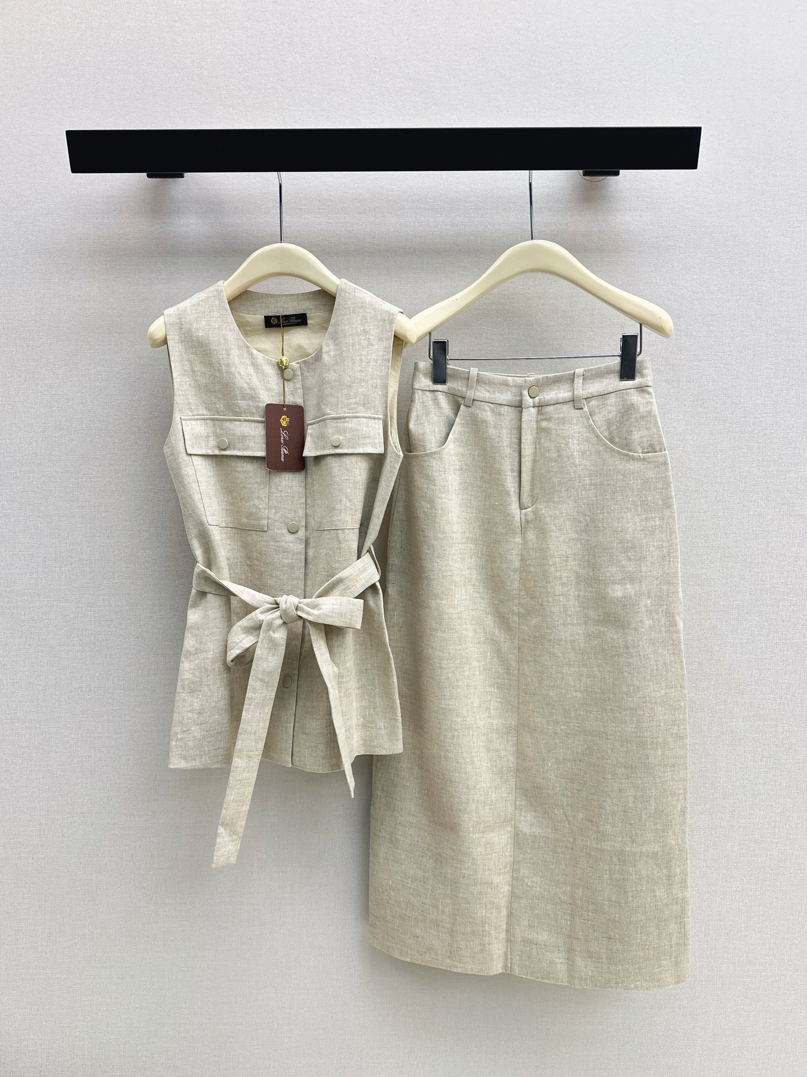 A sleeveless vest with double pocket details paired with a high-waisted skirt. The outfit is slimming and elongating, exuding a gentle and elegant charm. The refined cut is flattering and suits all body types.