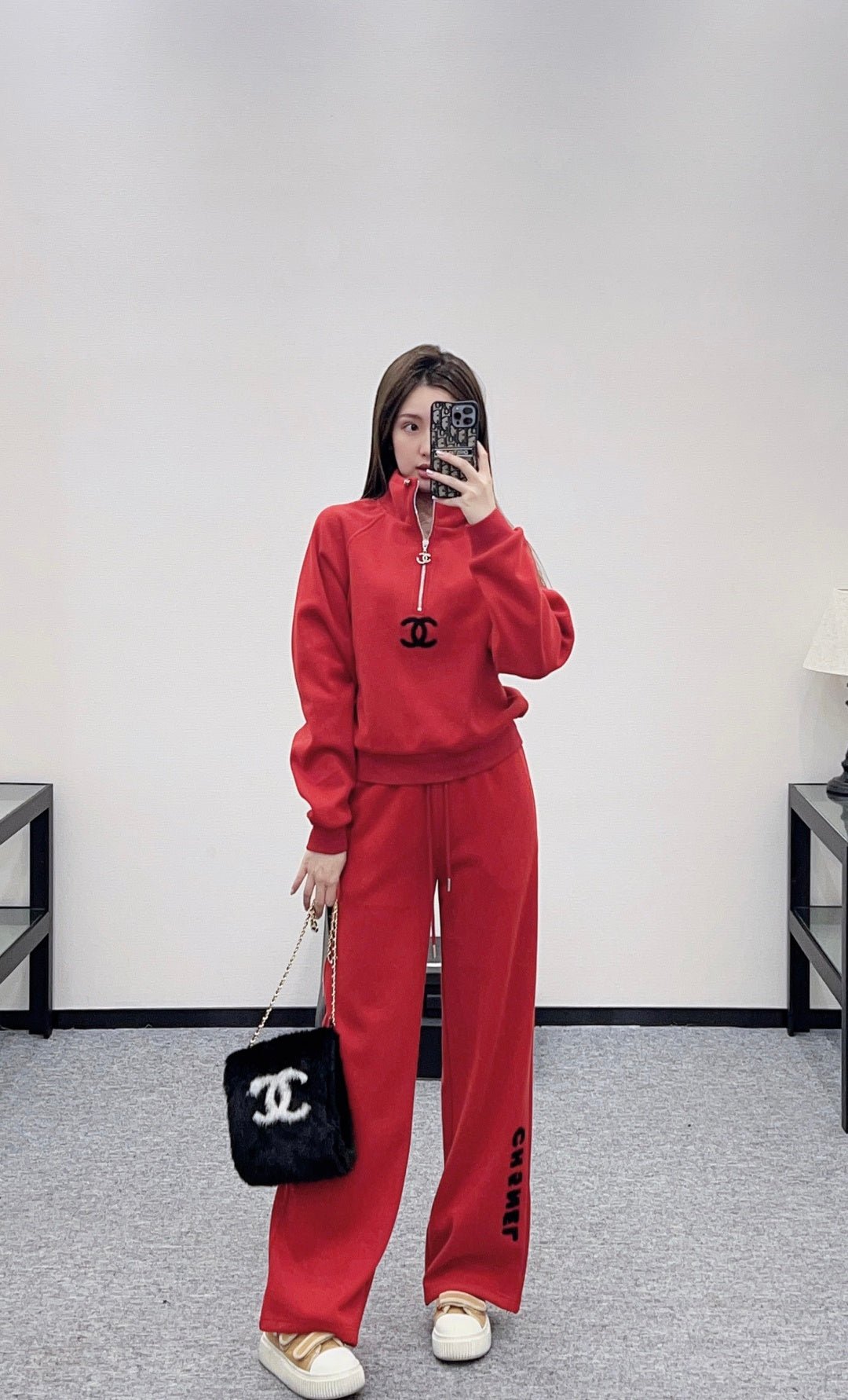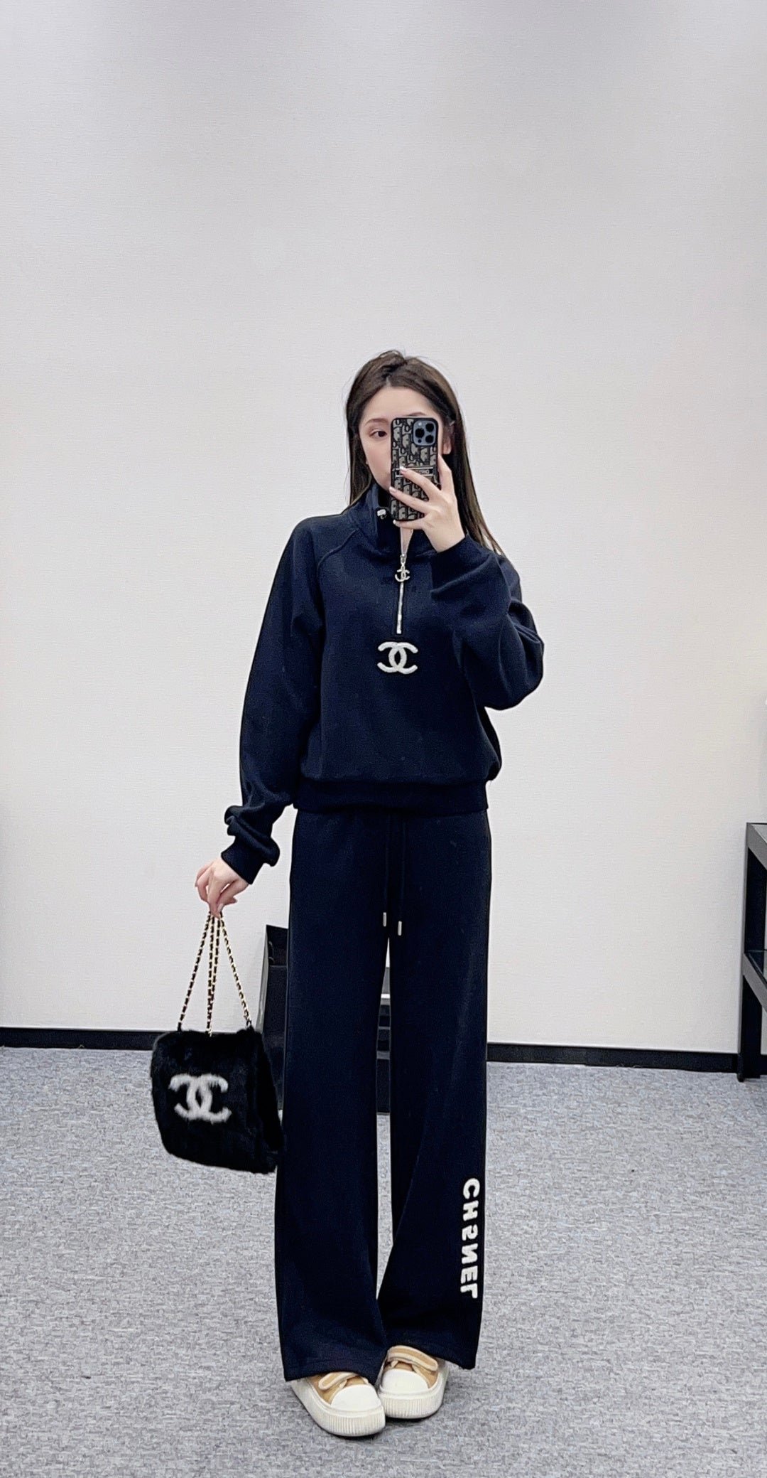 Made of a nylon blend, this sweatshirt is soft and skin-friendly, stylish, and has a noticeable fleece texture for added warmth in autumn and winter. The stand-up collar, drawstring, long-sleeved design offers a fashionable and casual look. The open front with a double C-button zipper allows for adjustable styling and echoes the plush logo on the chest. Ribbed edges add a touch of sophistication, while the relaxed fit enhances its energetic vibe. Pair it with matching wide-leg straight-leg drawstring trousers, featuring a logo detail on one side of the hem for a unified and coordinated look. The relaxed silhouette adds a touch of casual elegance, creating a simple yet sophisticated style. An essential autumn/winter set, this is a fashion guide for casual and sporty outfits.