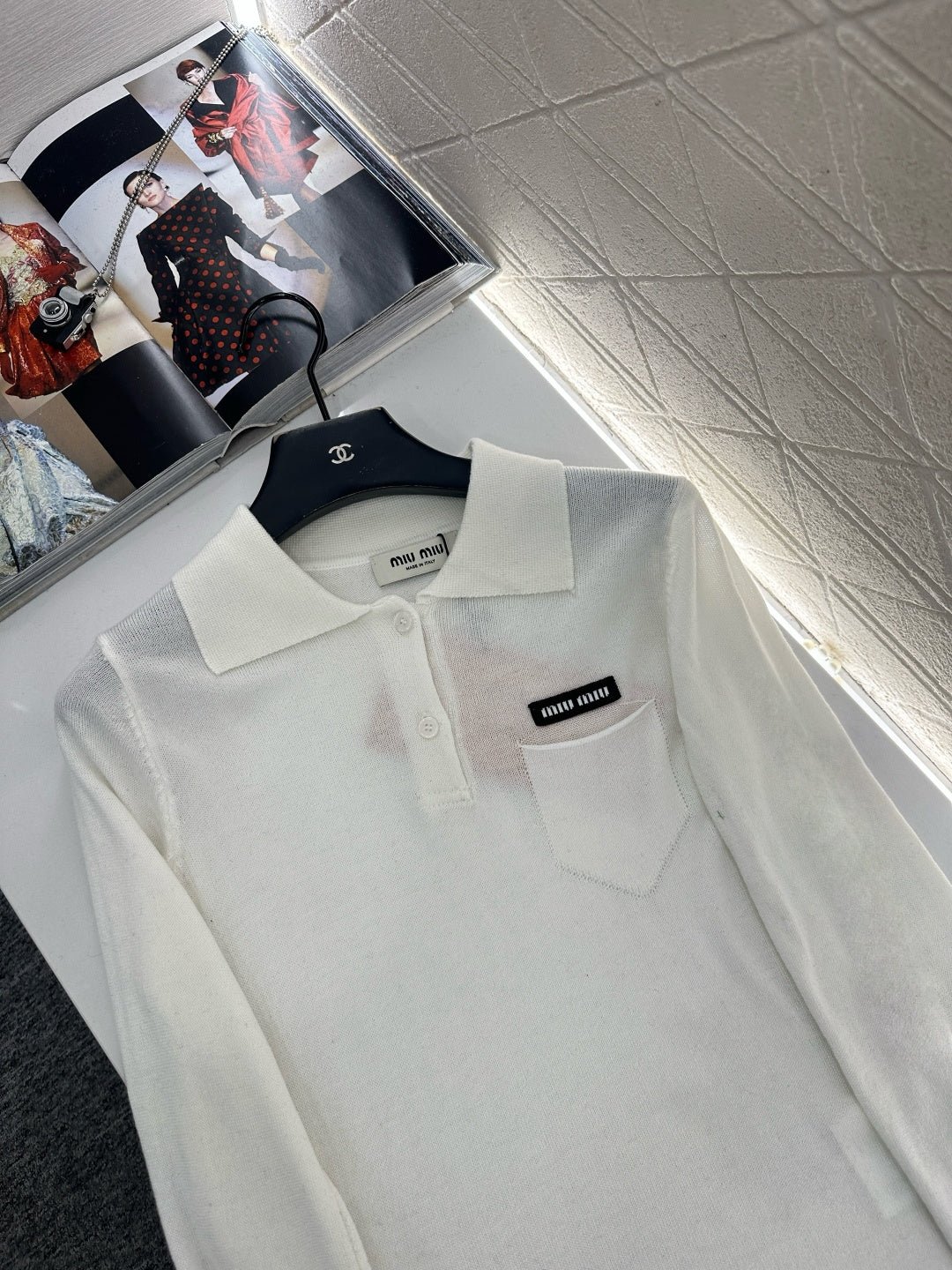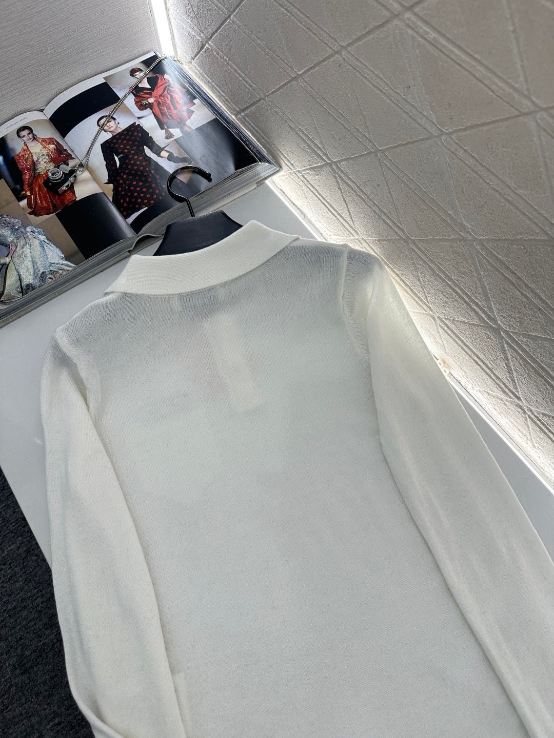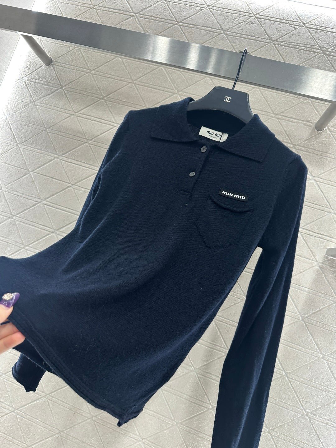 Crafted from wool yarn, this fabric boasts a luxurious feel, offering exceptional comfort and softness. The long-sleeved, collared knit design features a button-down placket and a single chest pocket, effortlessly highlighting its exquisite details. A logo embellishment adds a touch of sophistication and style, making it versatile and easy to match with any outfit. The slightly sheer, stretchy fit accentuates the figure, creating a chic and casual look.