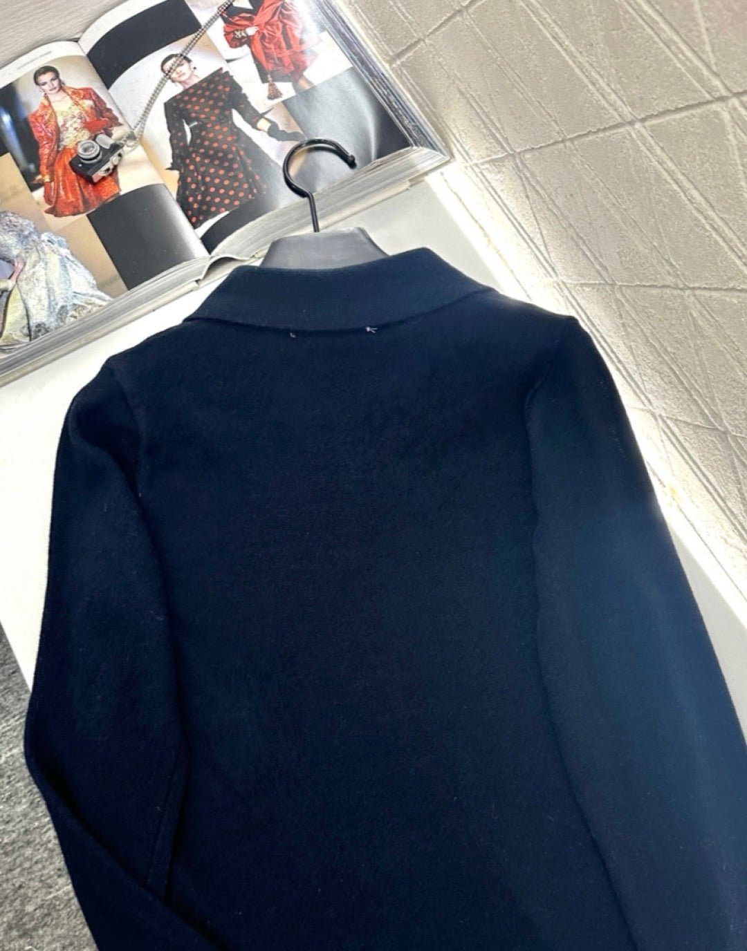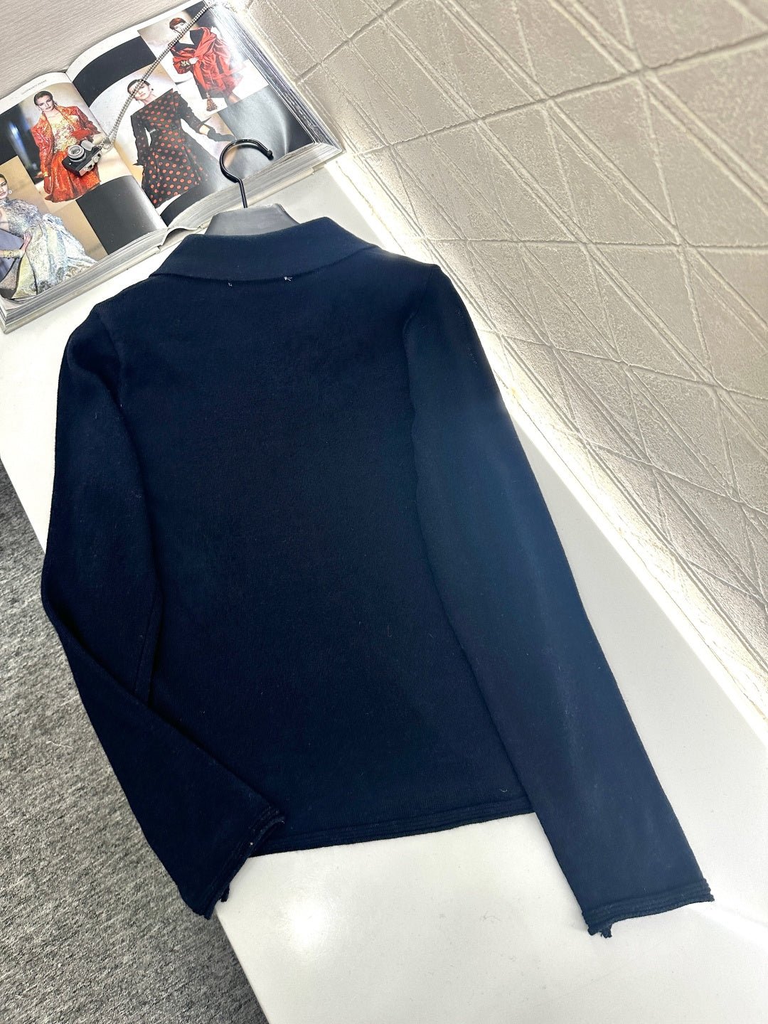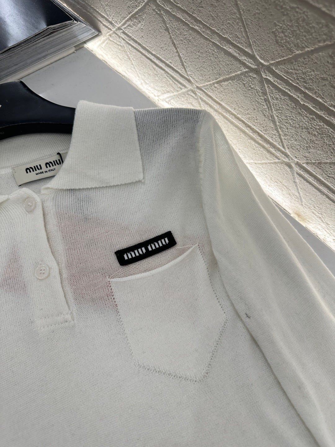 Crafted from wool yarn, this fabric boasts a luxurious feel, offering exceptional comfort and softness. The long-sleeved, collared knit design features a button-down placket and a single chest pocket, effortlessly highlighting its exquisite details. A logo embellishment adds a touch of sophistication and style, making it versatile and easy to match with any outfit. The slightly sheer, stretchy fit accentuates the figure, creating a chic and casual look.