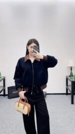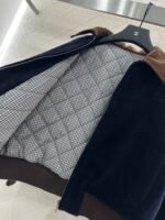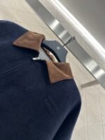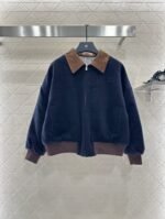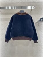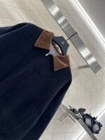 The whole piece is made of cashmere and wool material, with a retro high-end khaki corduroy collar and a large body navy blue, creating a collision of color and fabric design. The inner side of the jacket is filled with diamond grid embossed velvet, and the double-sided large capacity pockets are added to the three-dimensional wearing. The iconic letter decoration on the chest presents the brand concept, elastic thread details, and warm body. It is lightweight and fashionable for autumn and winter, paired with jeans and casual pants, both of which are very warm and fashionable