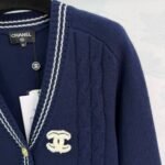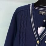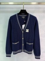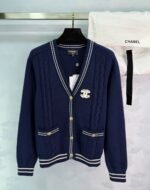 Classic V-neck with white striped trim, simple yet distinctive. Double front pockets and gold buttons add a touch of detail! The double C embroidery on the left chest exudes brand prestige. The soft and comfortable knit fabric makes it easy to pair with shirts or dresses for everyday wear, whether commuting or casual.