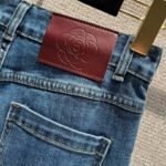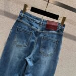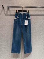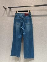 Made from distressed denim fabric with pearl and rhinestone woven details on the pockets, the vintage blue hue exudes a sophisticated, timeless charm. Soft and comfortable against the skin yet retaining its shape, the high-waisted, wide-leg cut cleverly elongates the legs, flattering all leg types and effortlessly creating a sophisticated look for every occasion.