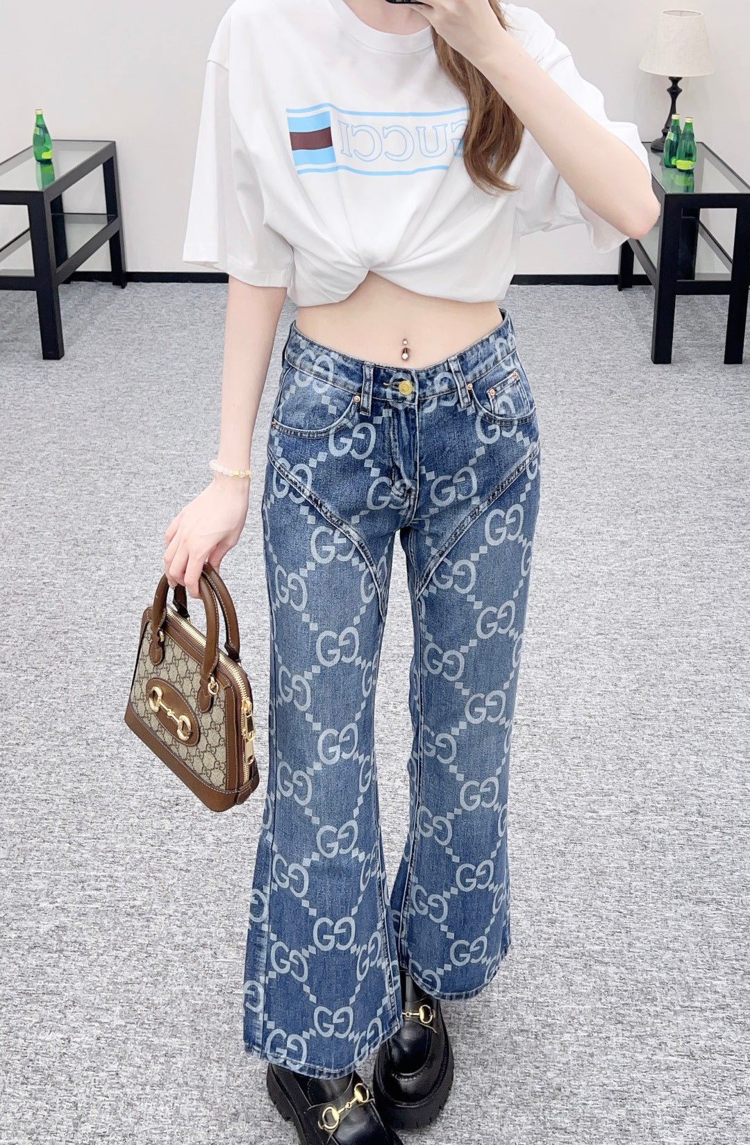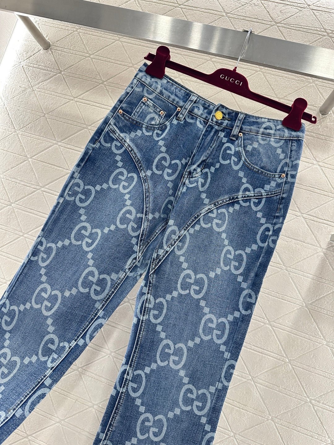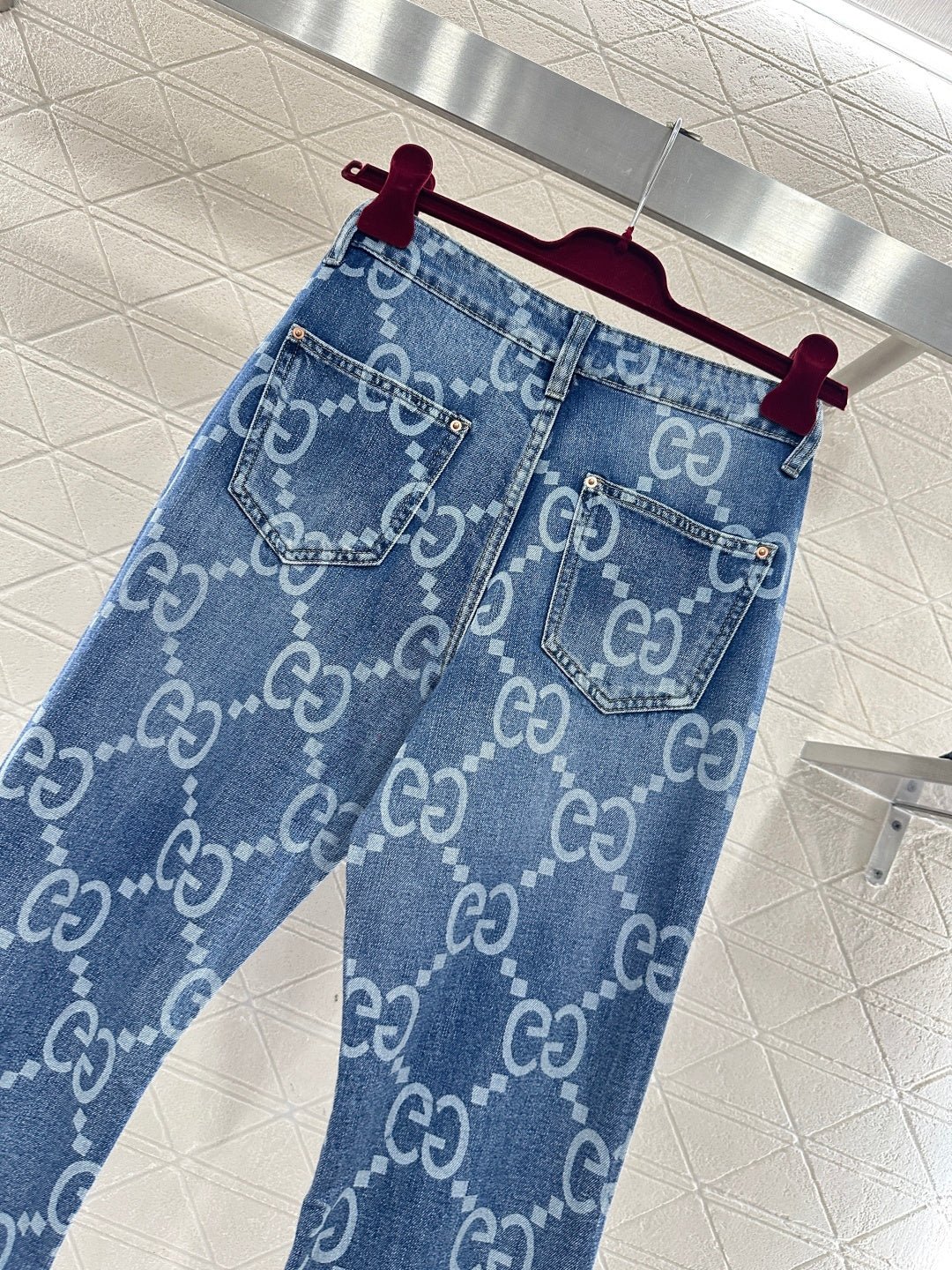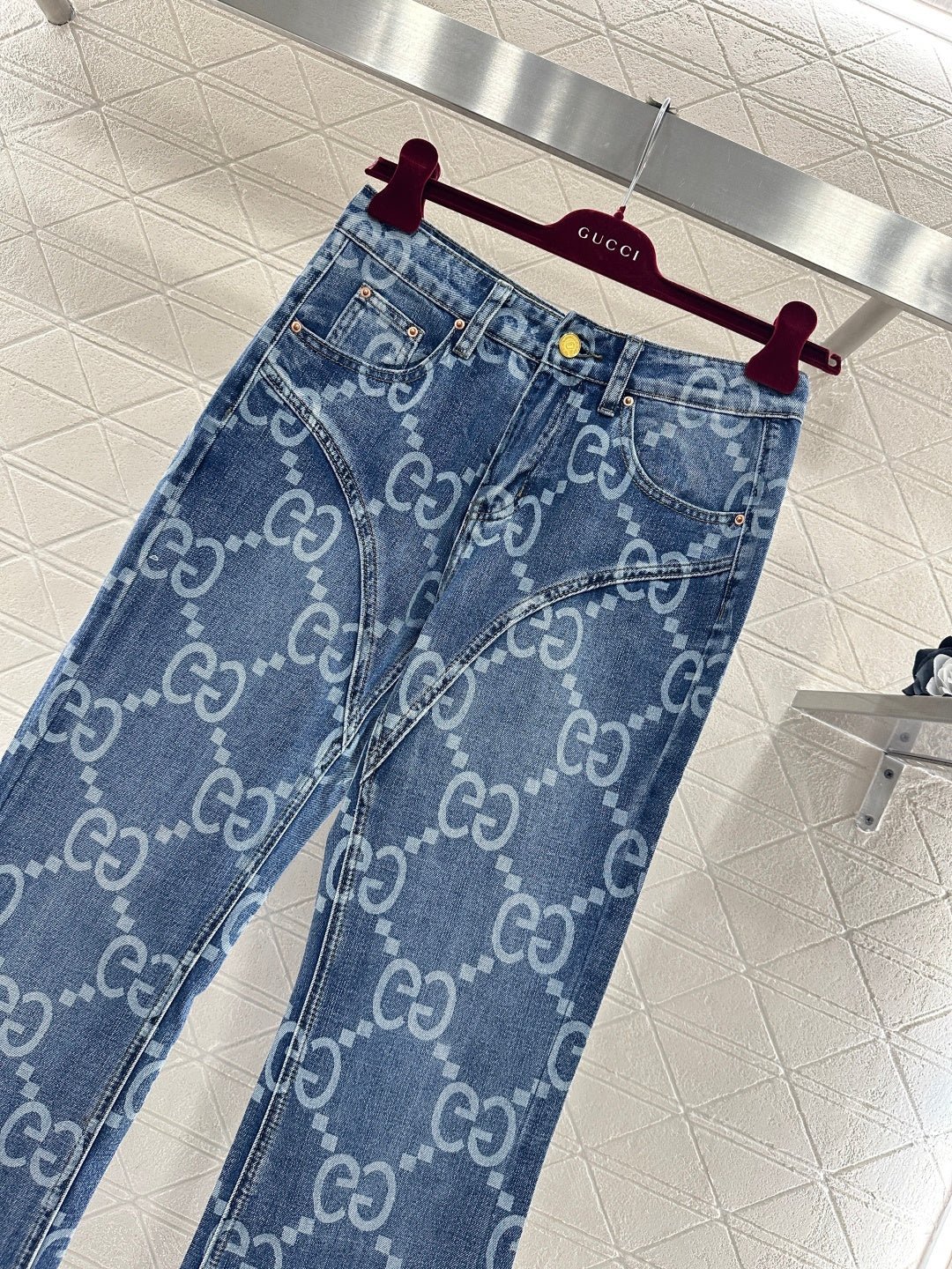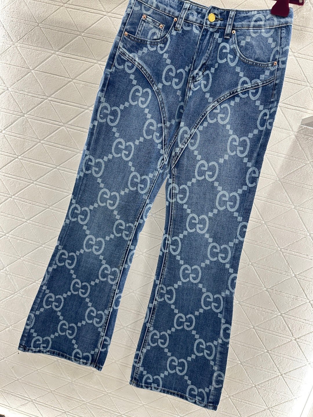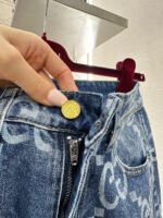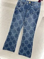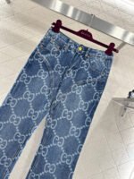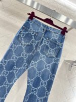 Made of twill cotton denim, this jeans feature multiple washes and a naturally distressed finish, giving them a retro and chic look. The high-waisted, slim-fit, slightly flared design incorporates a laser-printed double-G logo pattern with a diamond pattern throughout. The four-pointed star silhouette at the crotch and thigh further enhances the leg shape. These jeans are versatile and stylish, suitable for all seasons.