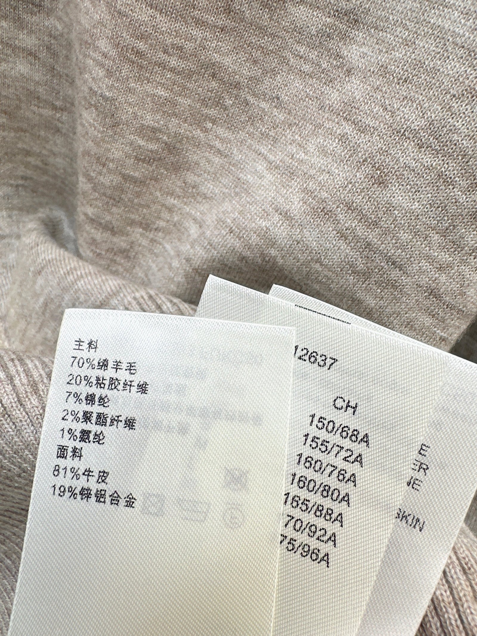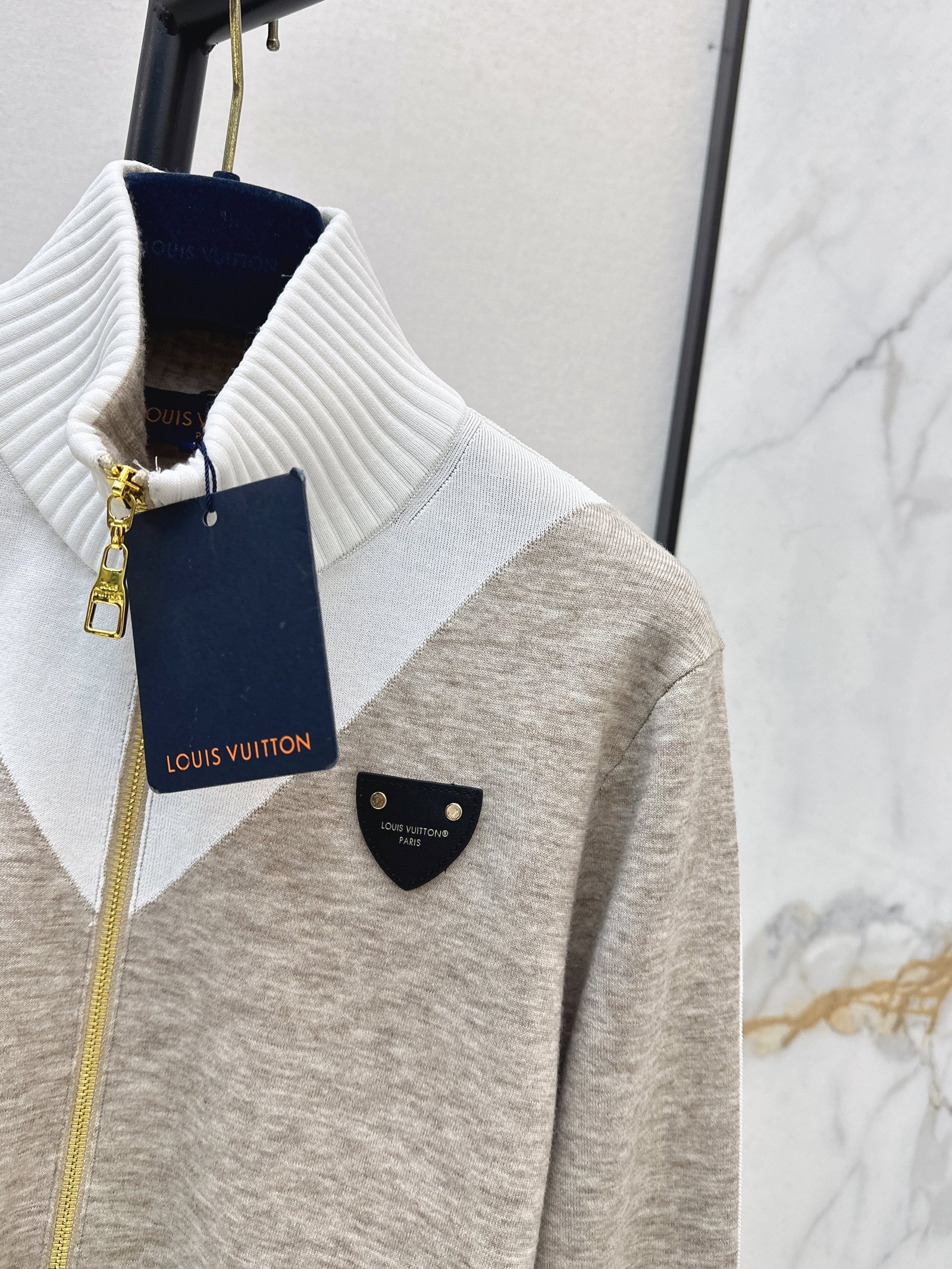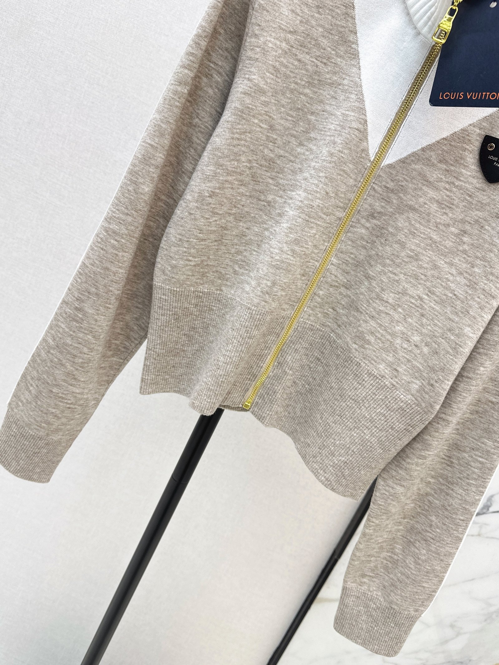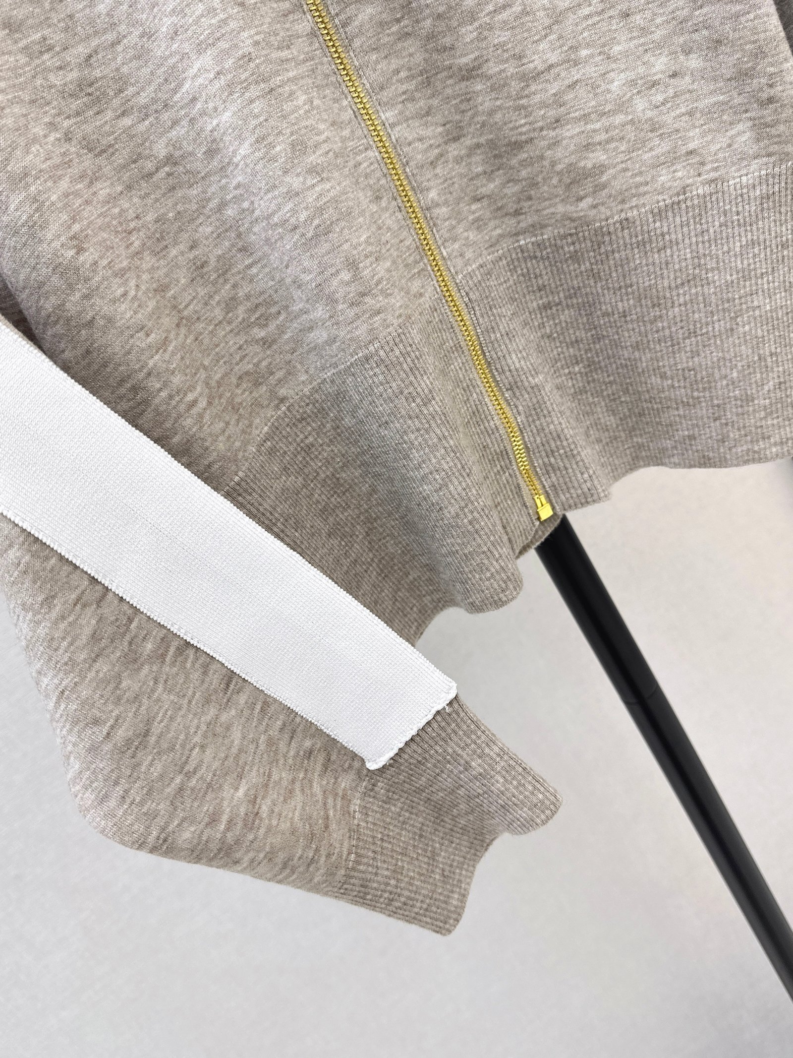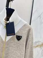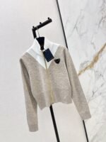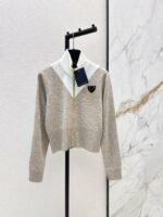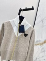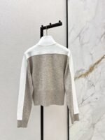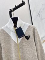 Stand-up collar zip-up jacket with a triangular brand logo and cowhide leather patch on the chest, exuding a high-end feel. The off-white color-block design gives it a youthful vibe. Made from an exclusive custom-made imported YB sheep wool blend, the casual jacket style is flattering on all body types and exudes a sophisticated look. The hardware features a brand logo stamp; the attention to detail is impeccable.