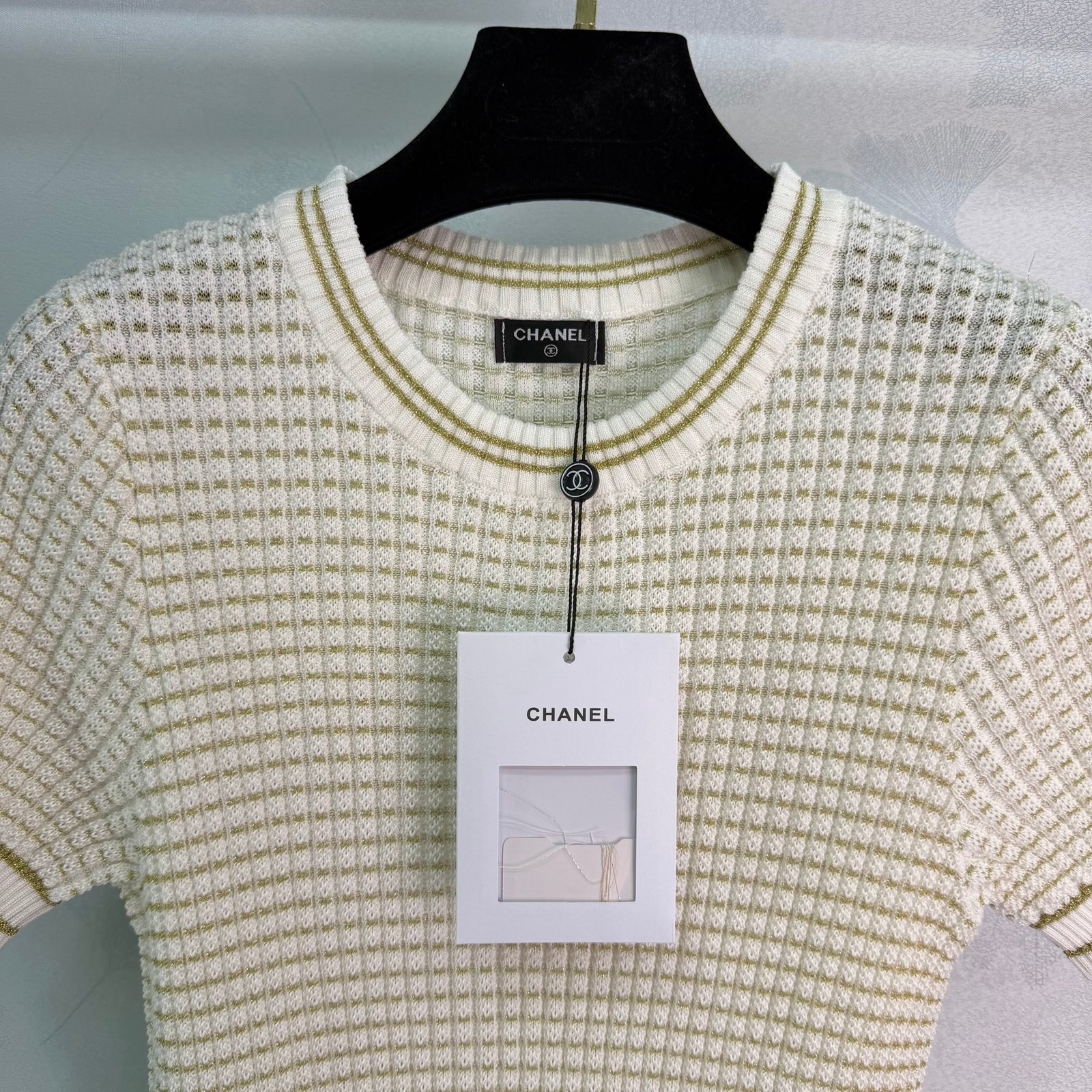 Made from wool yarn, soft and skin-friendly, comfortable and stylish. The round neck and short sleeves feature the brand’s signature double-C logo at the hem, showcasing the brand’s identity. The overall striped color-blocking design adds a strong retro feel. Ribbed edges add depth and dimension. The stretchy fit flatters the figure, creating a playful, youthful, and brightening effect. The relaxed style exudes understated luxury and chic sophistication