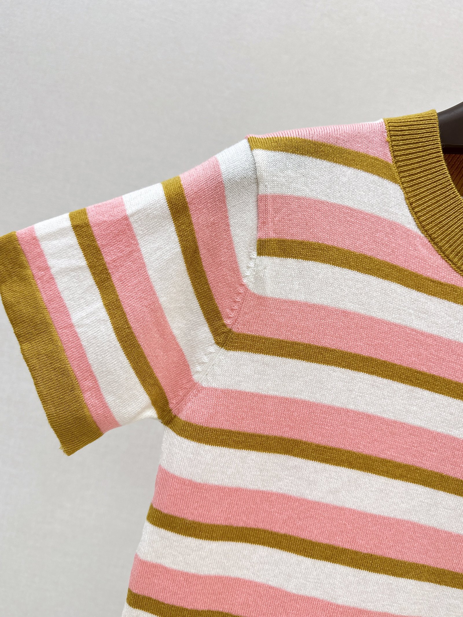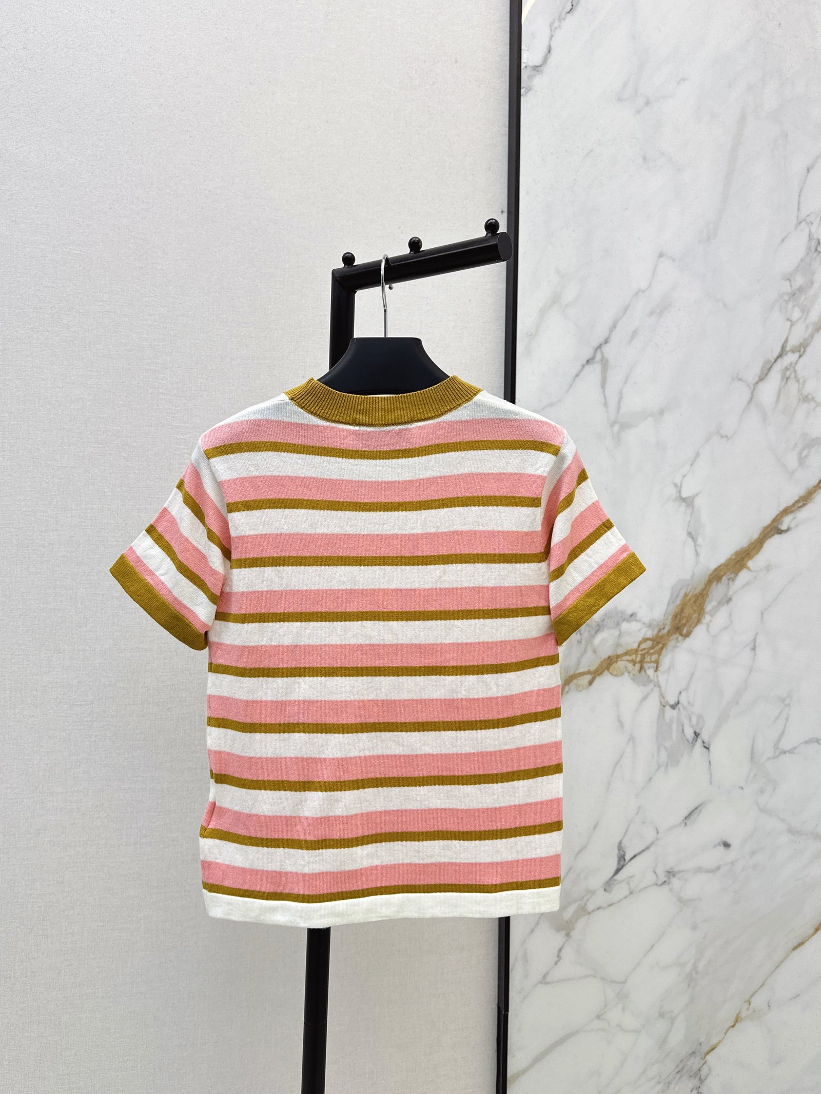A very refreshing color scheme~ The color-blocked striped design is simple yet distinctive. The logo badge on the chest adds a touch of brand identity. The knit fabric is stretchy and comfortable against the skin. It’s perfect for wearing alone in summer or pairing with jeans or skirts. Easy to style for everyday wear, whether for commuting or casual occasions. Stylish and versatile!