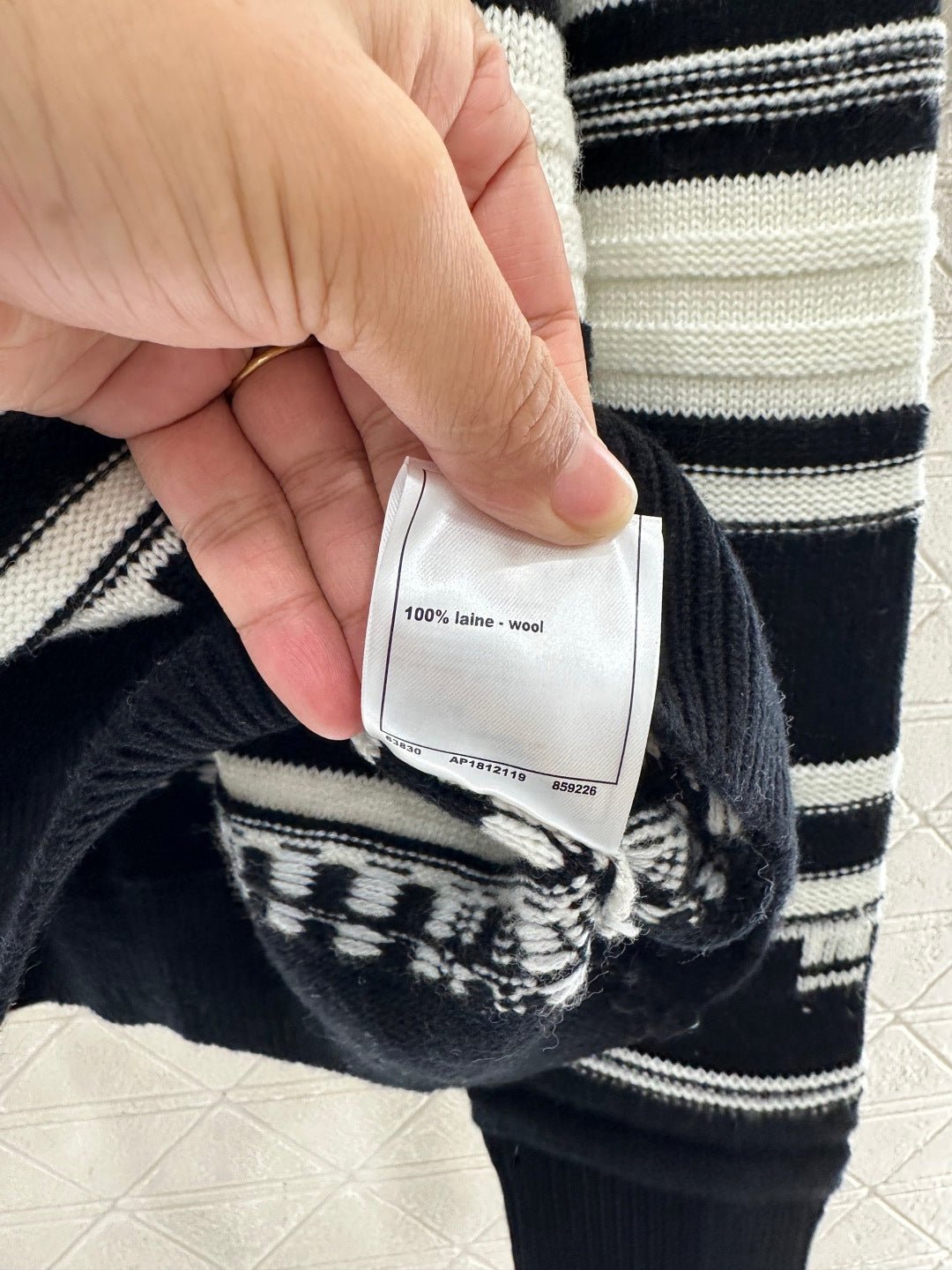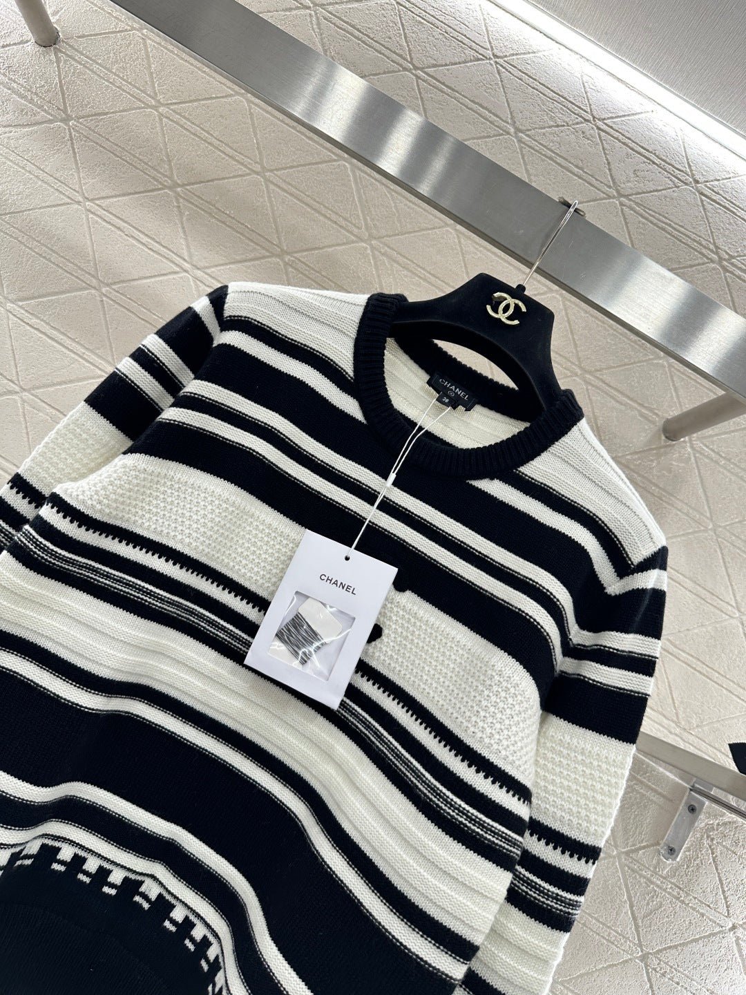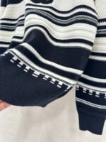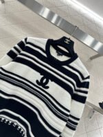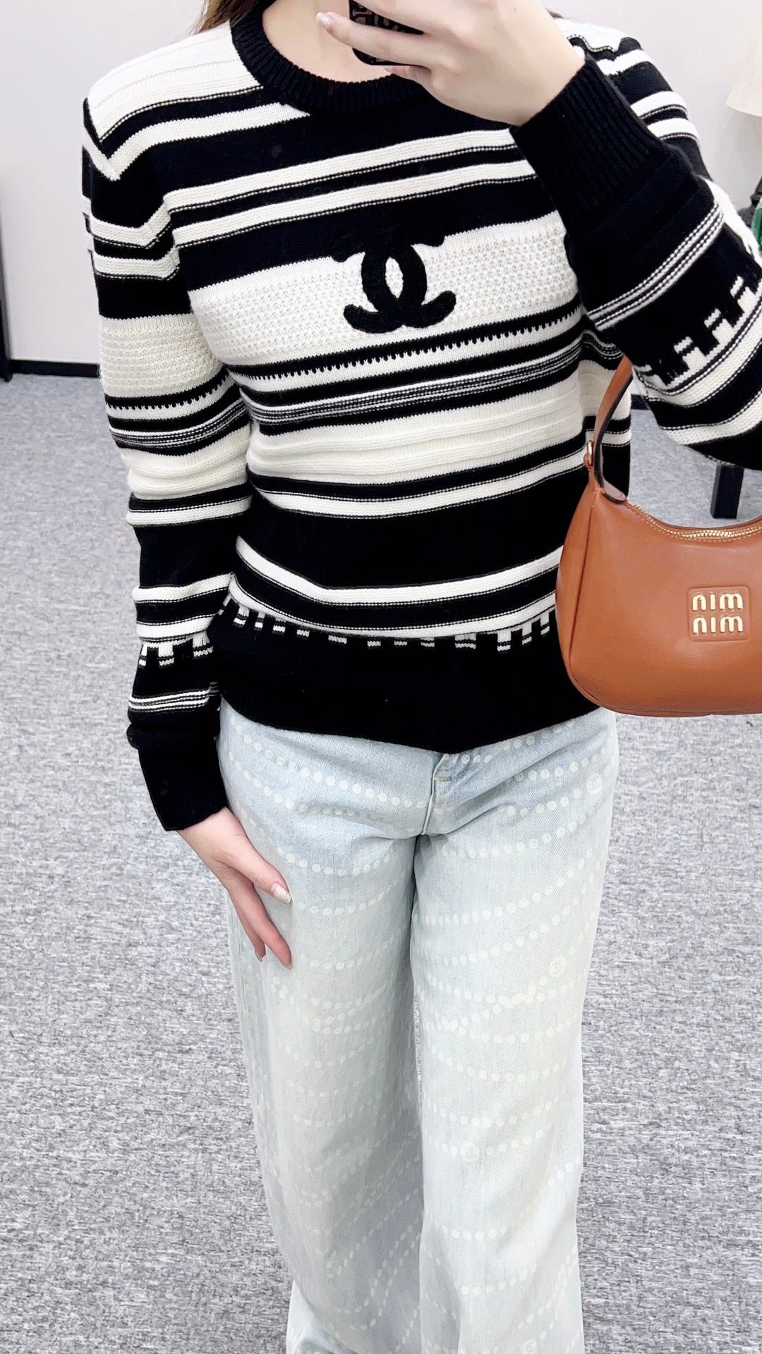 Crafted from wool yarn, this sweater offers exceptional comfort and a luxurious feel. The round neck knit pullover features a black and white striped texture, perfectly blending classic and modern styles. The double-C plush logo exudes understated elegance, while the staggered stripes and subtle plaid details add a touch of sophistication to its relaxed and casual look. Worn alone, it elevates the entire autumn/winter season with its clean lines, creating a chic and effortlessly stylish silhouette.