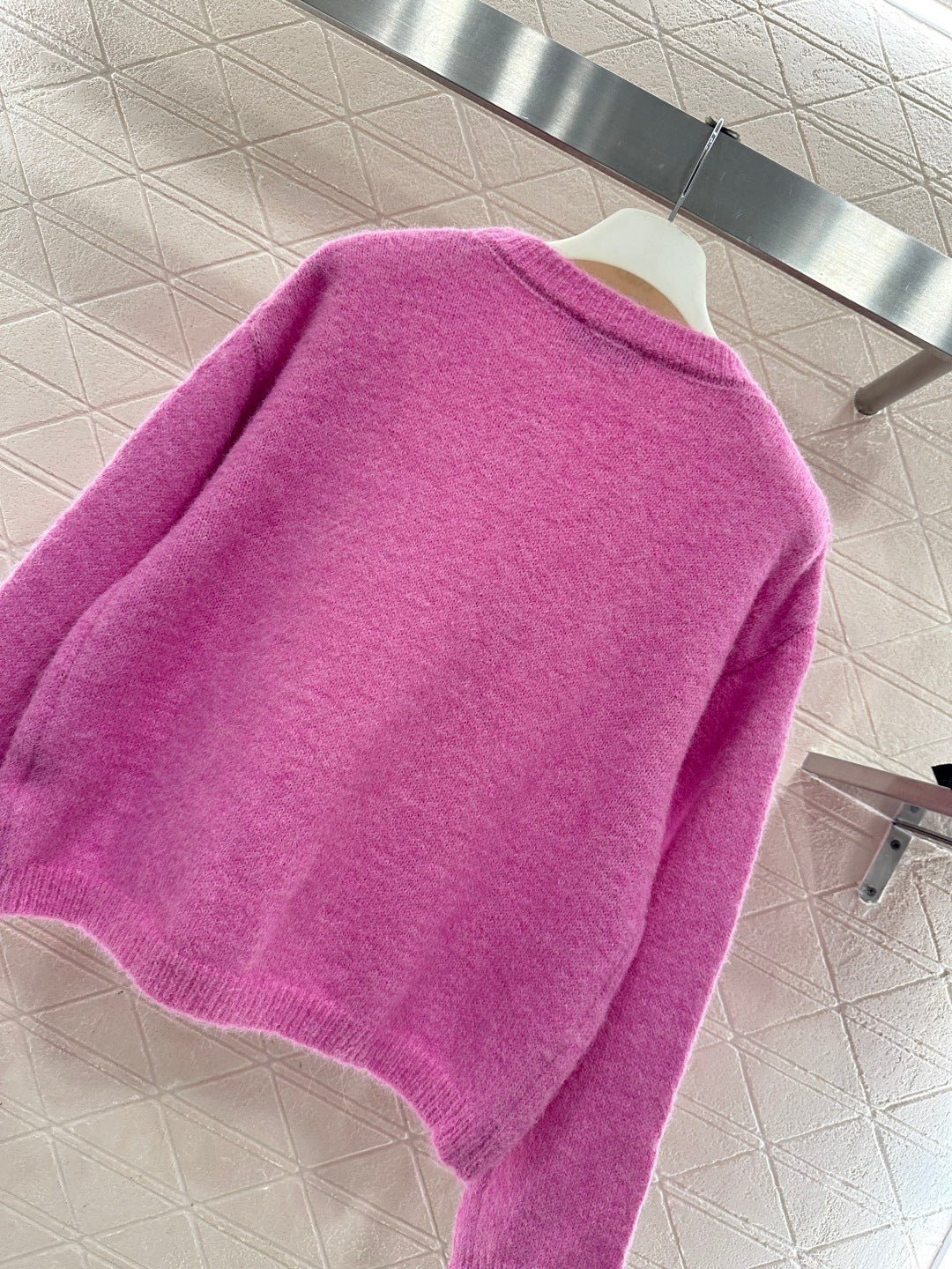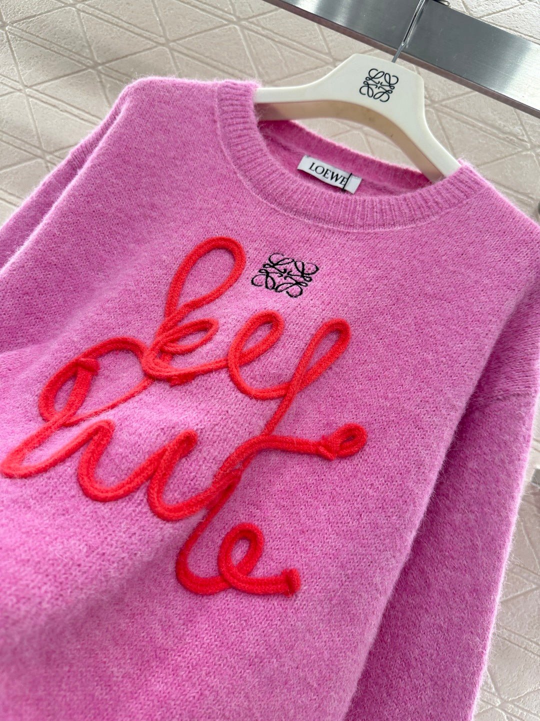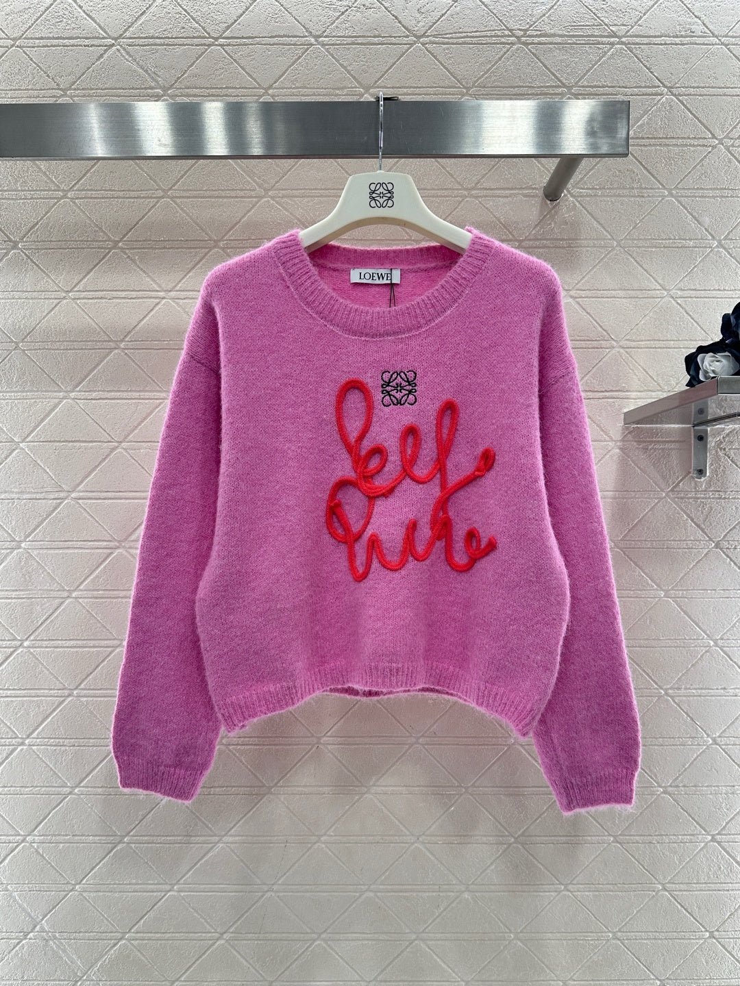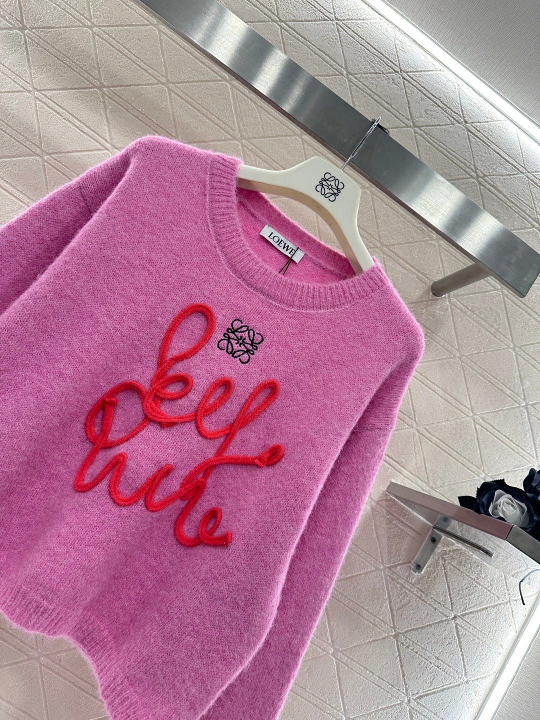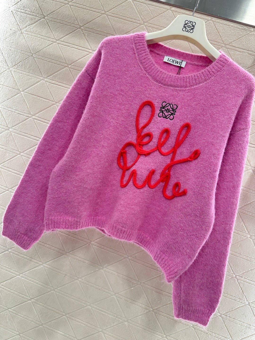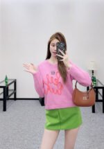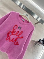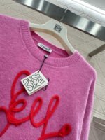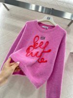 Wool yarn knitting, comfortable and luxurious, this round-neck pullover sweater features vertical ribbed trim throughout. A centrally crocheted cursive letter design is incorporated into the body, while embroidered patterns adorn the upper part. Combined with vibrant colors, it exudes a charming and playful vibe, making it a youthful and fashionable choice.