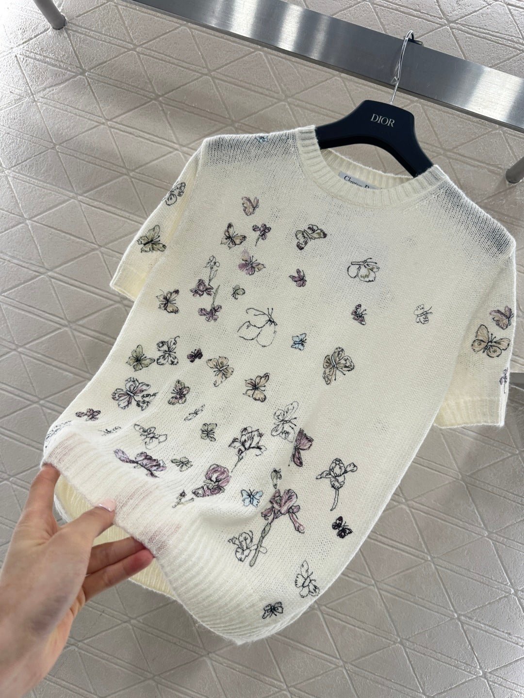 Crafted from silk and wool yarn, this garment boasts a luxurious feel, offering exceptional comfort and softness. The round neck and short sleeves, combined with the off-white hue that flatters the skin, create a radiant complexion. Delicate butterfly and floral embroidery adorns the garment, adding a touch of romance. The lightweight knit fabric is breathable and soft, and the relaxed fit is flattering for all body types. It can be worn alone or layered for a touch of French elegance.