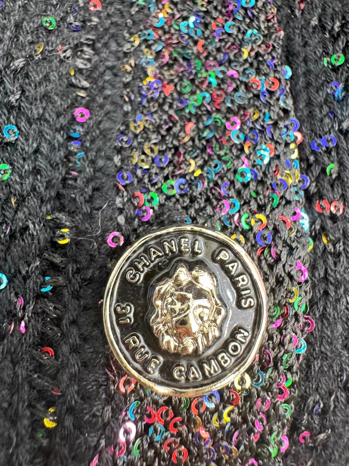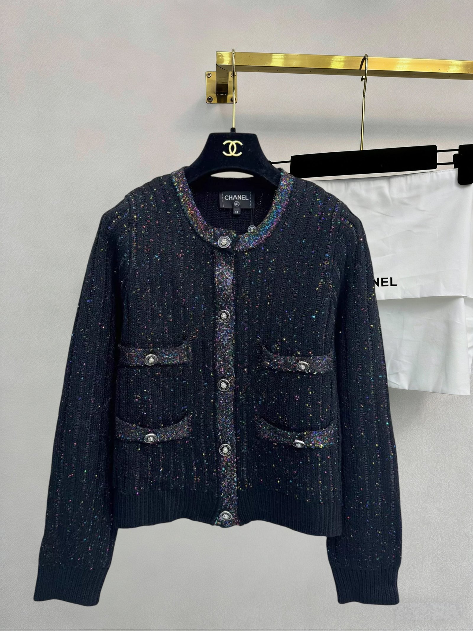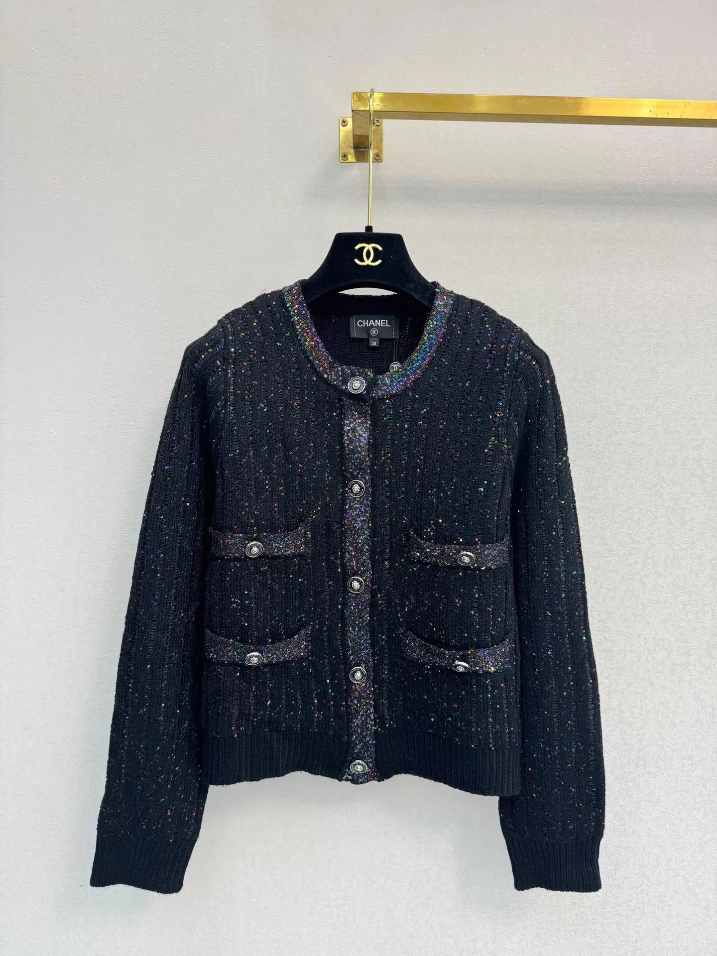 Made in classic tweed fabric, this cardigan features a round neck, button details, and a short cut for a comfortable and stylish look. Colorful sequins adorn the chest and cuffs for exquisite detail. A versatile piece for autumn and winter, it pairs well with both skirts and trousers.