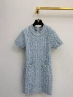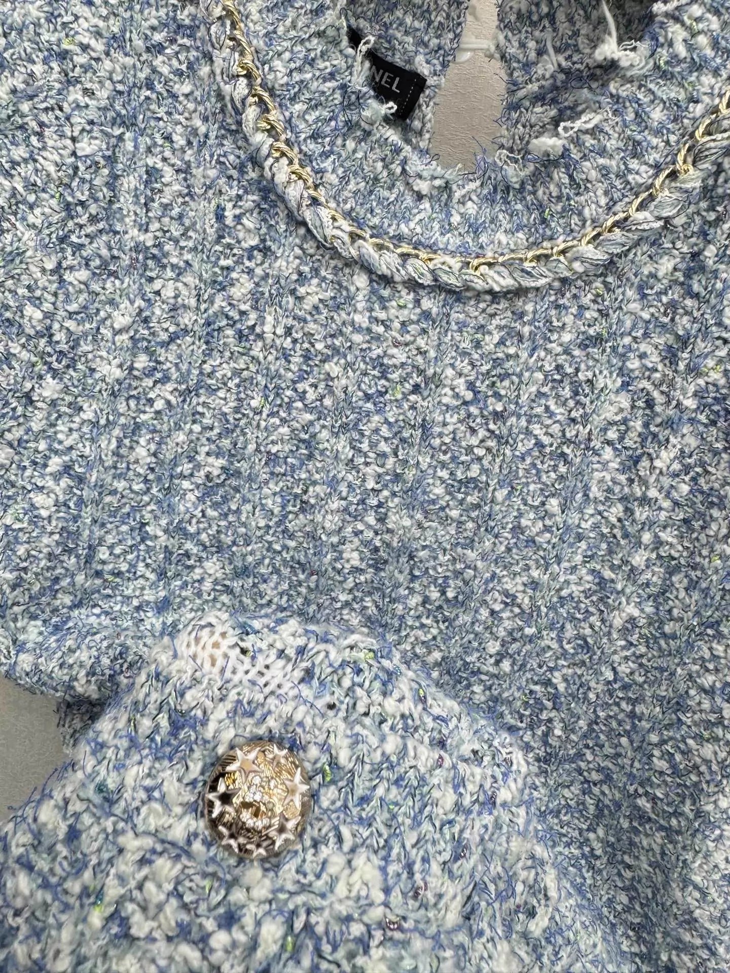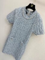 Classic tweed fabric with a luxurious texture. Features a short-sleeve collar and dual pockets. Embodies timeless Chanel-inspired style with refined details. Versatile and universally flattering.