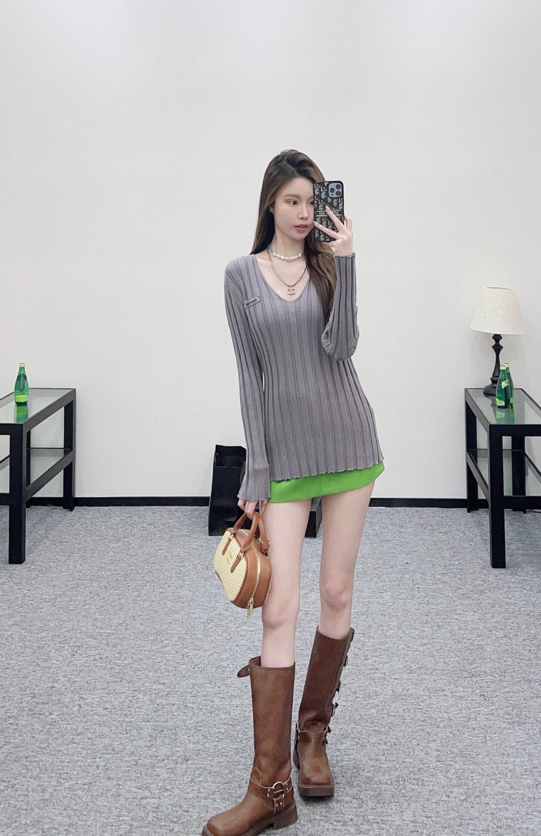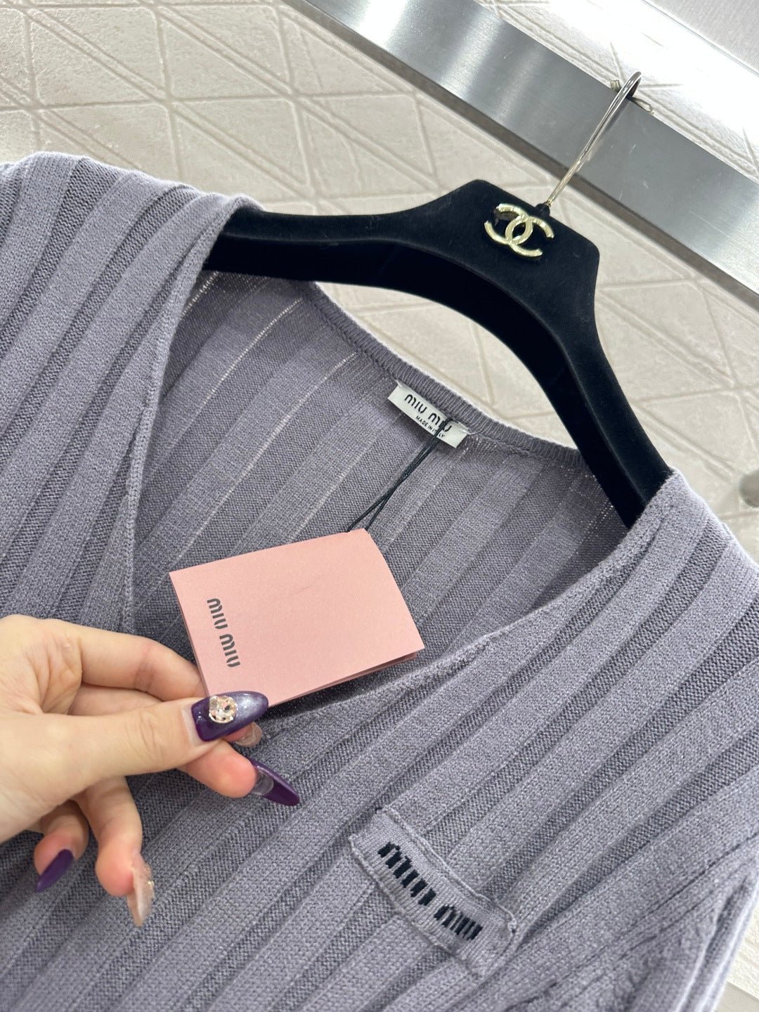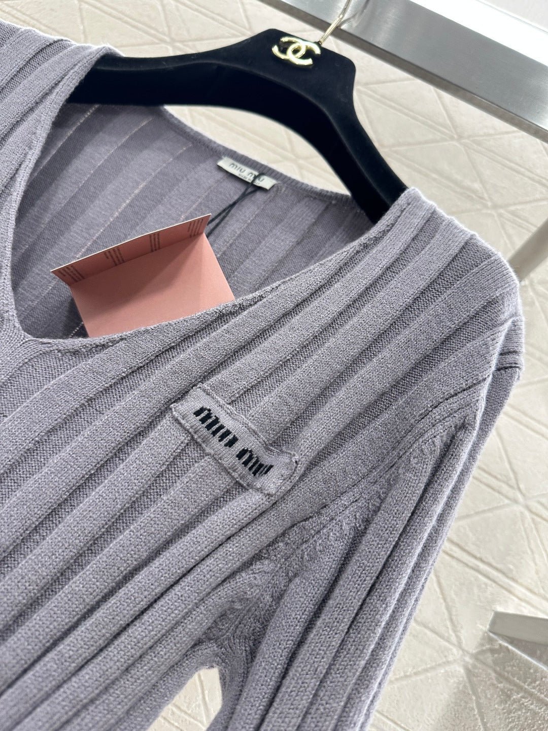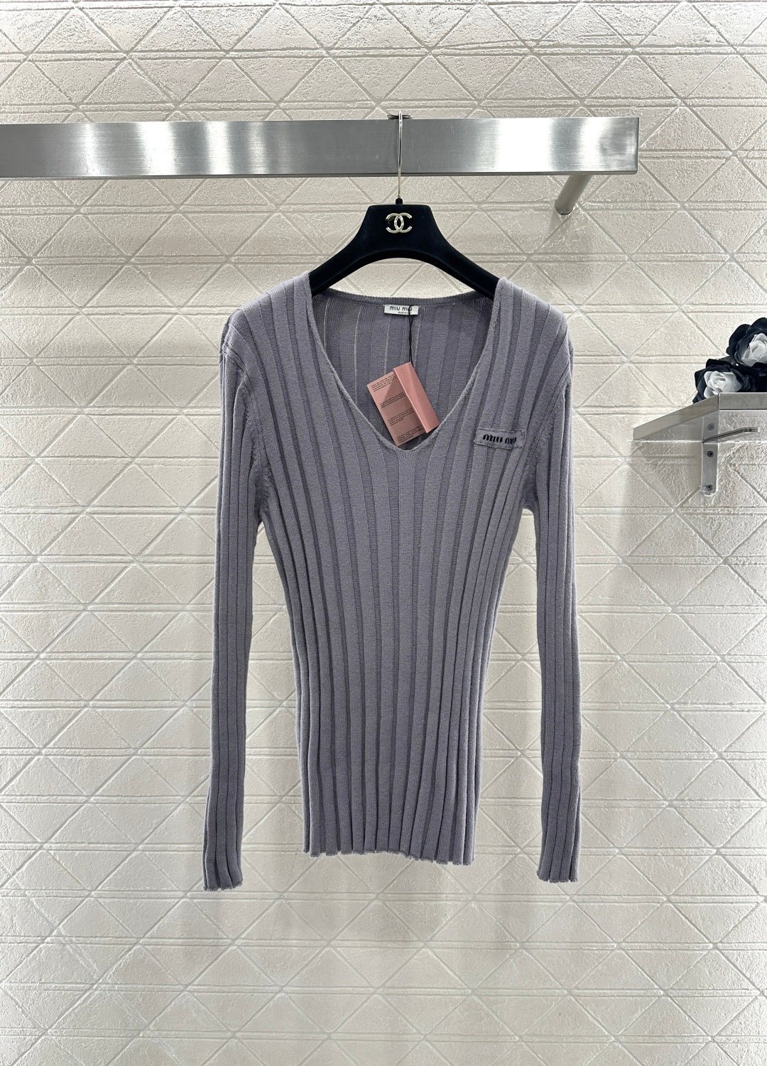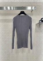 Crafted from wool yarn, this high-quality sweater boasts a luxurious feel and exceptional stretch. The V-neck, fitted knit design offers a snug, comfortable fit without adding bulk. The fine vertical ribbed texture creates a slimming effect, highlighting the exquisite details. A logo embellishment on the chest adds a touch of sophistication and style, making this a youthful and stylish choice.