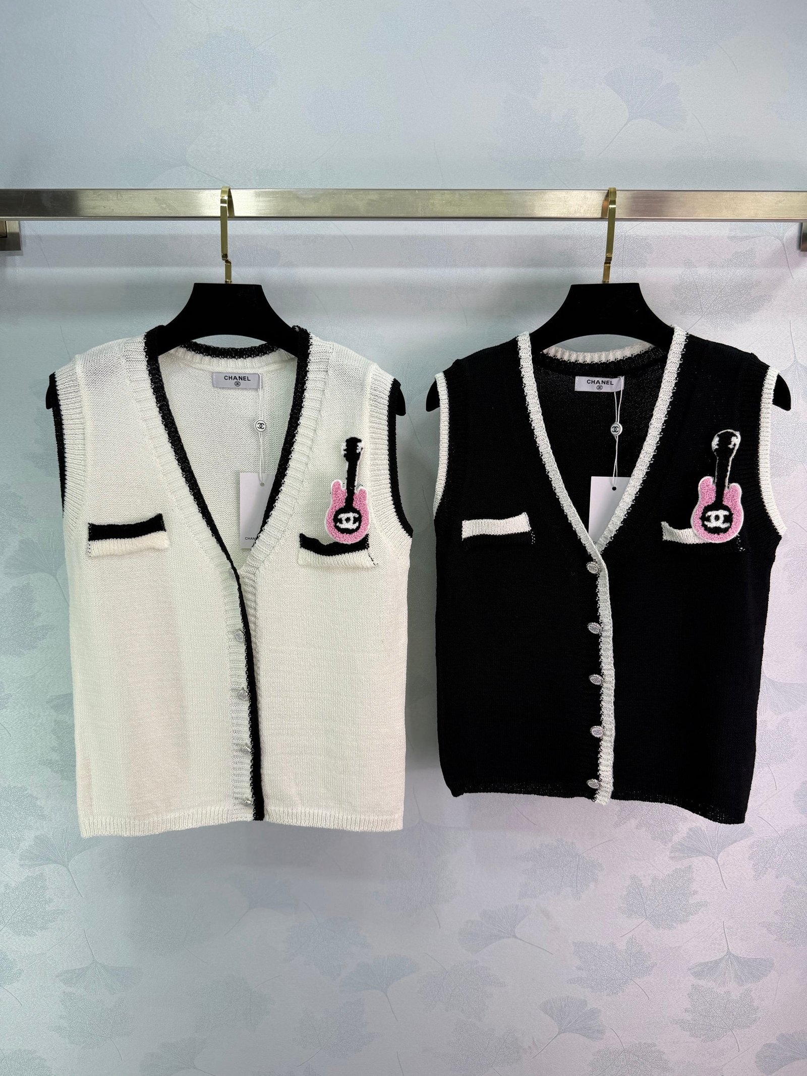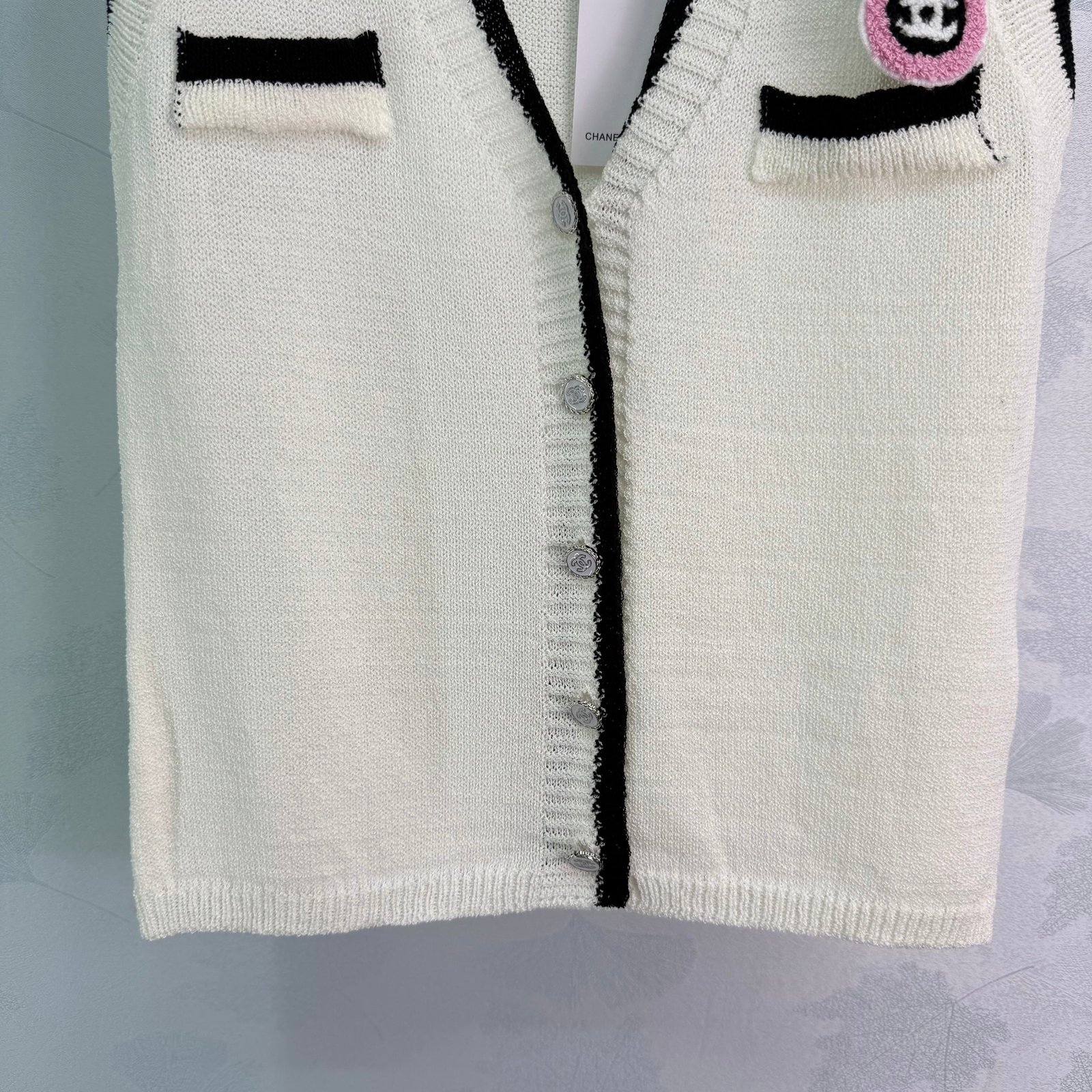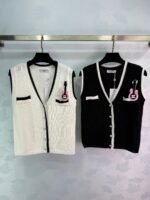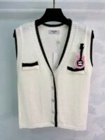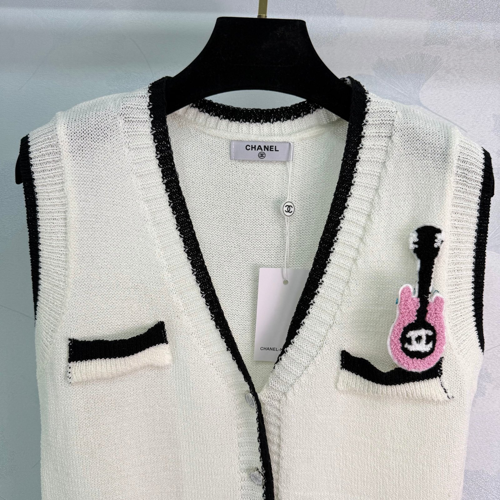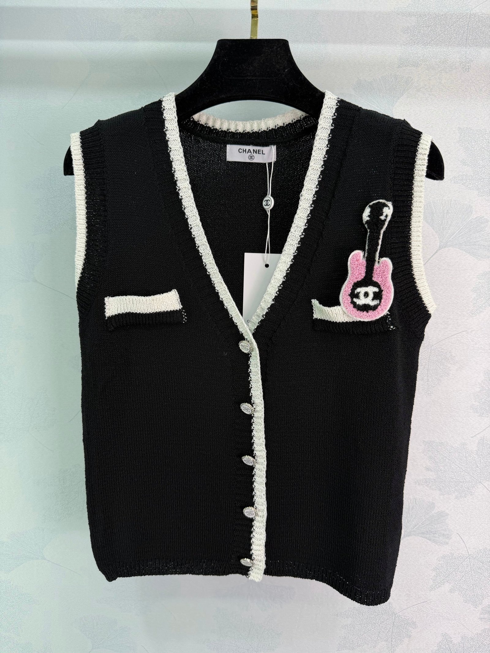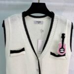 Soft knit fabric, super comfortable for spring and autumn. Double chest pockets and a pink guitar brooch add fun details. The classic double-C logo ensures high brand recognition! Easily paired with shirts or dresses for everyday wear, whether for commuting or casual occasions. Elegant, practical, and universally flattering