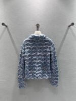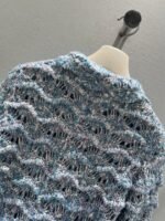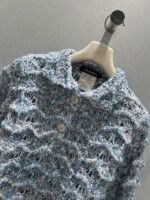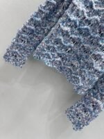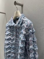 This piece features a chunky knit in a mix of blue and purple, with a richly layered, wavy openwork texture. The contrasting yarns interweave to create a dreamy, sheer effect, resulting in a look that’s both sweet and sophisticated. The classic lapel and single-breasted button design, paired with simple metal buckles, balances the fabric’s casualness and adds a touch of refinement.