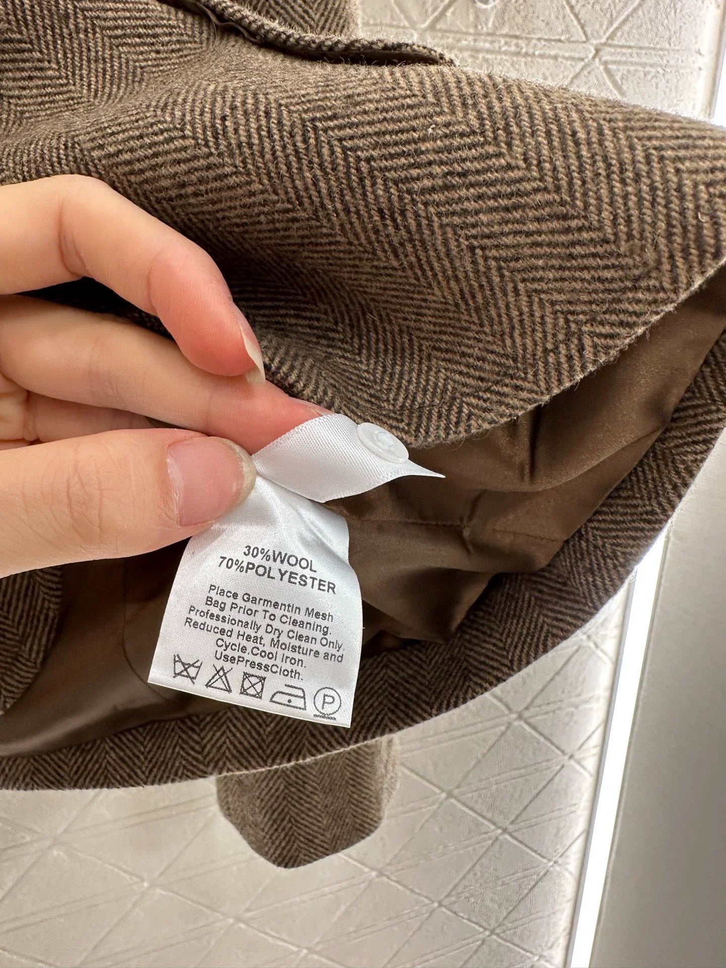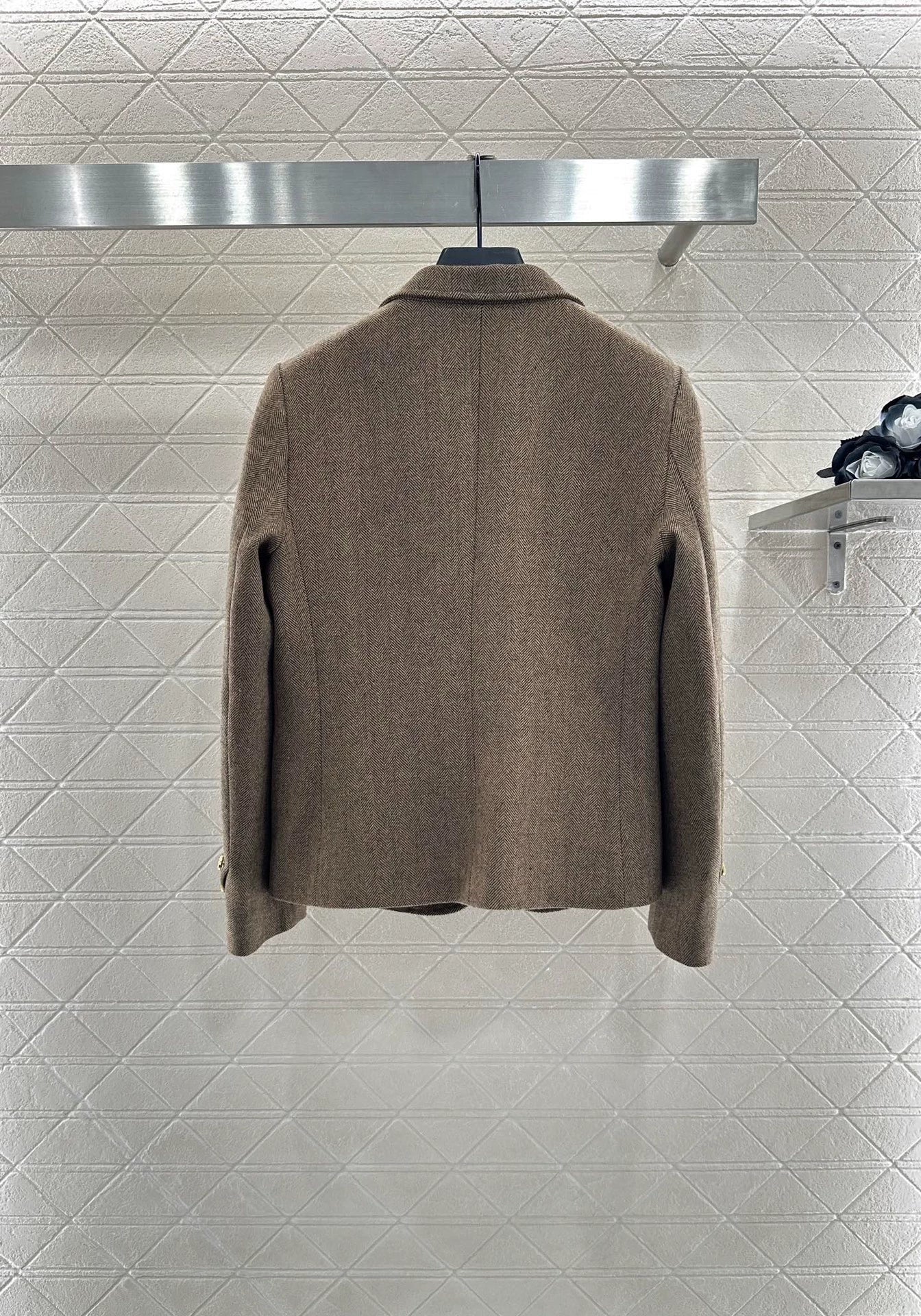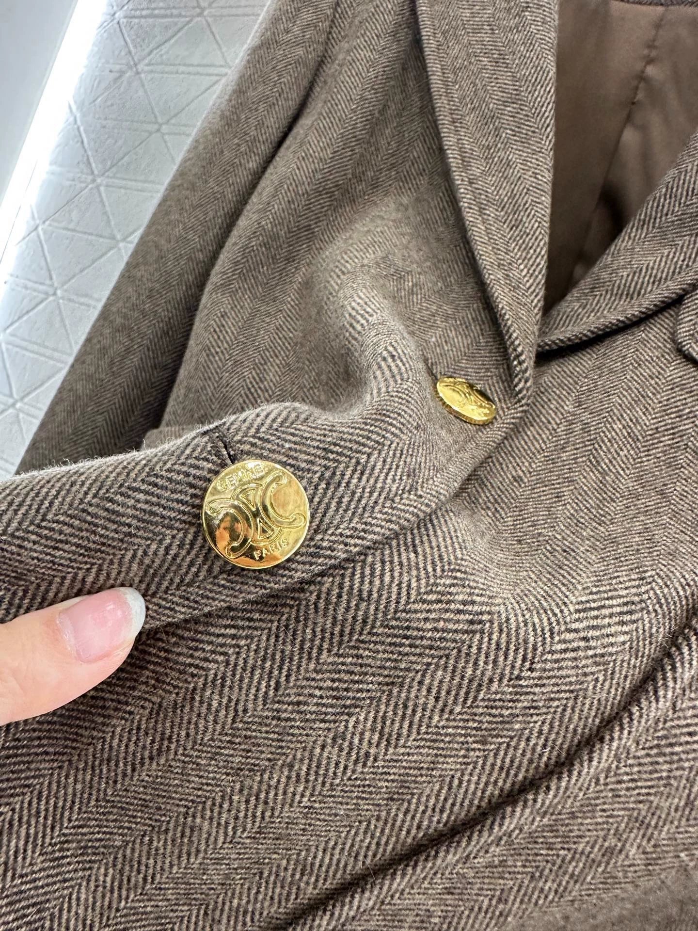 Wool wool material texture, high-end luster, obvious lapel, suit jacket, style, gun collar, neat cutting, easy to outline right angled shoulder lines, double gold buckle for easy on and off, highlighting the gorgeous brand tone. Paired with the same series of medium to long pleated skirts, the waist gold buckle is used to press the pleats and modify the inclusive leg shape. The complete set of wearing is full of leisure and academic sense