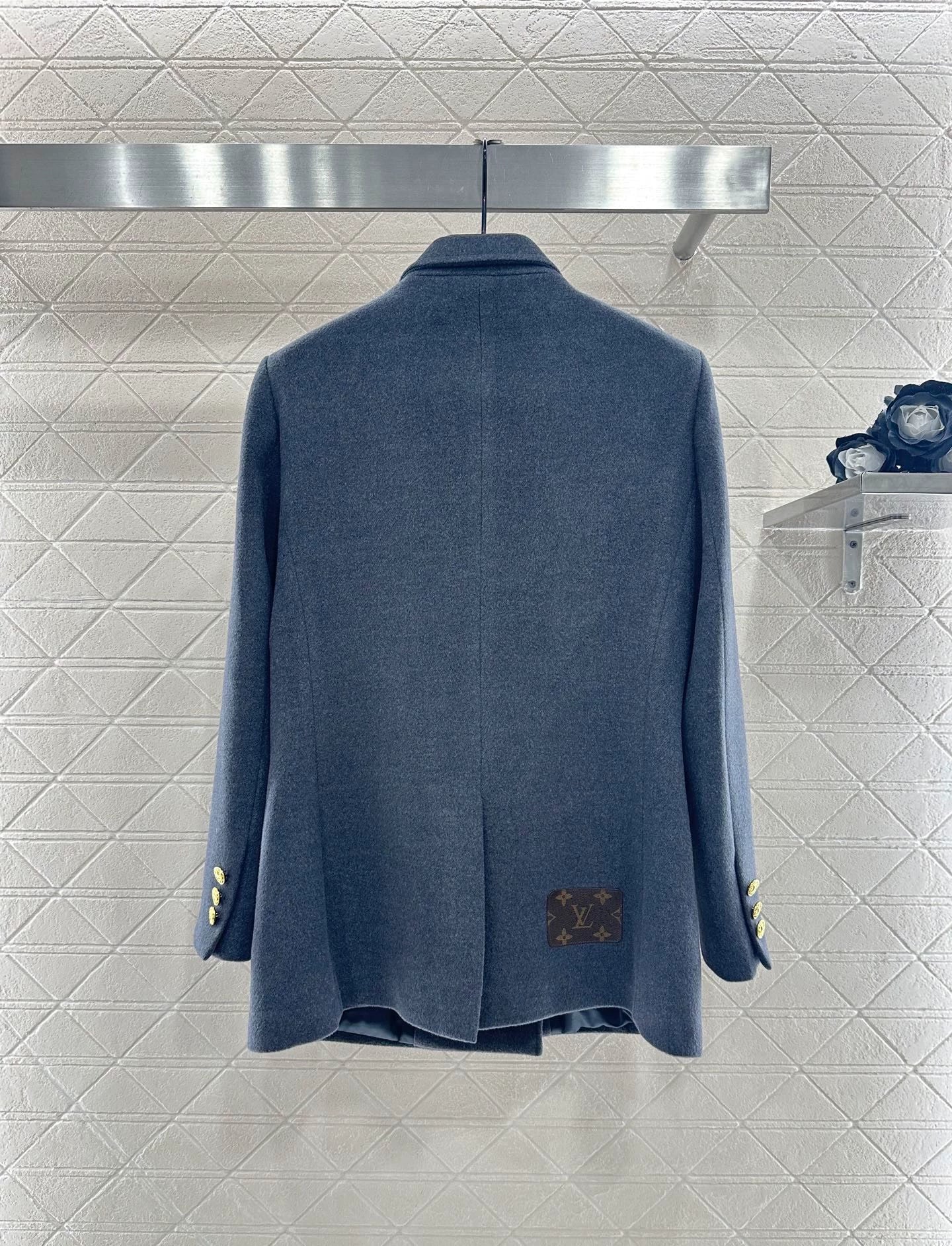 Crafted from woolen fabric with exceptional texture and quality, this slightly A-line blazer features outward-flaring lapels and a timeless, minimalist silhouette. Adorned with double-breasted large round buttons embossed with lettering, exuding sophisticated chic. Symmetrical deep pockets + back vent for ease of movement + four-leaf clover monogrammed leather label add rich layering, showcasing the brand's signature style. Versatile and timeless, it complements any look effortlessly. Flattering and inclusive, it offers relaxed elegance with a powerful autumn/winter presence.