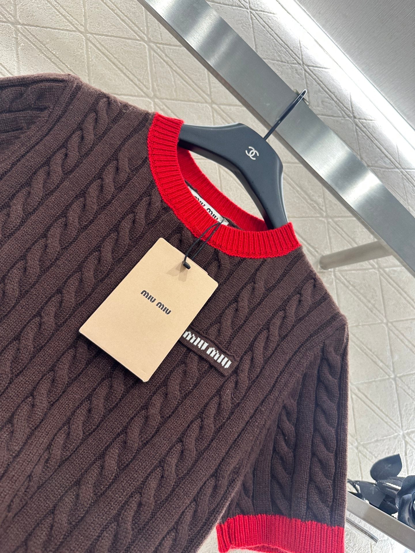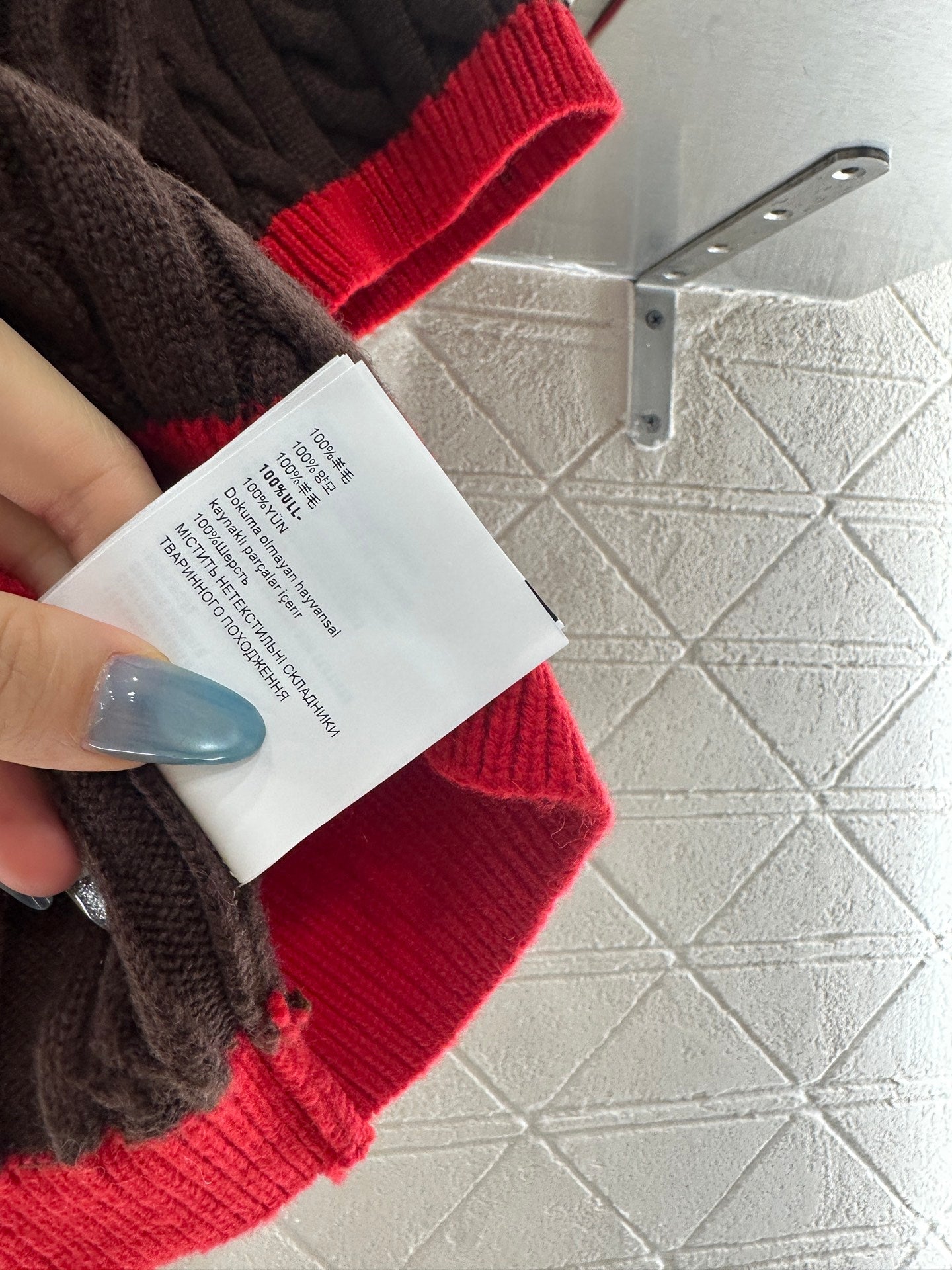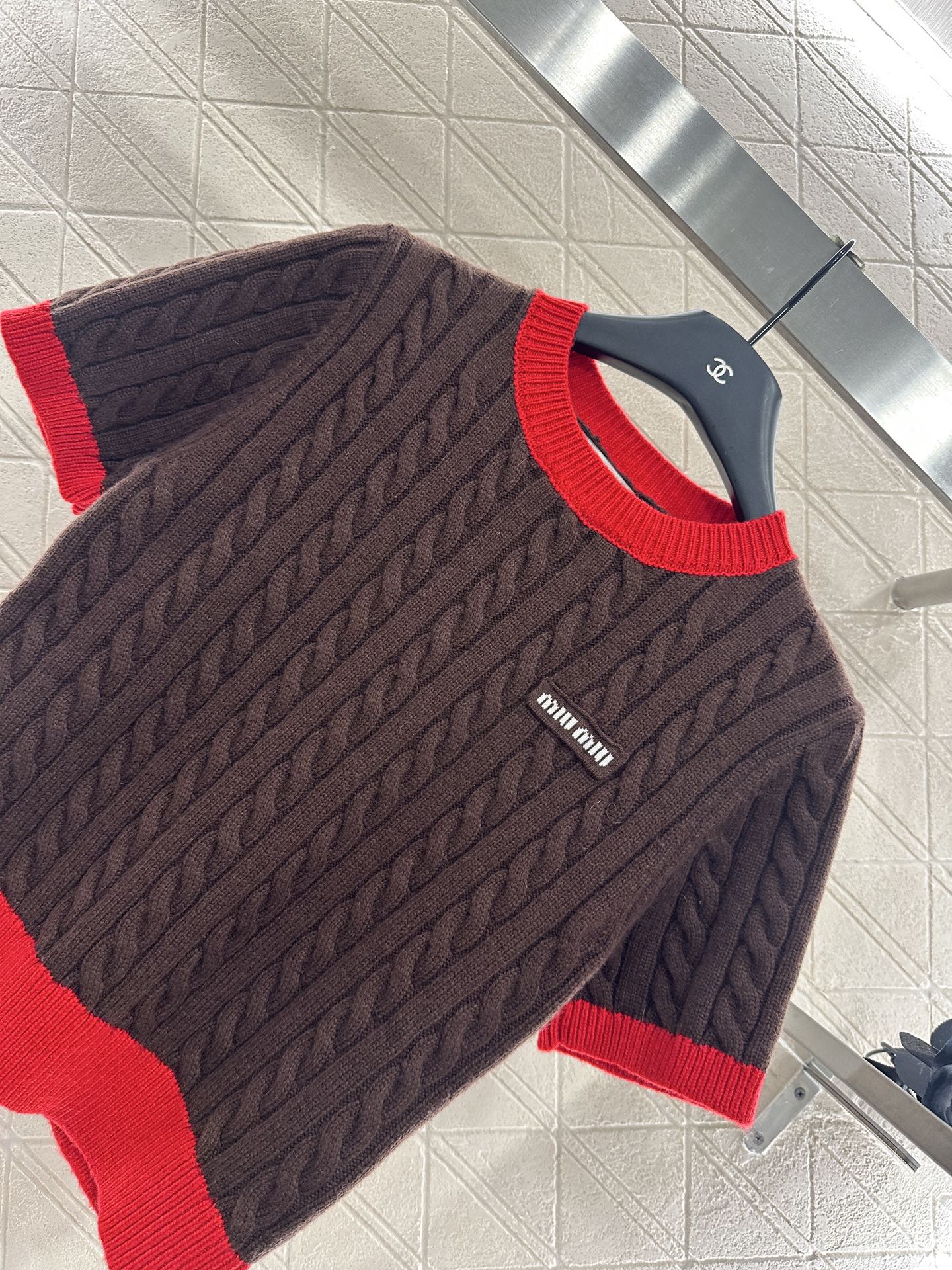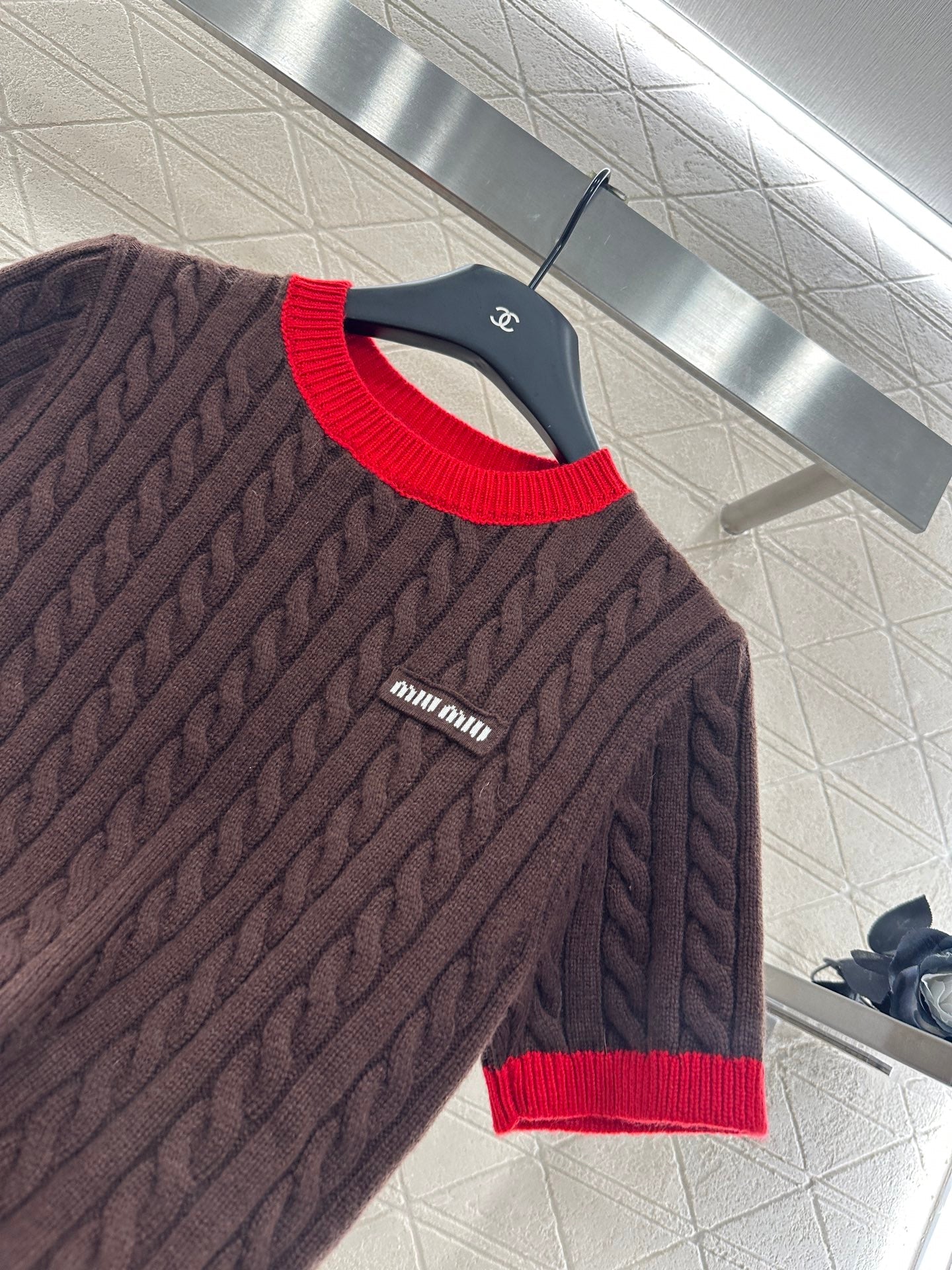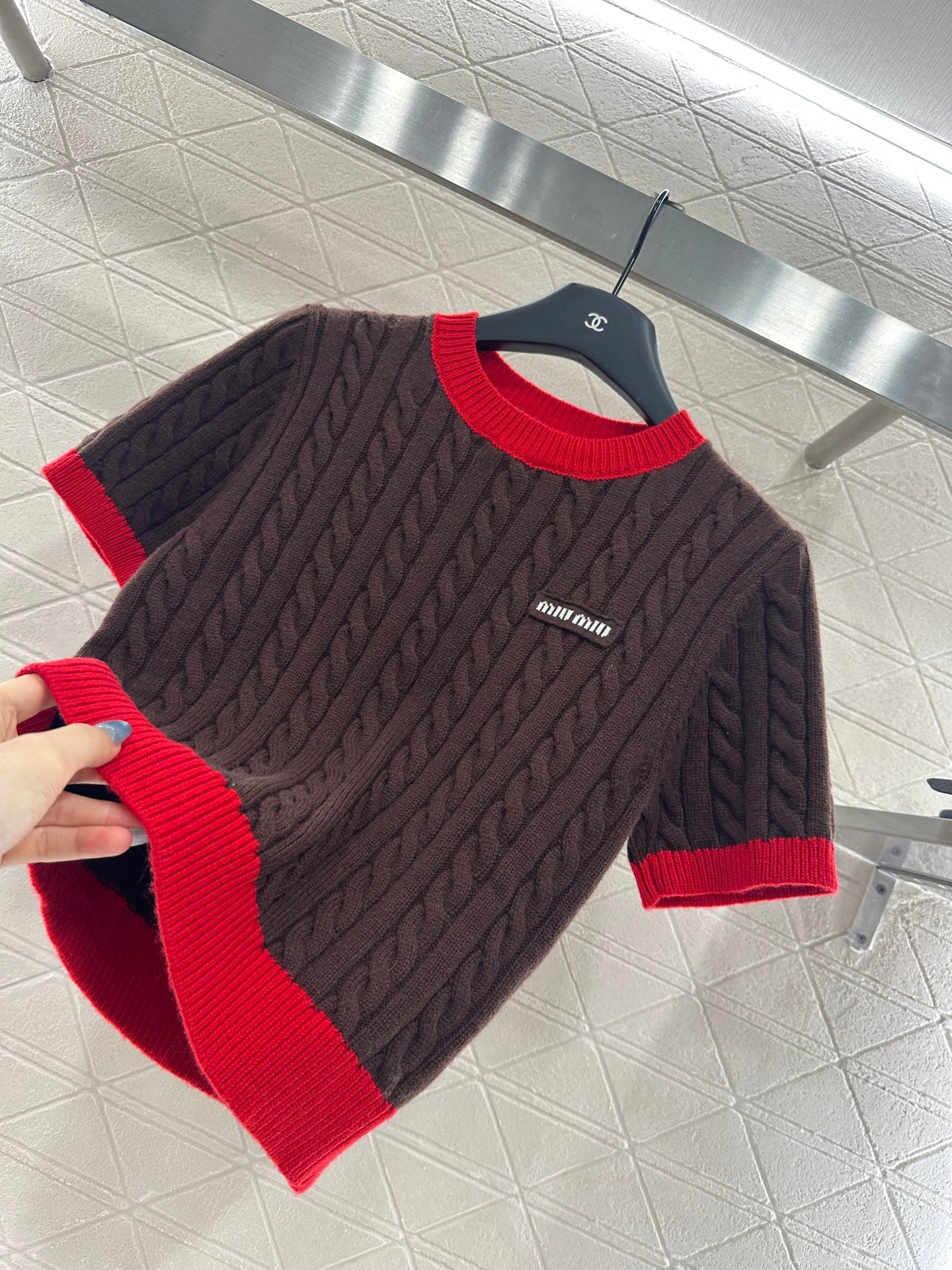 Wool yarn weaving, high quality, comfortable and soft, round neck knitting short sleeve cutting, all vertical Fried Dough Twists crochet texture, large body and collar cuff thread binding, forming red brown color collision, durable and versatile, easy to highlight the full details of texture. Embroidered with the letter brand logo on the chest, exquisite and stylish, versatile in style, slim fit on the shoulder, accommodating the body shape, fashionable and casual to wear