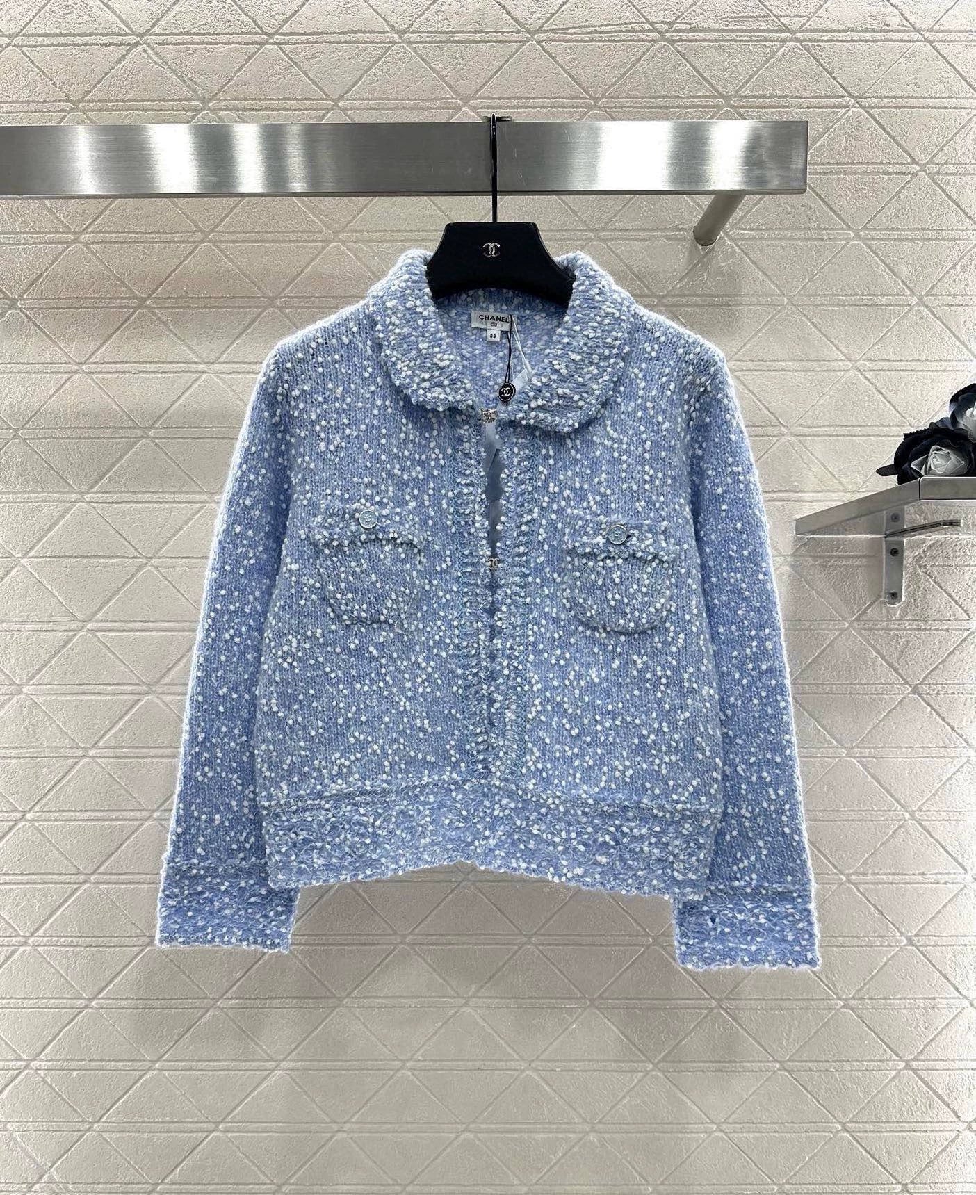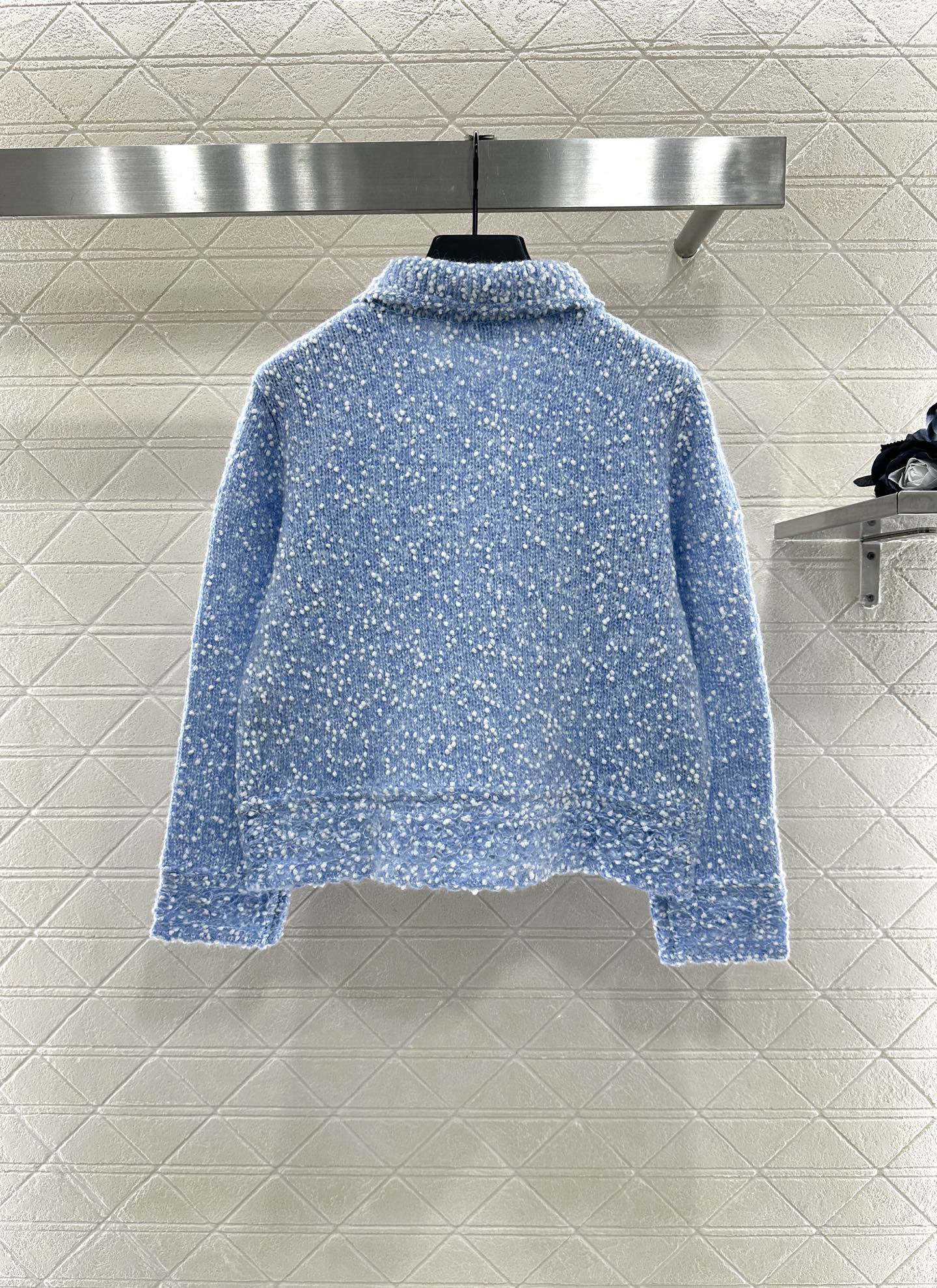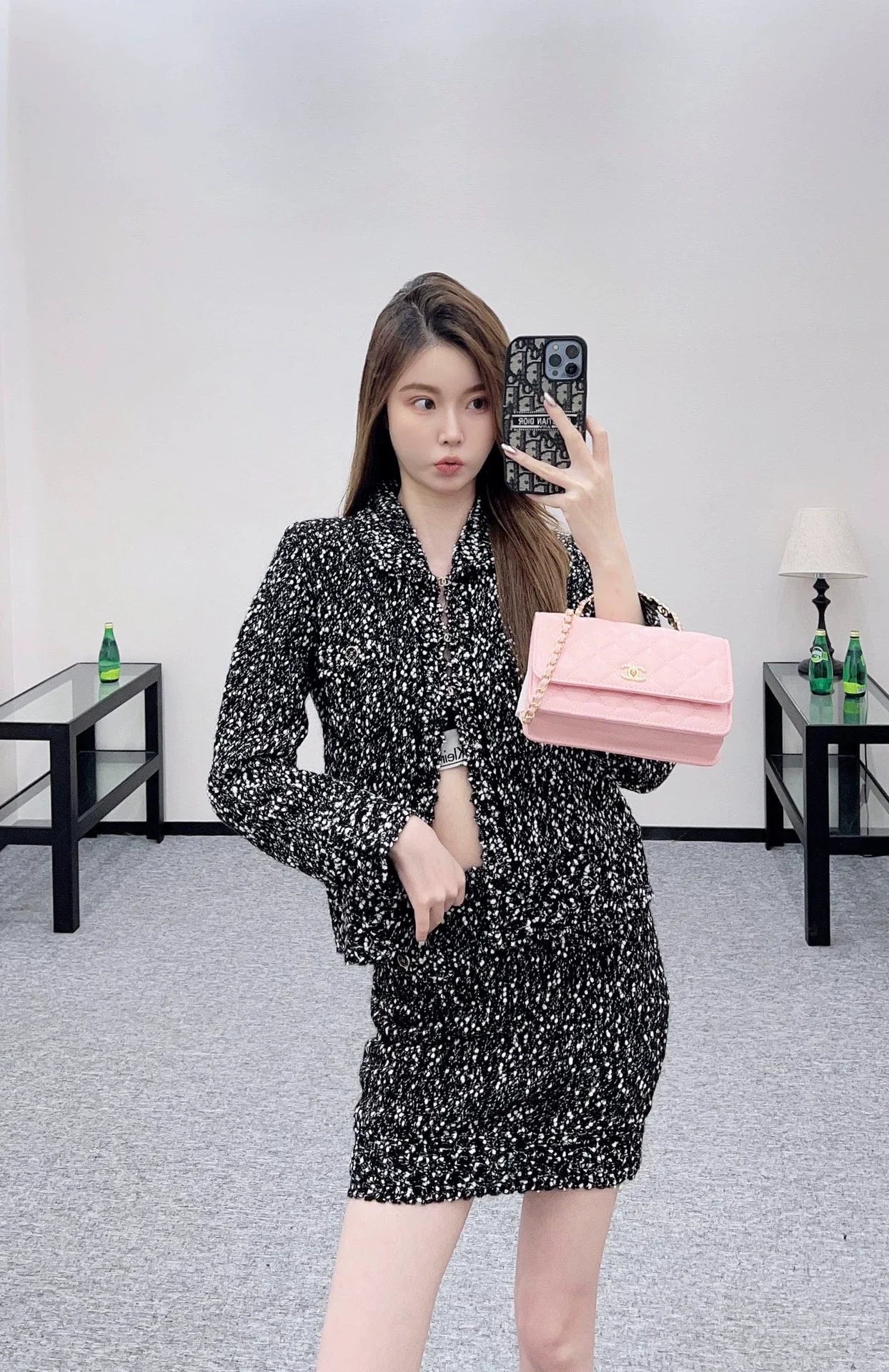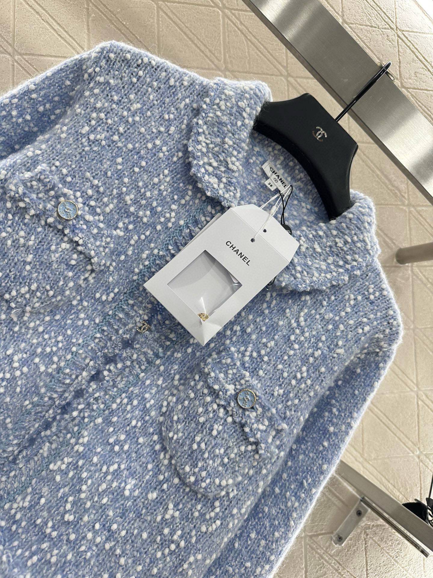 Cotton and wool yarn weaving for comfortable and soft wearing. Knitted cardigan with a half skirt set, featuring a rhinestone double C-button connection and a cardigan design. The collar edge extends to the front with wavy lace ➕ The hem and cuffs are decorated with crochet and lace, combined with double C-shaped engraved buttons to showcase the brand's tone. The finished garment is delicate and dense in texture, crocheted in plain color with durable and gentle wool like polka dots. The same series includes a straight leg skirt that covers the buttocks and improves the proportion of the body, showcasing a retro style temperament