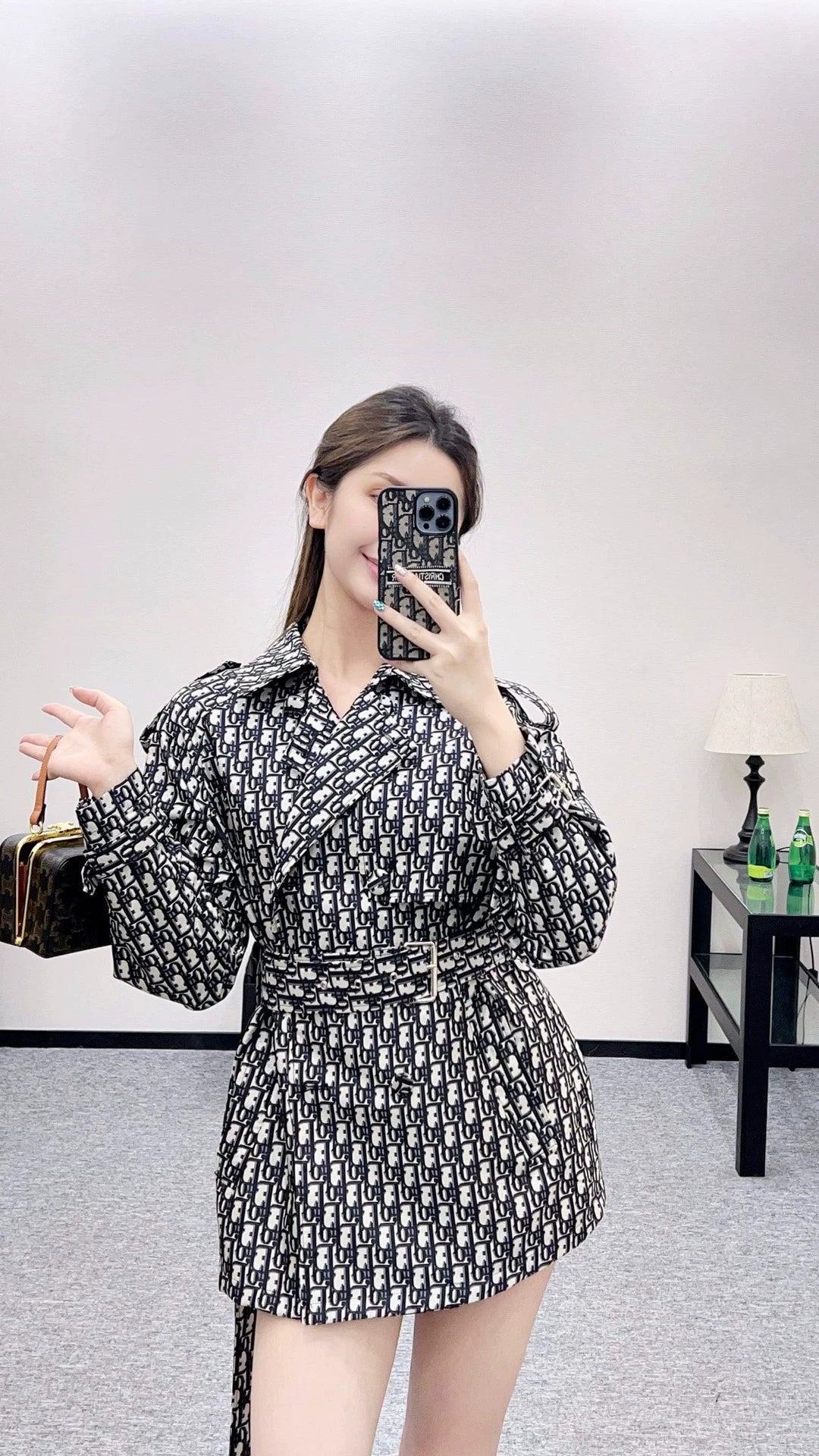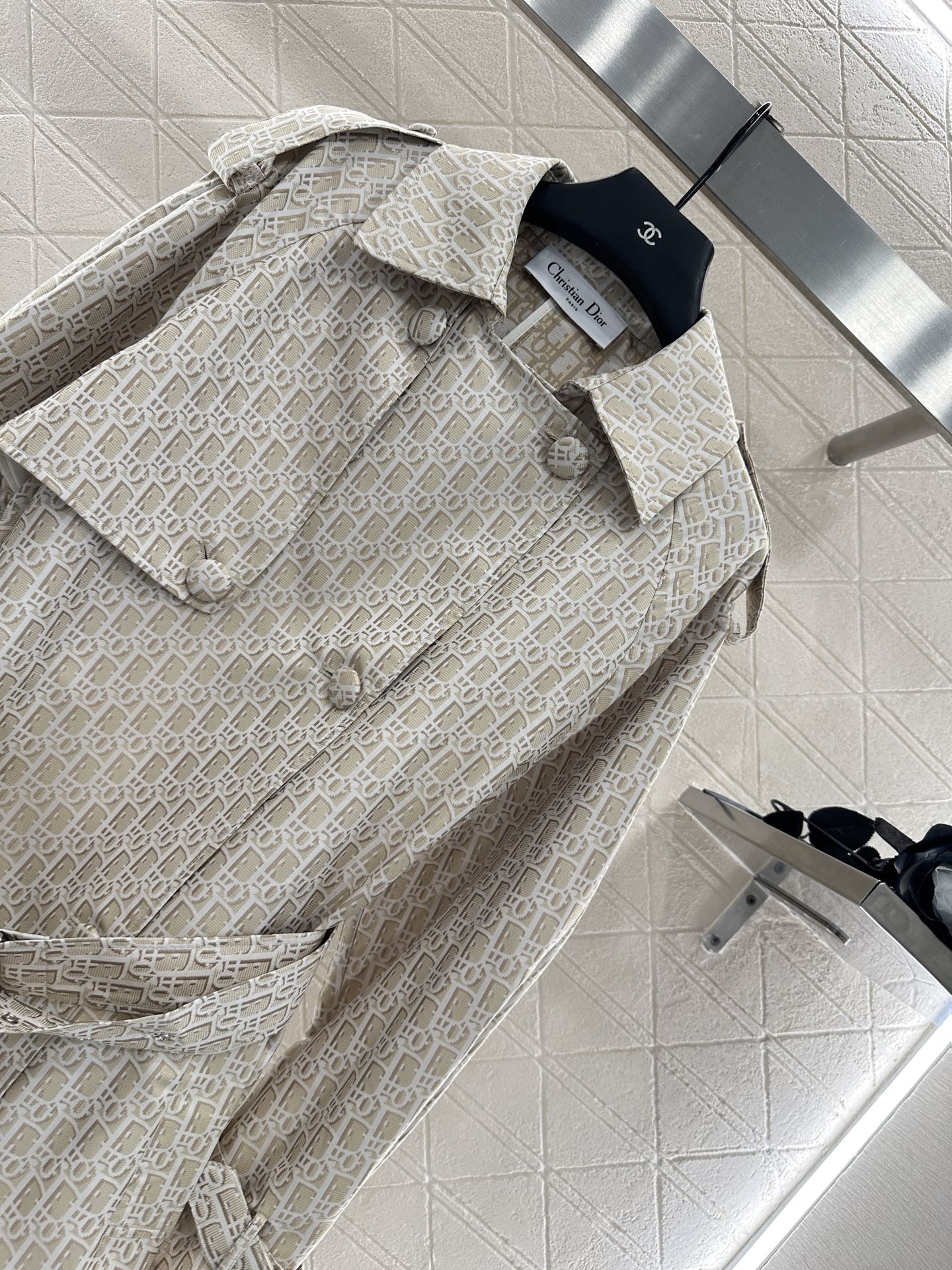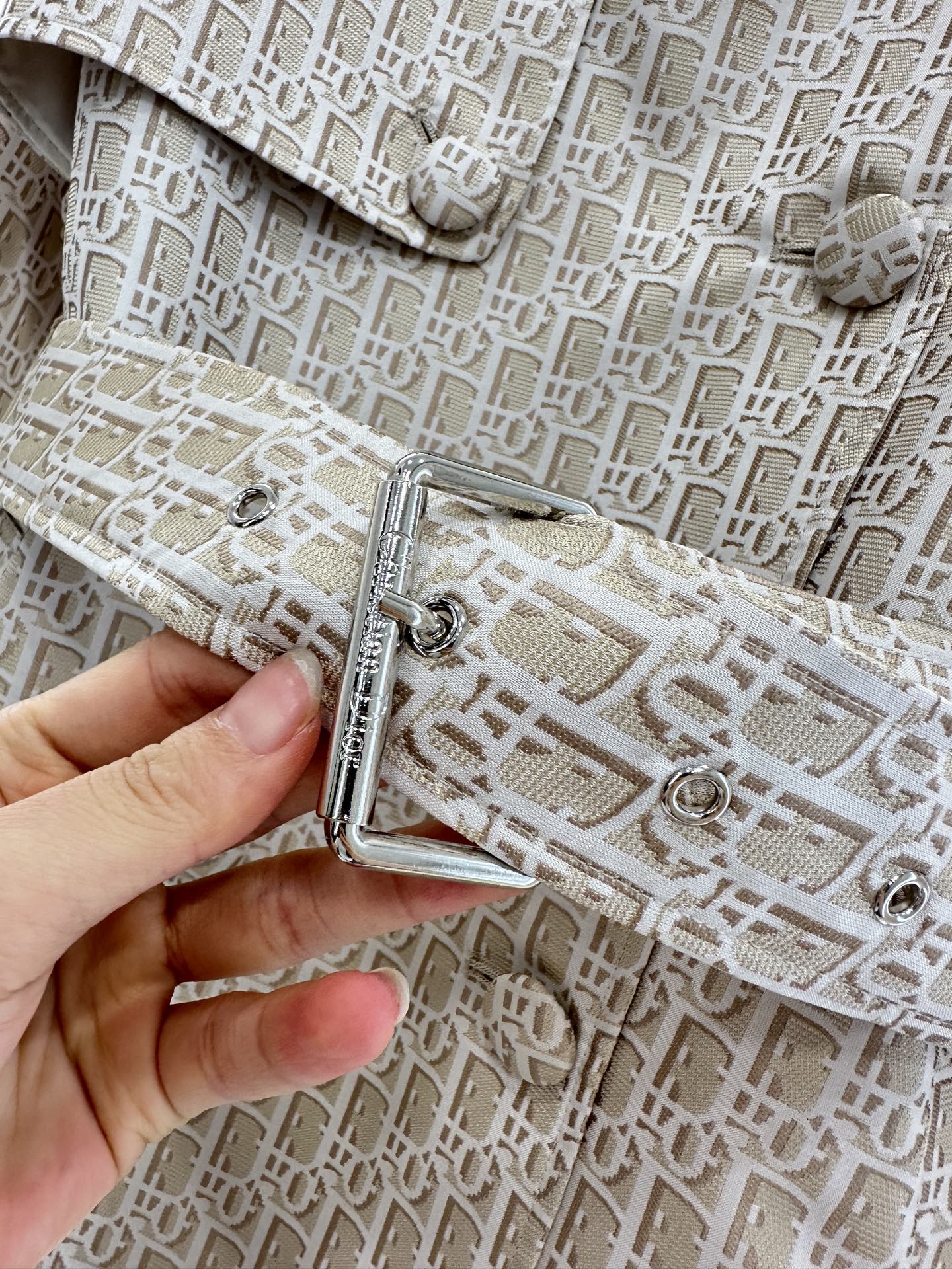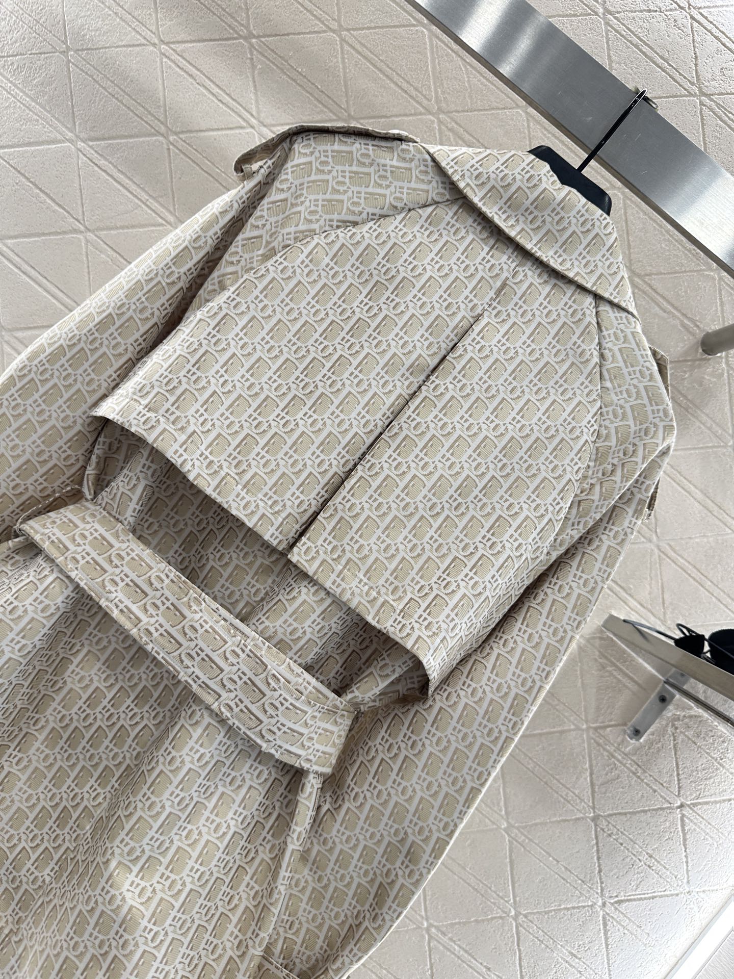 Imported jacquard material texture stands up with a stylish upper body covered with letters, logos, jacquard, and a strong sense of old money, showcasing the brand's retro and fashionable style. The single-sided cape windbreaker jacket is designed with a shawl collar as a highlight, combined with double breasted buckles and shoulder strap buckles that fit the body's curves and layers. The waist belt is effectively divided into proportional curves, and the body is more inclusive, showing a higher sense of design and style. It is a high-end, intelligent and versatile item for changing seasons
