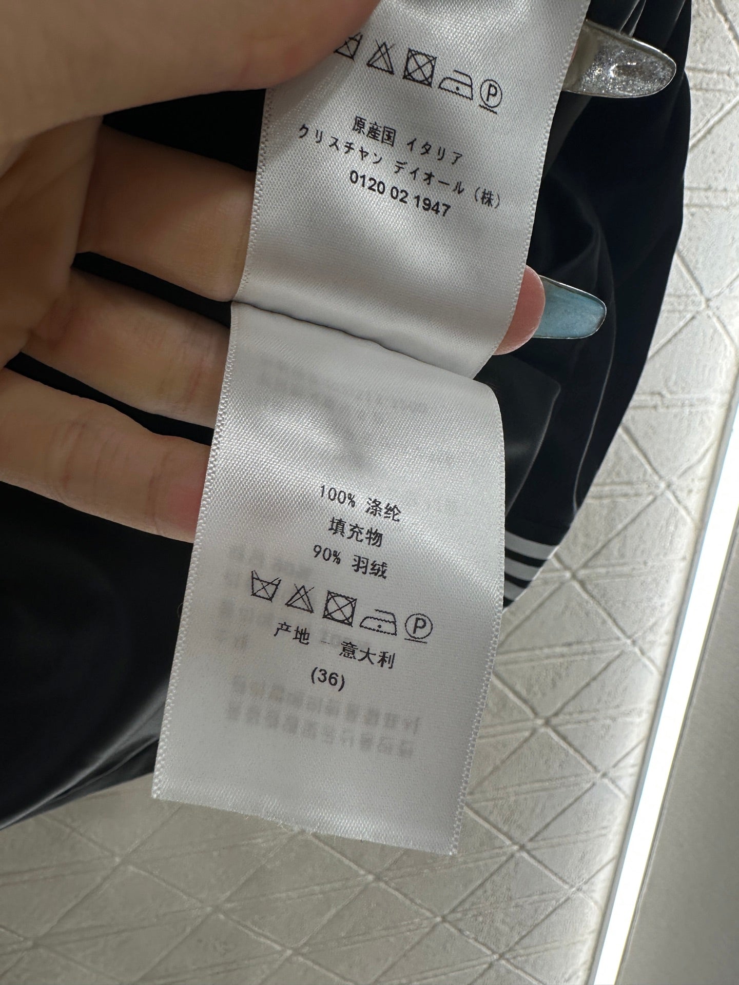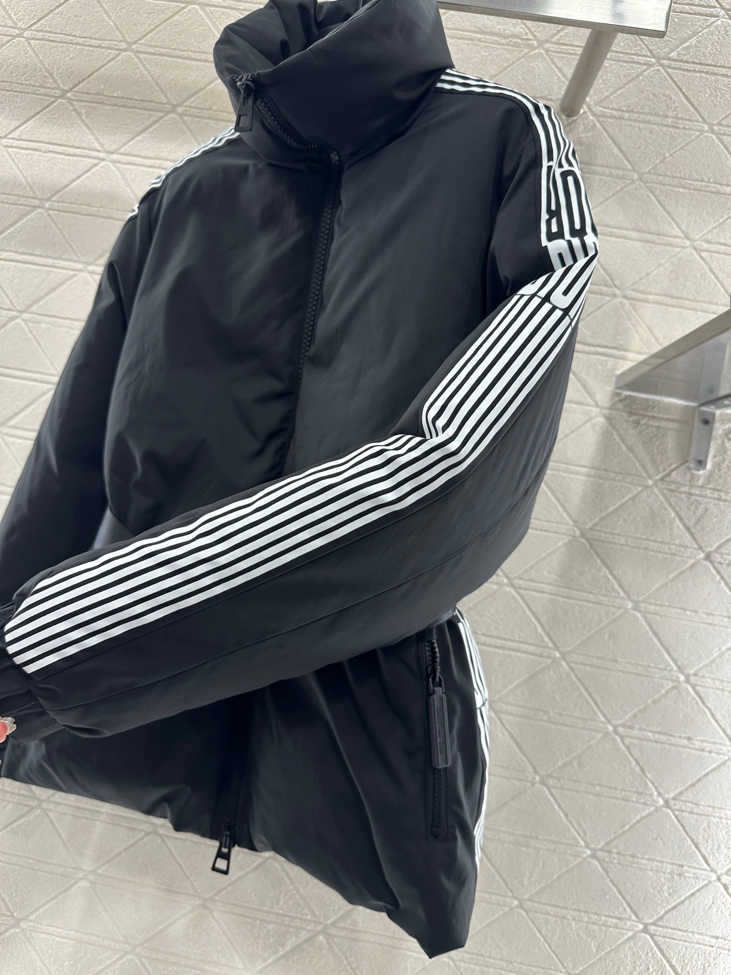 Windproof and waterproof nylon material, with down filling inside, the whole piece is lightweight and warm, with a stand up collar zipper jacket design, and stripes extending from the shoulders to the sleeves ➕ The letter printed ribbon breaks the dullness of autumn and winter, with elastic cuffs and narrowed edges for windproof and cold insulation. The details showcase the brand's style, and the buckle waistband outlines the lines. The regular style does not choose a stylish figure, and when paired with skirts and pants, it shows a fashionable high street style.