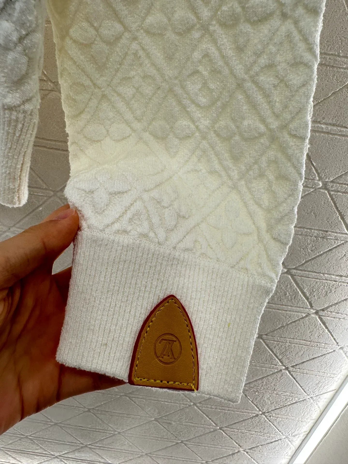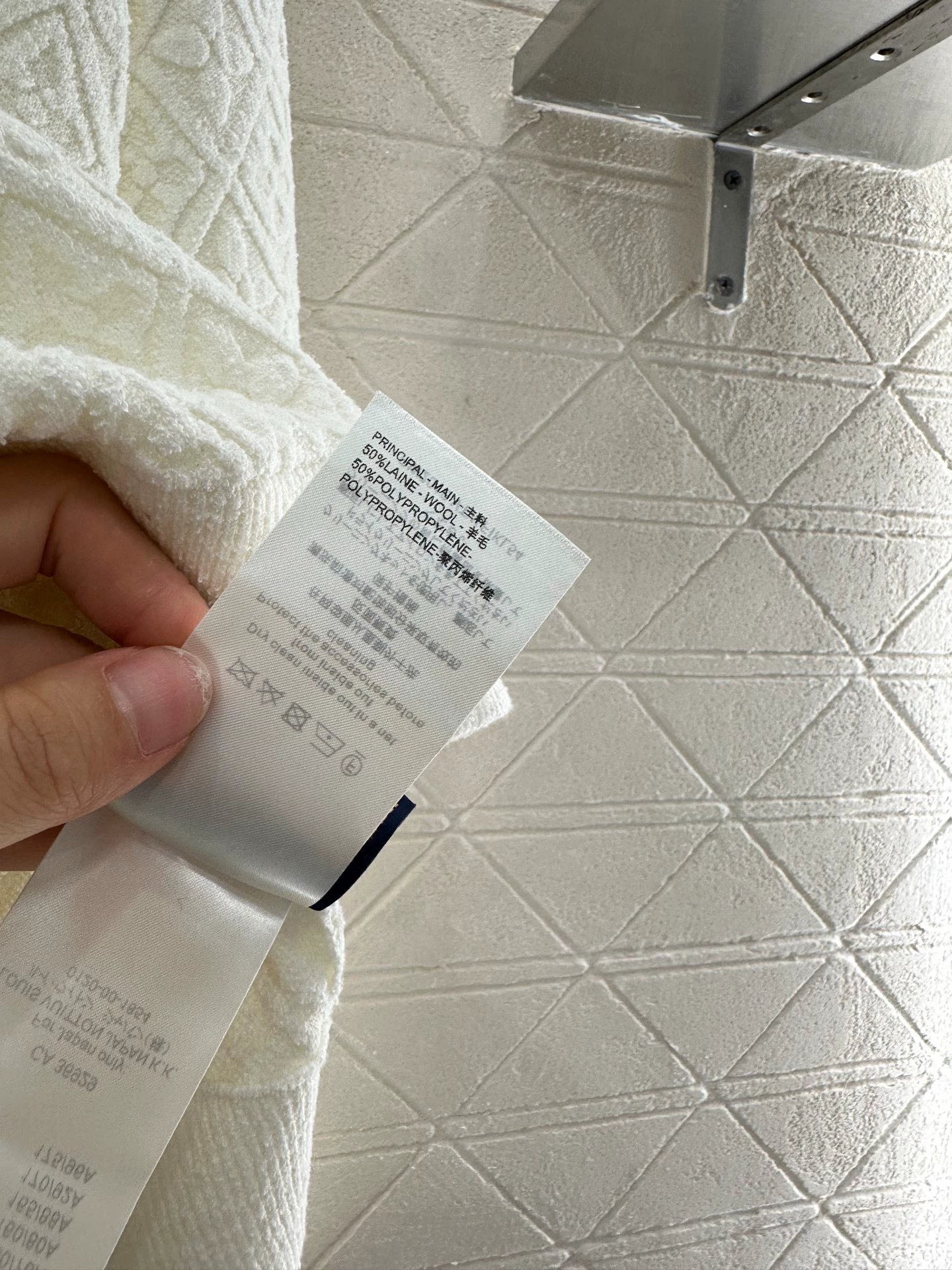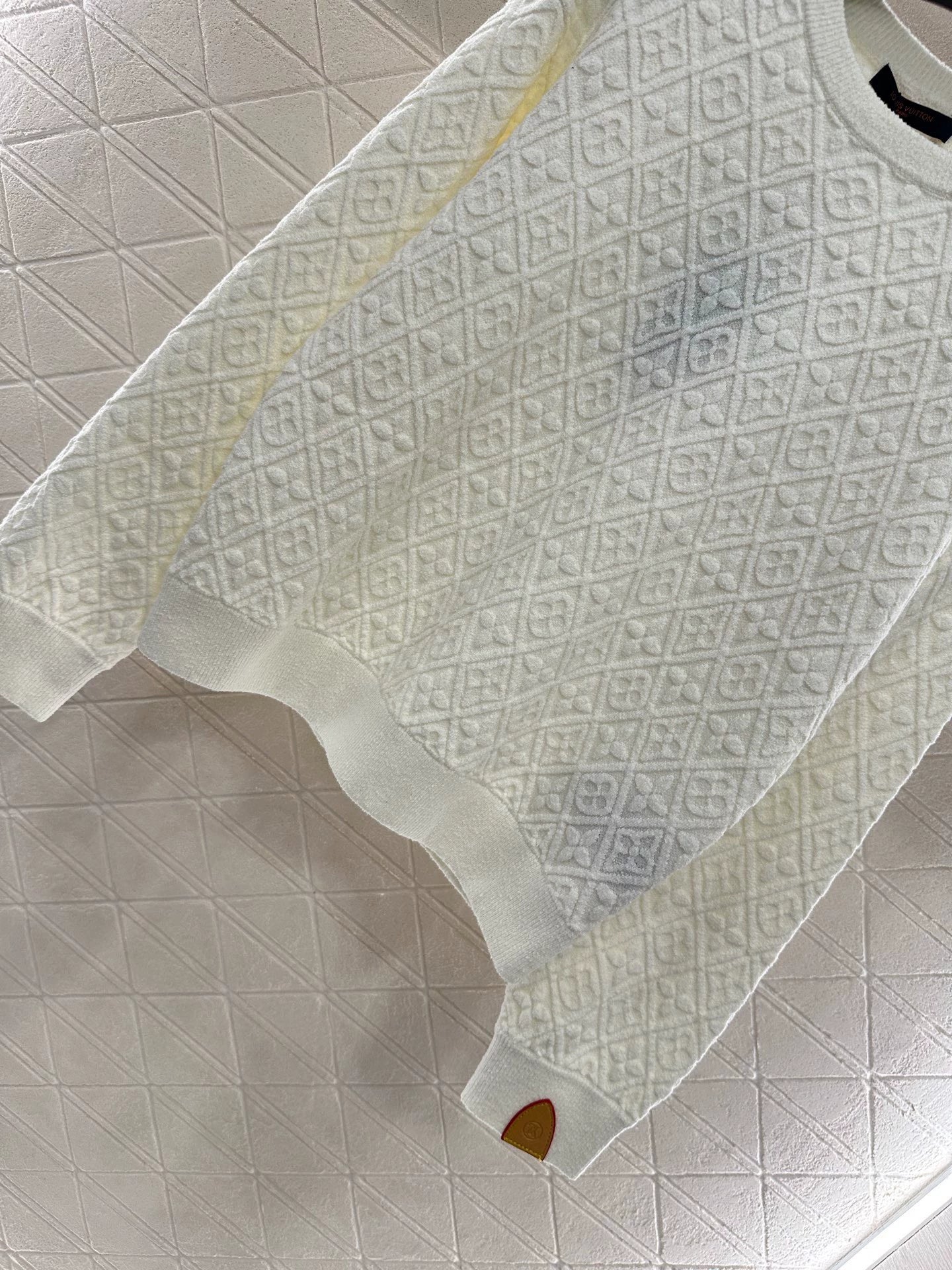 Knitted material with comfortable and soft texture, superior round neck pullover sweater style, collar edge, cuff thread groove design, elegant and relaxed single-sided cuff elastic tightening, matched with letter engraved leather buckle, echoing the three-dimensional clover diamond decoration of the whole body, creating a high-end and fashionable brand exclusive trend style, adding a sense of style to conventional versatile styles, and wearing with a strong sense of fashion