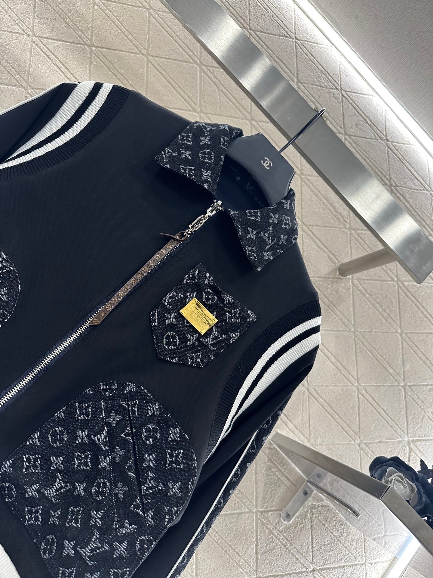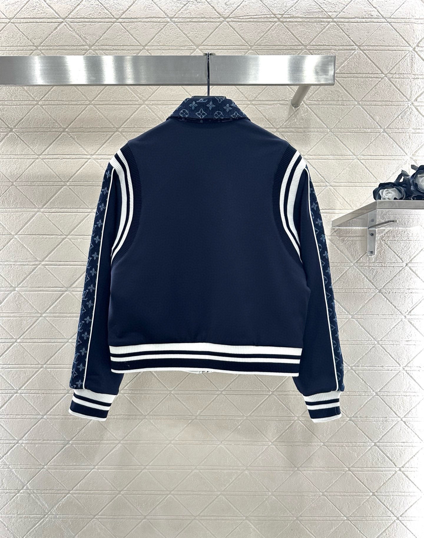 The twill cotton jacquard denim material has a delicate texture and a flowing and stylish look when worn. It features a lapel zipper open top jacket with a double-sided design. The large body is a solid color spliced denim four leaf clover letter jacquard, which is embellished in the lapel pocket and echoes the striped contours of the cuffs and shoulders. The layers are rich and the design is fashionable and versatile. The front leather buckle zipper is matched with the pocket metal emblem tag decoration, making the upper body handsome and relaxed, and the outfit fashionable and stylish
