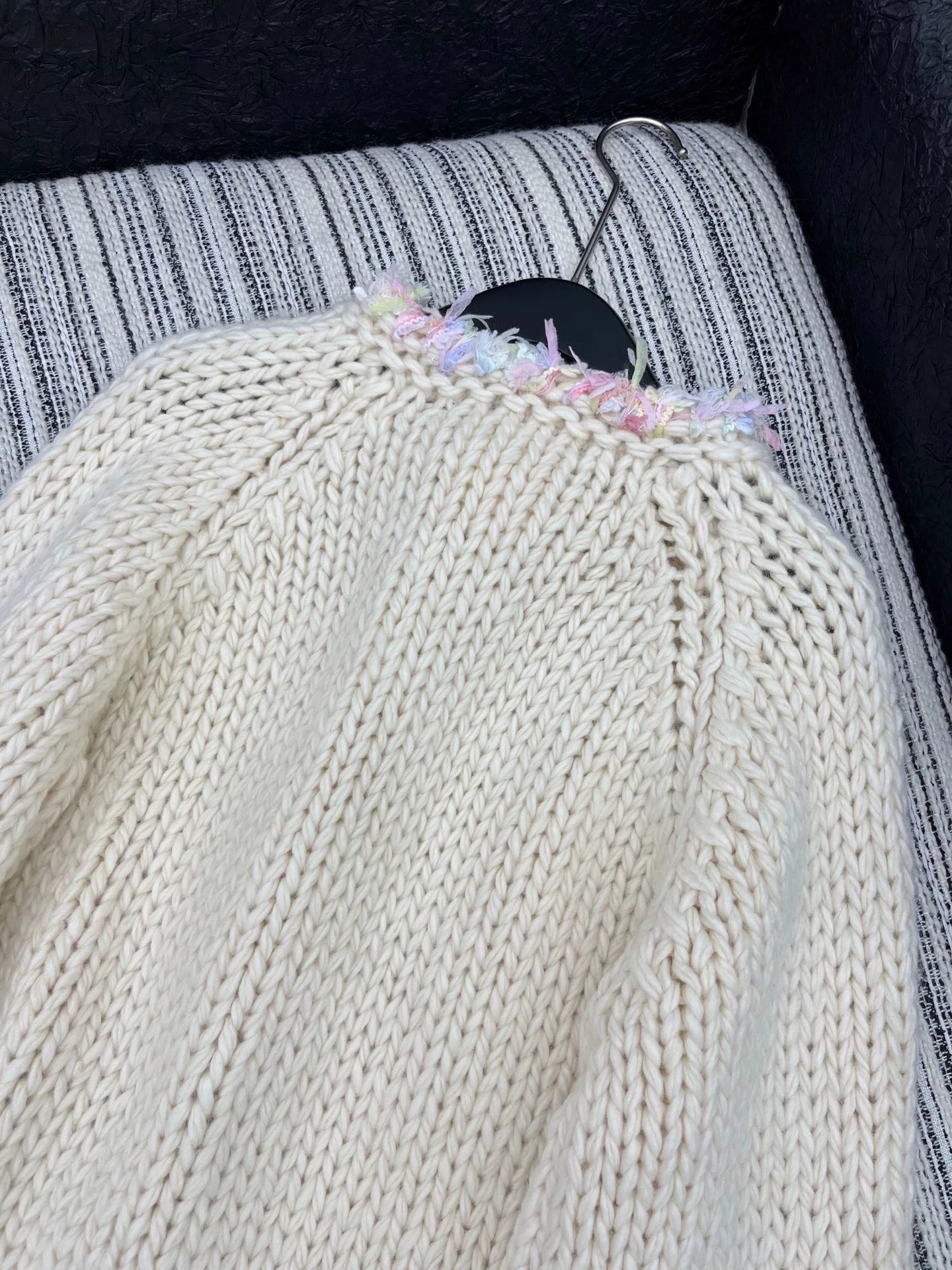 The main color tone is beige, with colorful tassel lace decorations on the collar and hem, adorned with pearl rhinestone buttons, simple and stylish.