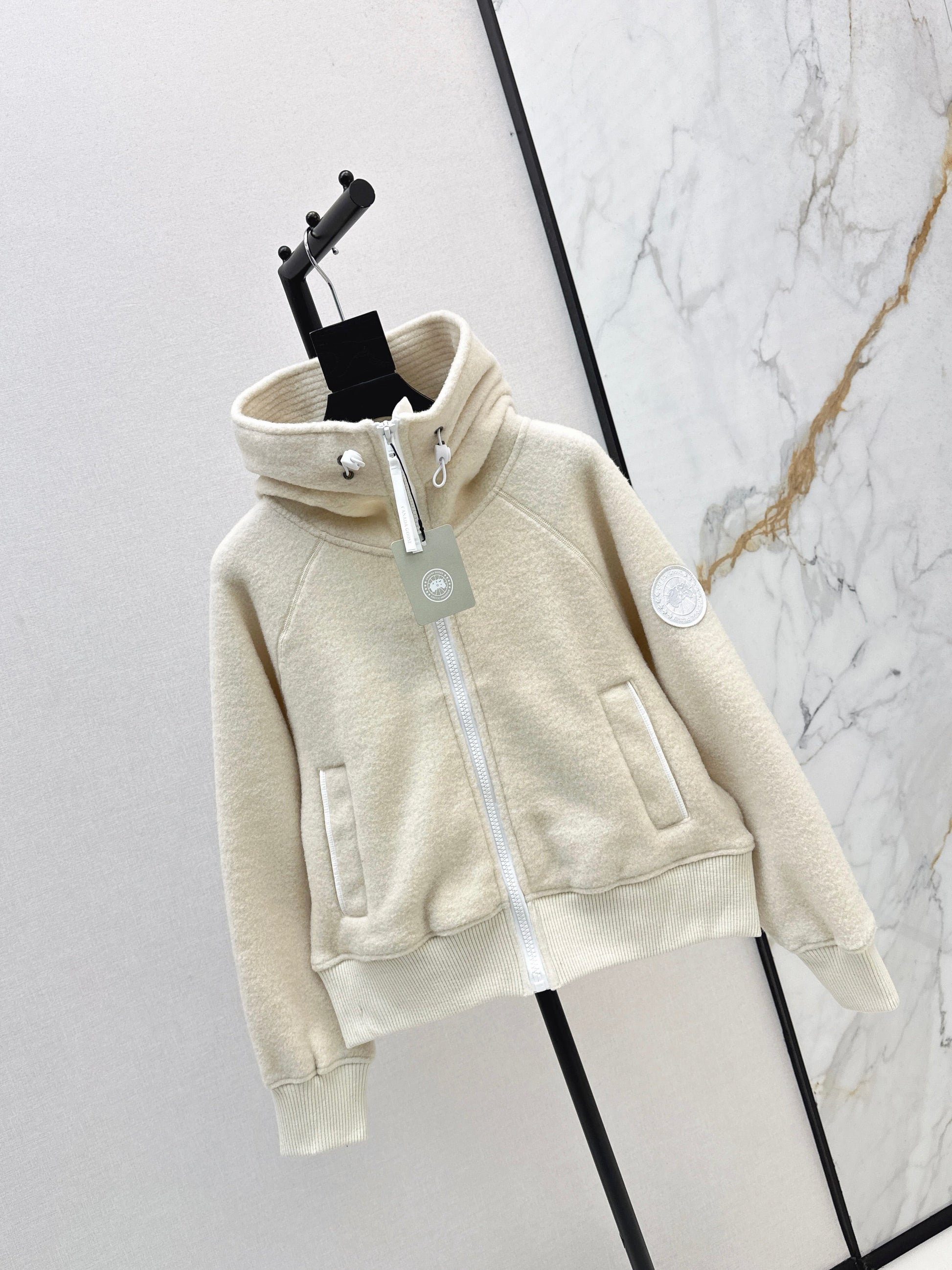 Newly added beige super versatile classic stand up collar hoodie with customized woolen nylon material, soft and comfortable to touch, and first-class warmth