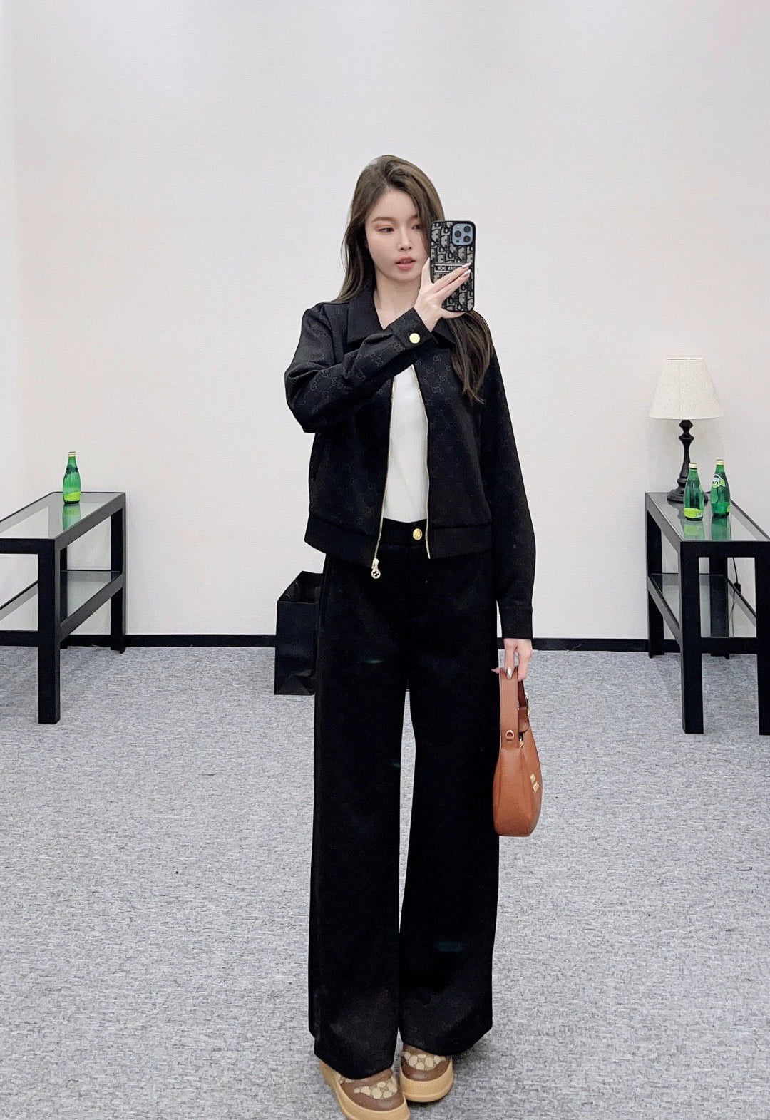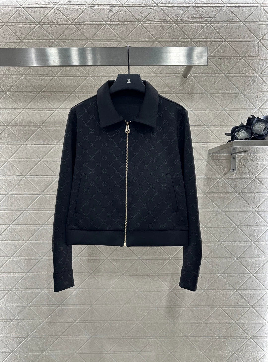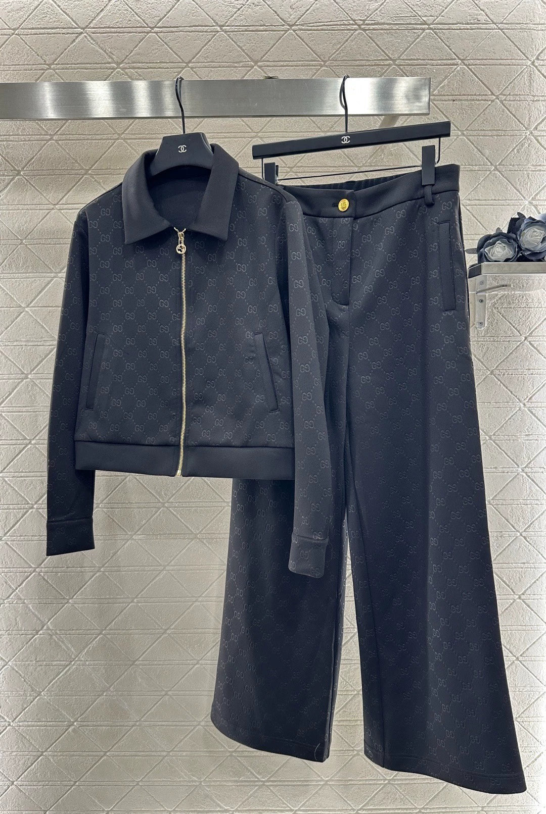 The twill cotton material is comfortable and easy to wear, with a stylish lapel zipper jacket cut and a zipper opening design that can be adjusted freely. The entire body is covered with a three-dimensional textured double G brand letter logo, which low-key highlights the brand's personality charm. The chain buckle hollow letter decoration is more textured. Paired with wide leg straight leg long pants of the same series, it is comfortable and fashionable to wear