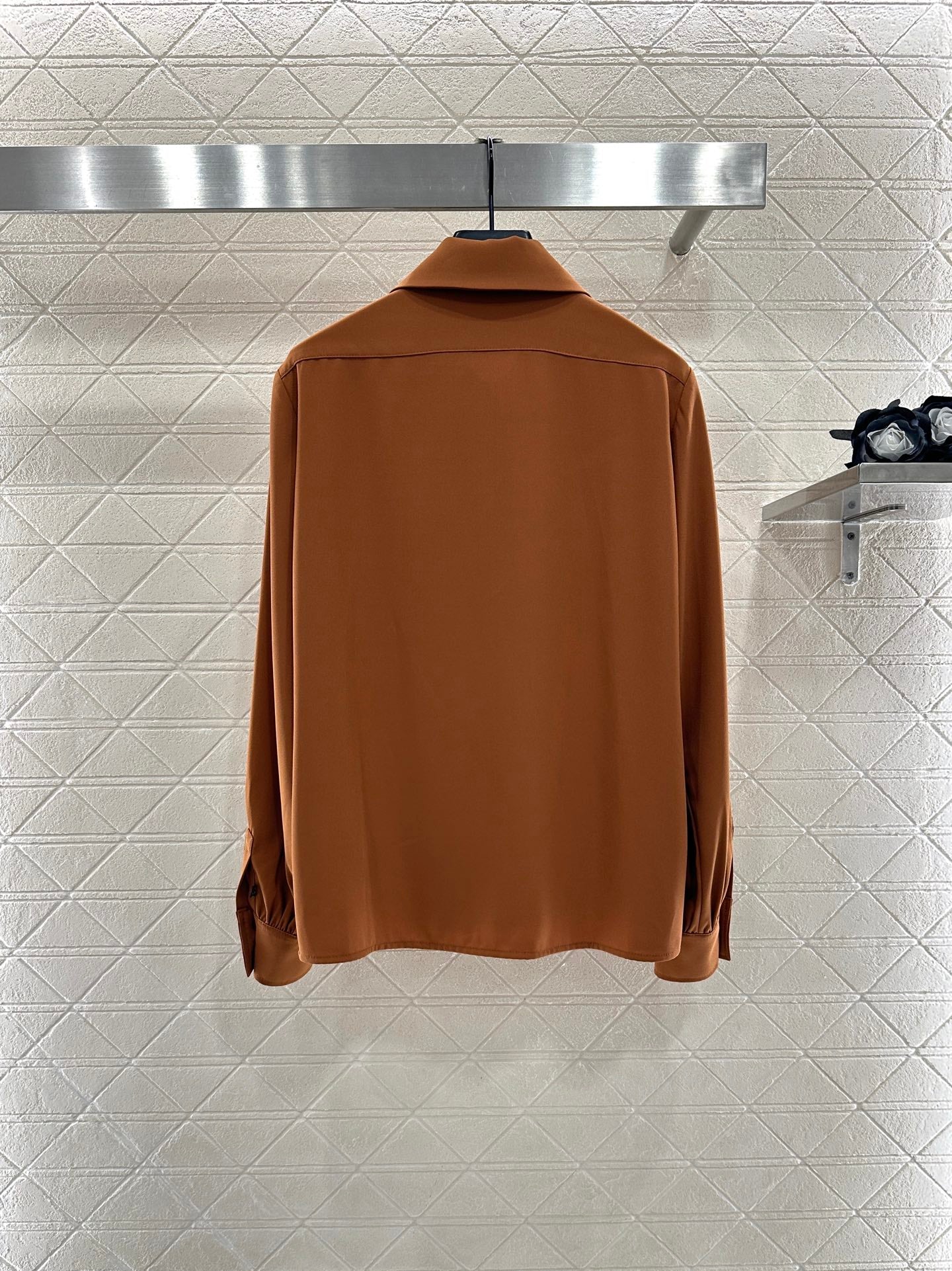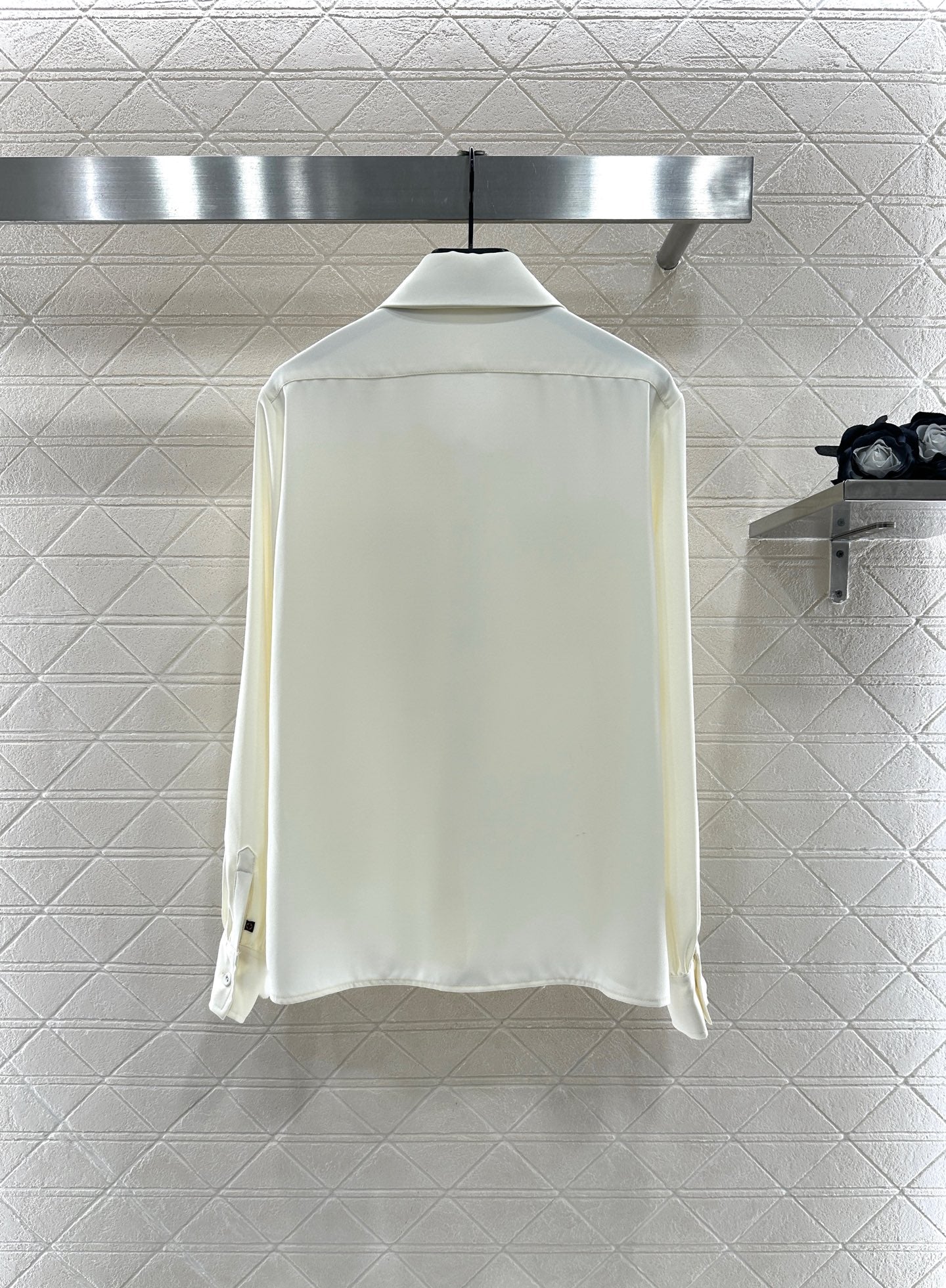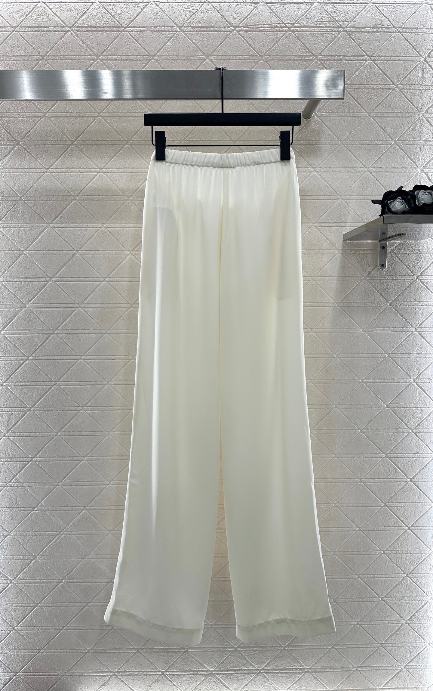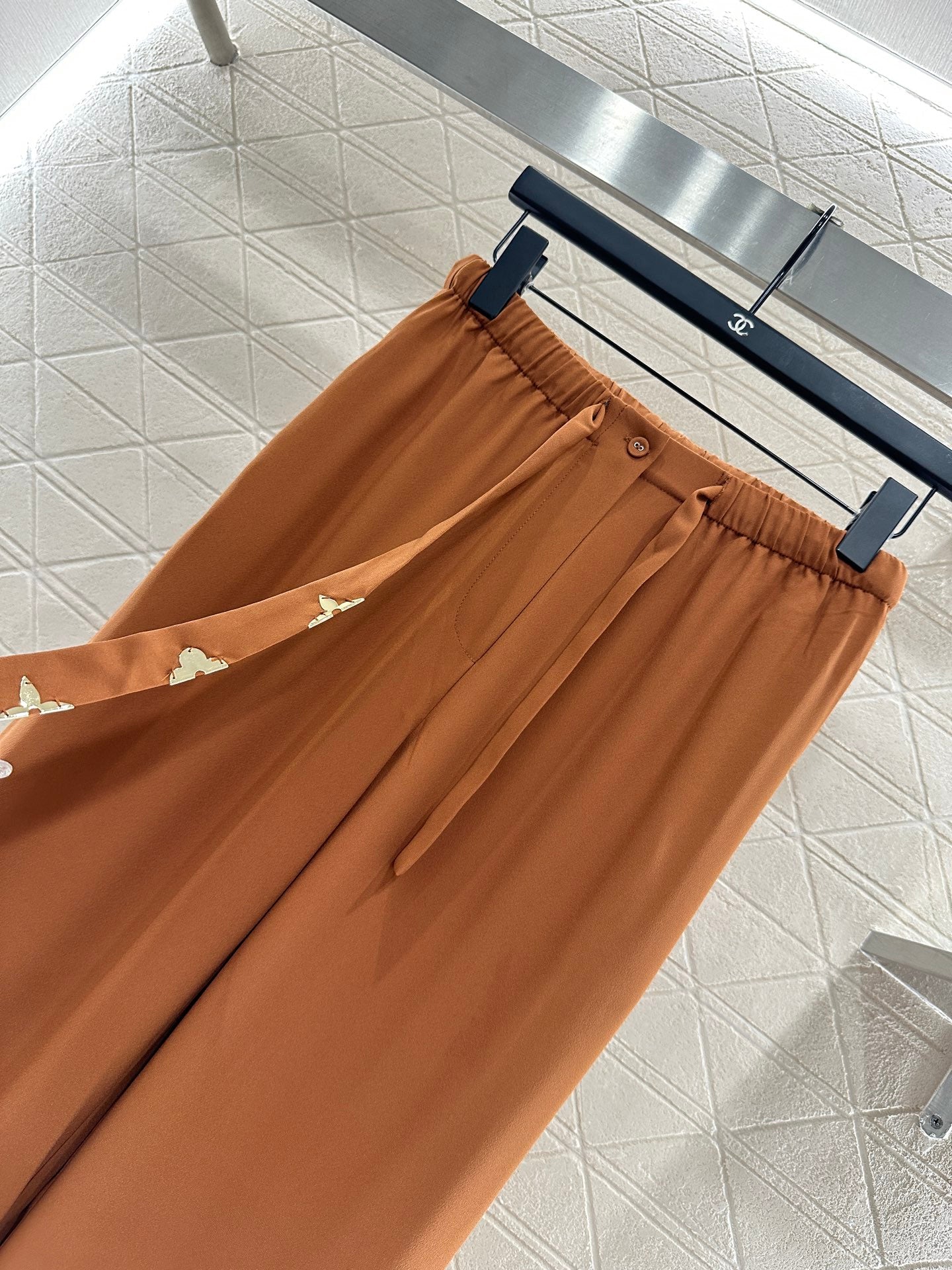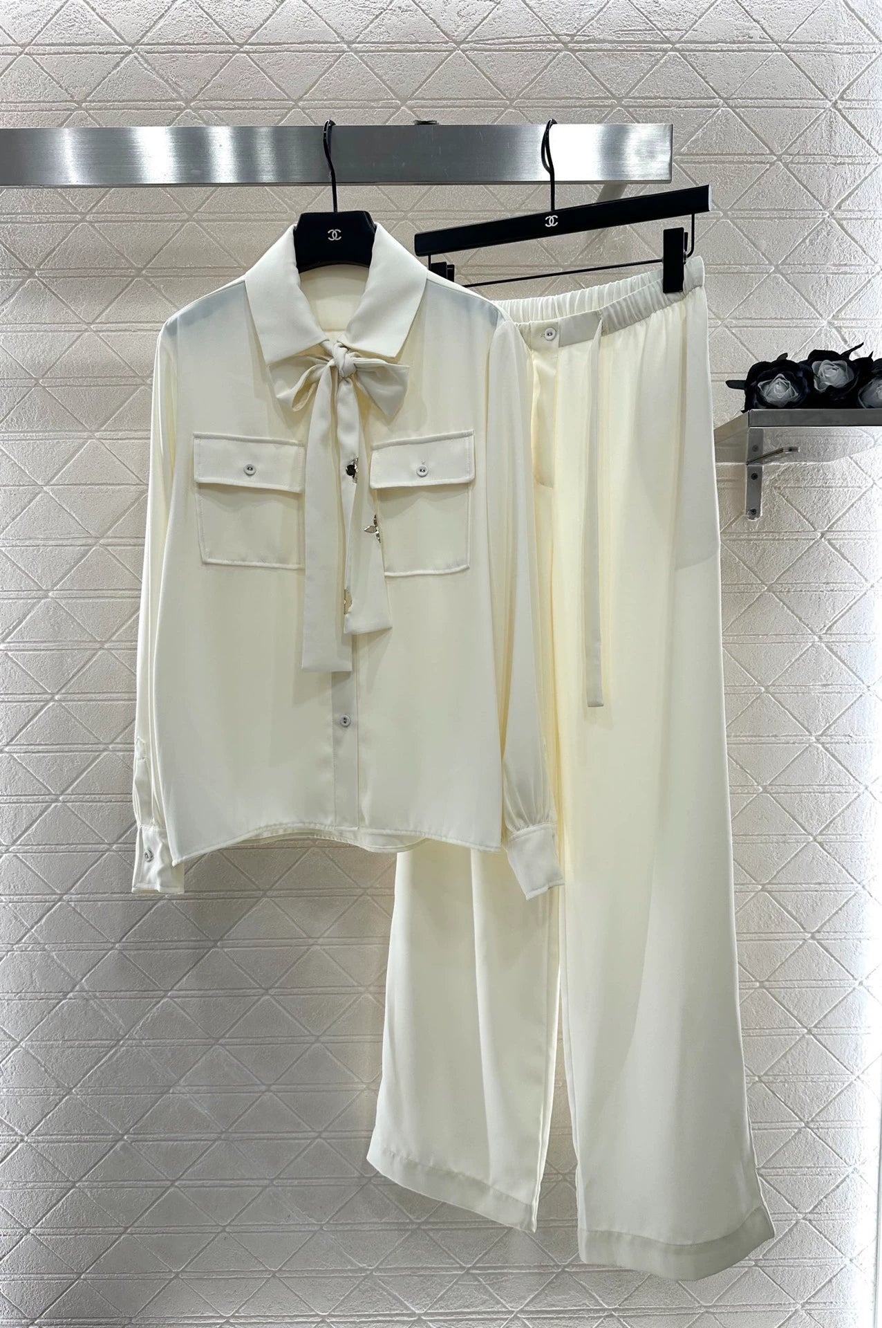 Thick twill material, glossy texture, comfortable drape, lapel bow ribbon shirt ➕ Straight leg pants set. Loose straight tube silhouette, large body solid color shoulder version, paired with symmetrical design of chest flap pocket, with added four leaf clover metal logo decoration and rich layers on the ribbon, easily highlighting fashionable temperament. Paired with high waisted lace up pants from the same series, it echoes the highlights and creates a good proportion of long legs, making the outfit full of relaxed style without losing elegance.