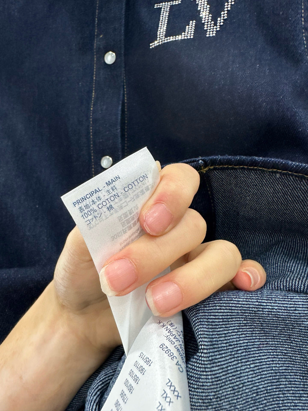 The twill cotton denim material is washed multiple times to present a crisp texture. The collar and shoulder denim shirt is cut with a basic letter rhinestone logo on one side of the chest, which echoes the back logo, highlighting the brand style. It is durable and high-end. The whole body deep blue denim base can easily create a fashionable style without complicated visual effects. It is full of personality and creativity. It is matched with the same series of wide leg straight leg pants. The back hip pocket and leather logo echo the upper body. The brand's high-end design sense is fully matched, and it is fashionable when worn as a set or alone