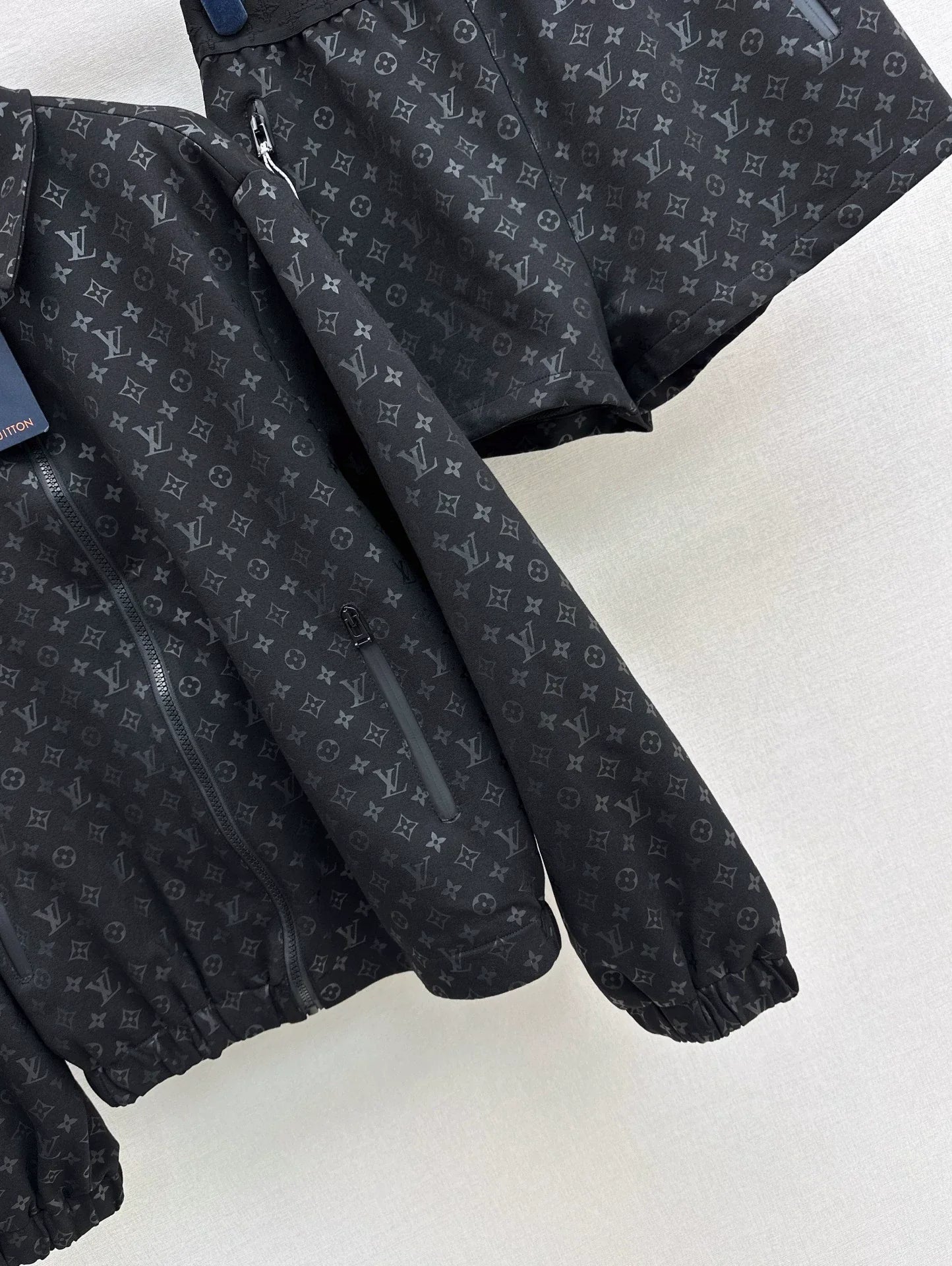 Made of high-quality cotton material with a sleek and stylish collar, this loose silhouette jacket is paired with shorts. The zipper is open and adjustable, and the cutting is simple and fashionable. The whole body is made of four leaf clover elements, with letters printed all over the jacket. The hem of the sleeve is wrapped with elastic details, and the overall low-key high-end design is matched with the same series of high waisted shorts. The zipper and other upper and lower details echo the brand style, revealing a slim waist and long legs
