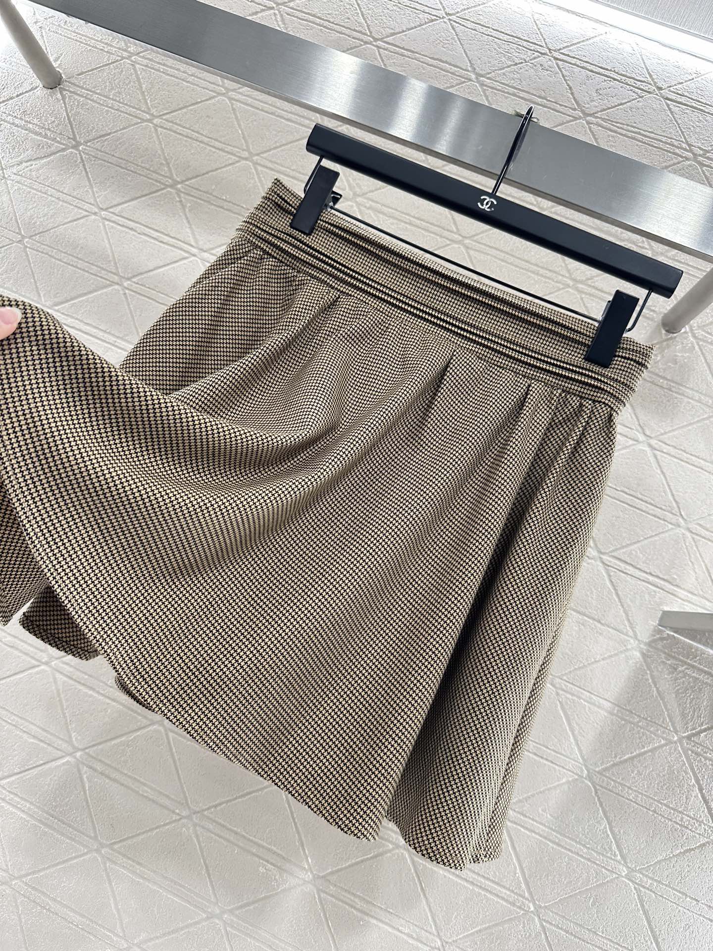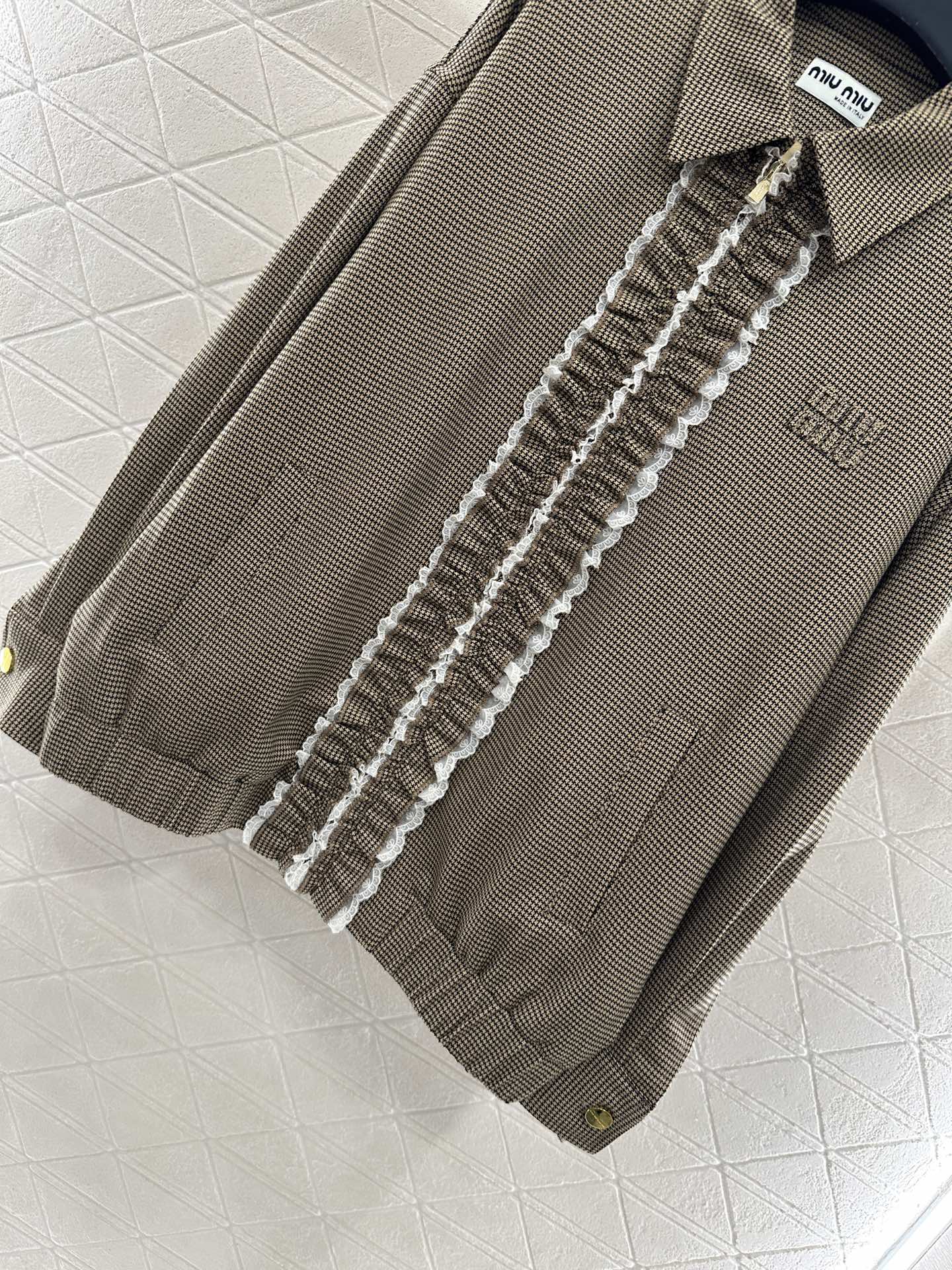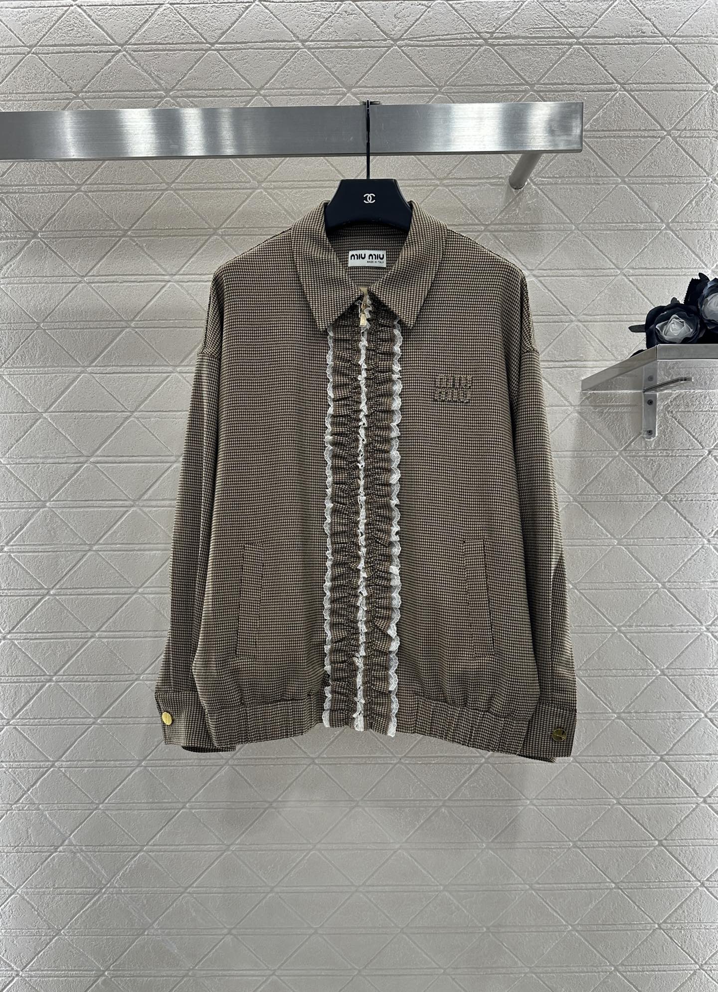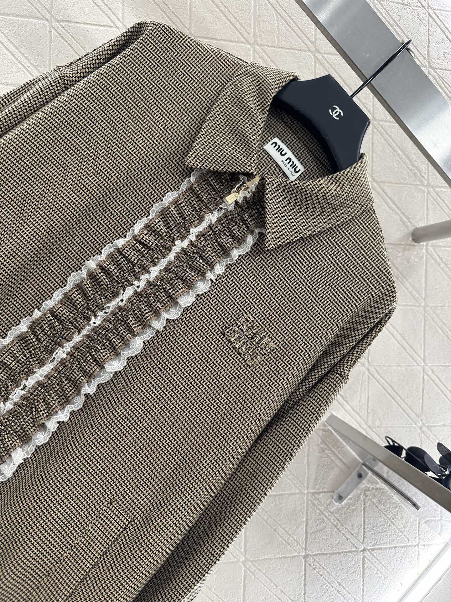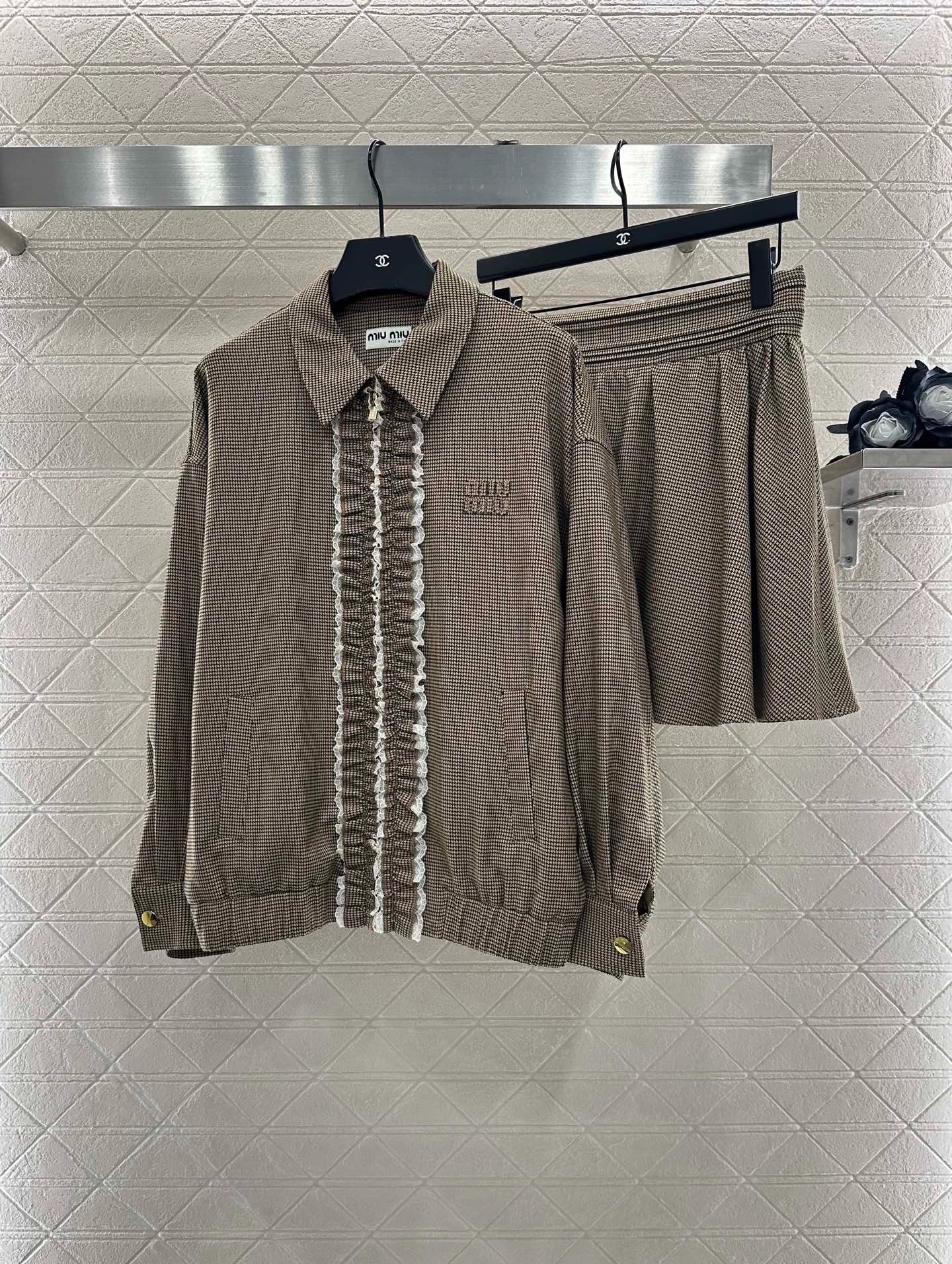 The texture of the human cotton material is delicate, and the high-end lapel zipper jacket has a shoulder shape that is oversized. The design highlights a relaxed posture, and the large body is Maillard brown with fine grid patterns. The front zipper is matched with symmetrical white lace lace decoration, which is eye-catching and fashionable. The chest letter logo is exquisite and durable, highlighting the brand style and presenting a sweet and anti-aging style. It is matched with the same series of short skirts, with horizontal pleats at the waist and umbrella shaped pleated skirt