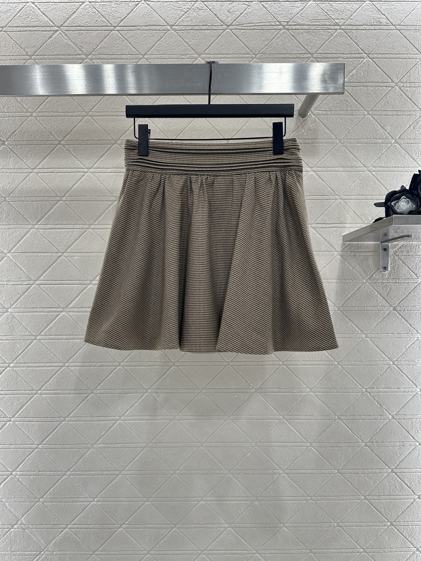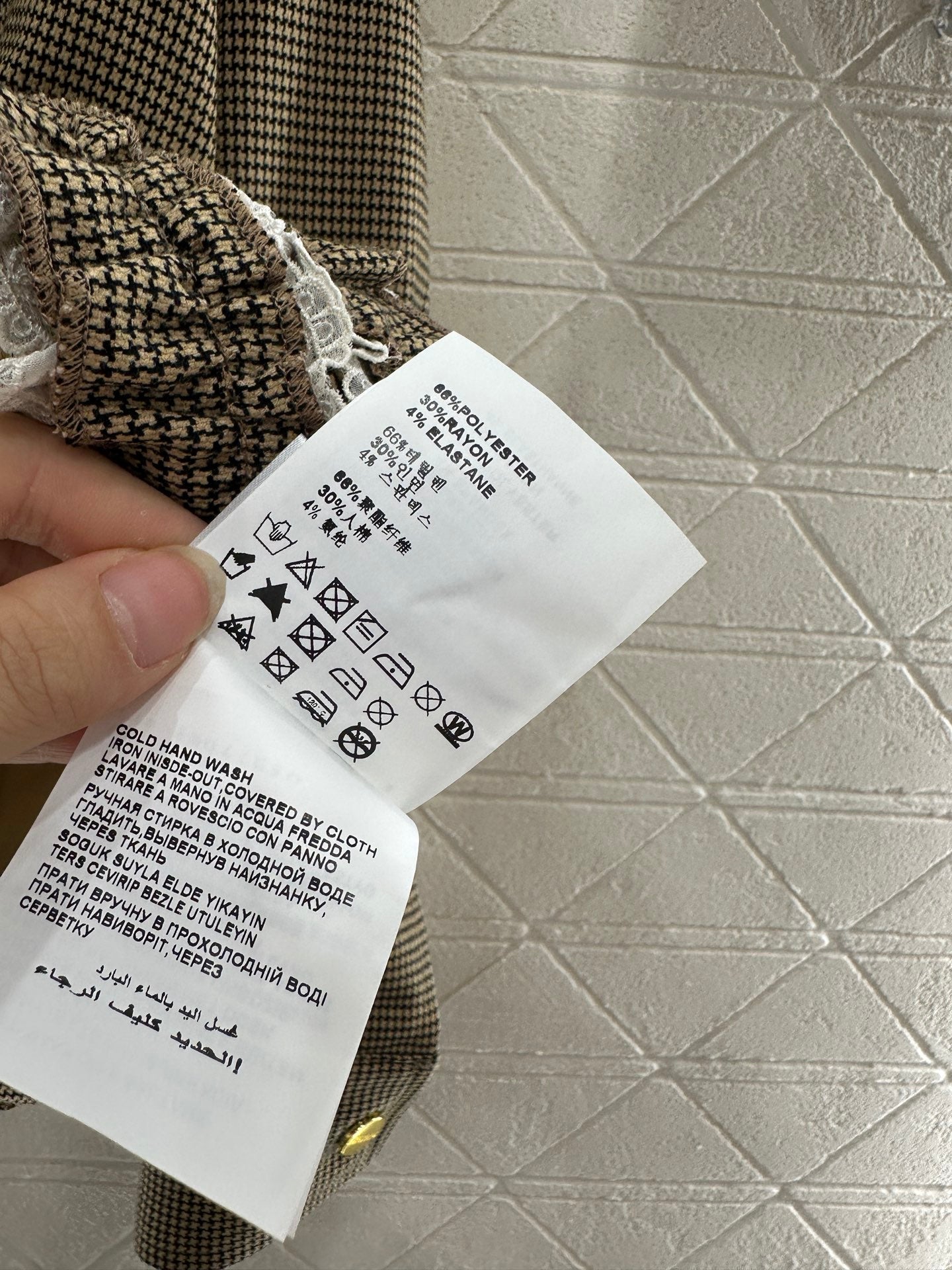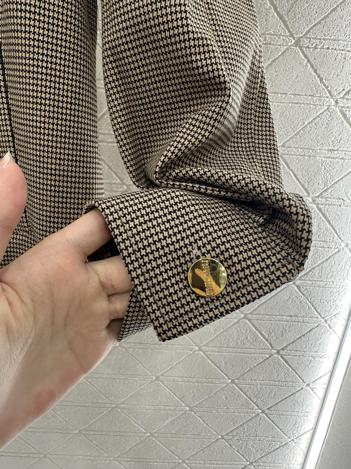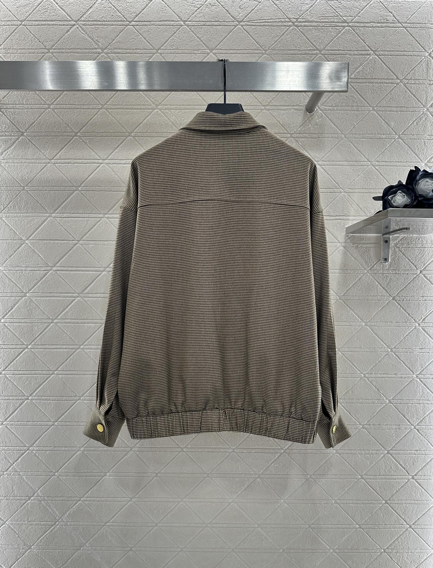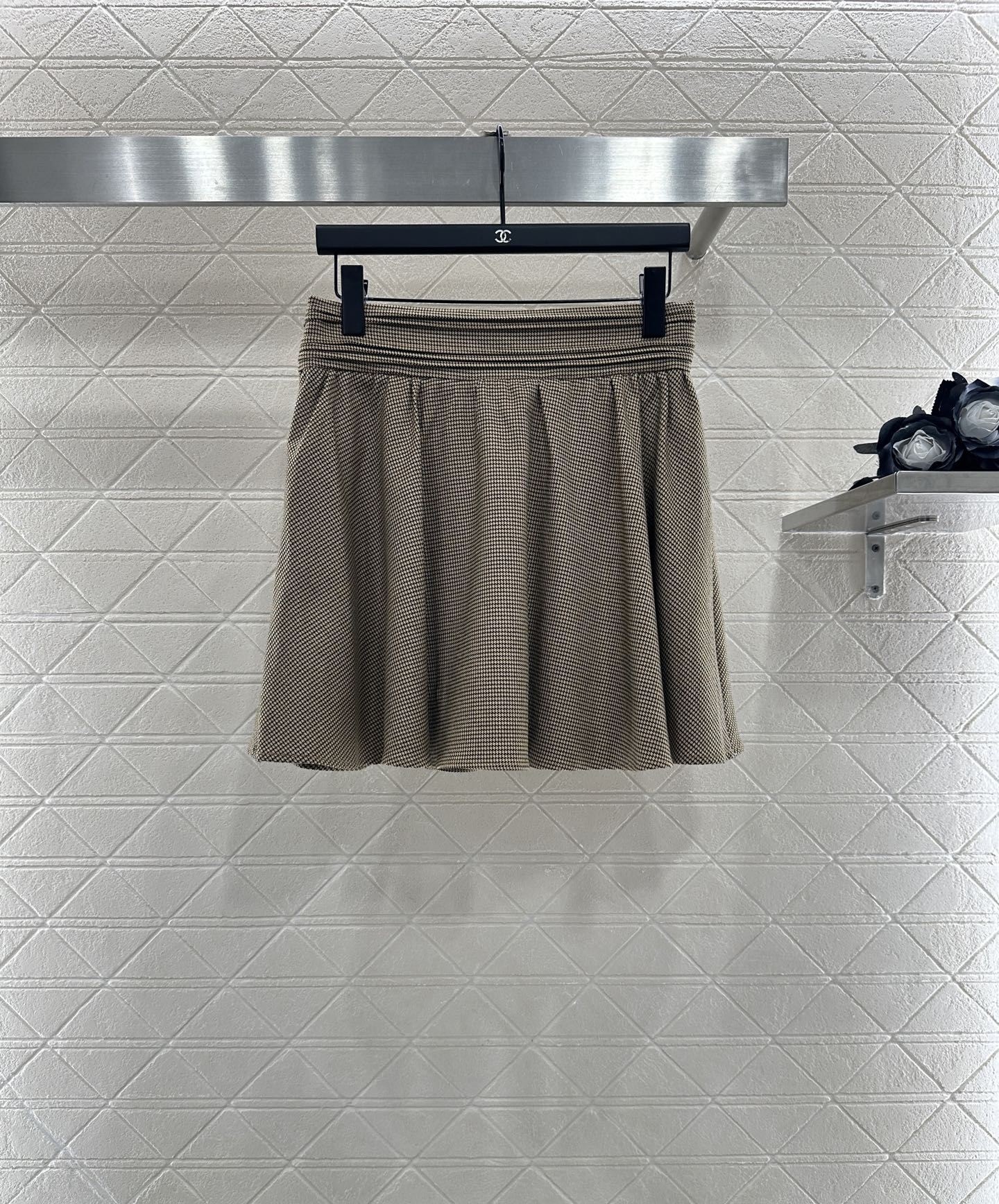 The texture of the human cotton material is delicate, and the high-end lapel zipper jacket has a shoulder shape that is oversized. The design highlights a relaxed posture, and the large body is Maillard brown with fine grid patterns. The front zipper is matched with symmetrical white lace lace decoration, which is eye-catching and fashionable. The chest letter logo is exquisite and durable, highlighting the brand style and presenting a sweet and anti-aging style. It is matched with the same series of short skirts, with horizontal pleats at the waist and umbrella shaped pleated skirt