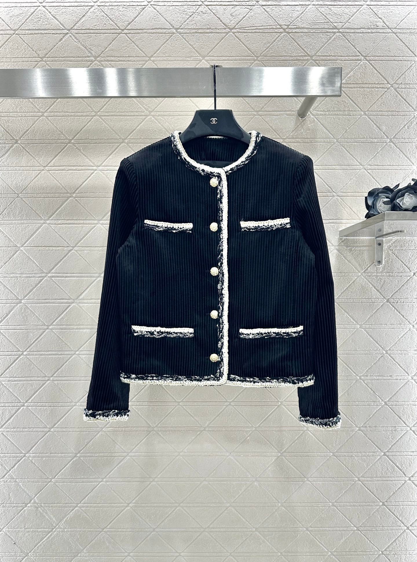 Corduroy material, with distinct texture and superior quality, featuring a round neck shoulder jacket design. The corduroy fabric creates an atypical small fragrance style, and the whole body is wrapped with woven black and white contrasting three-dimensional edges for embellishment, outlining the contours and highlighting the design sense, showcasing luxury yet elegance. The checkered round buckle shines elegantly and charmingly, while the jacquard dark pattern lining highlights the taste of socialites. This jacket is suitable for different occasions and is fashionable and elegant to wear