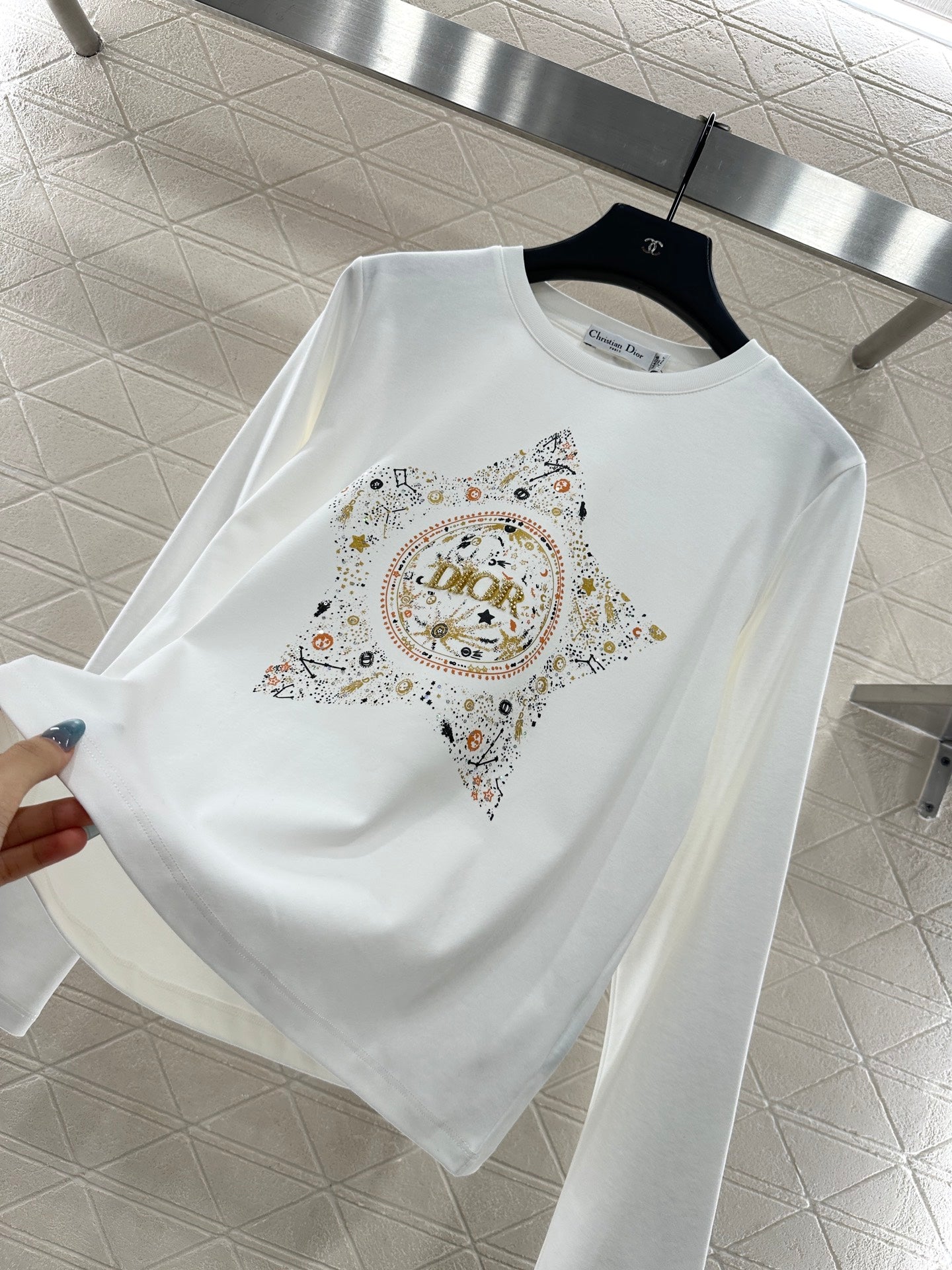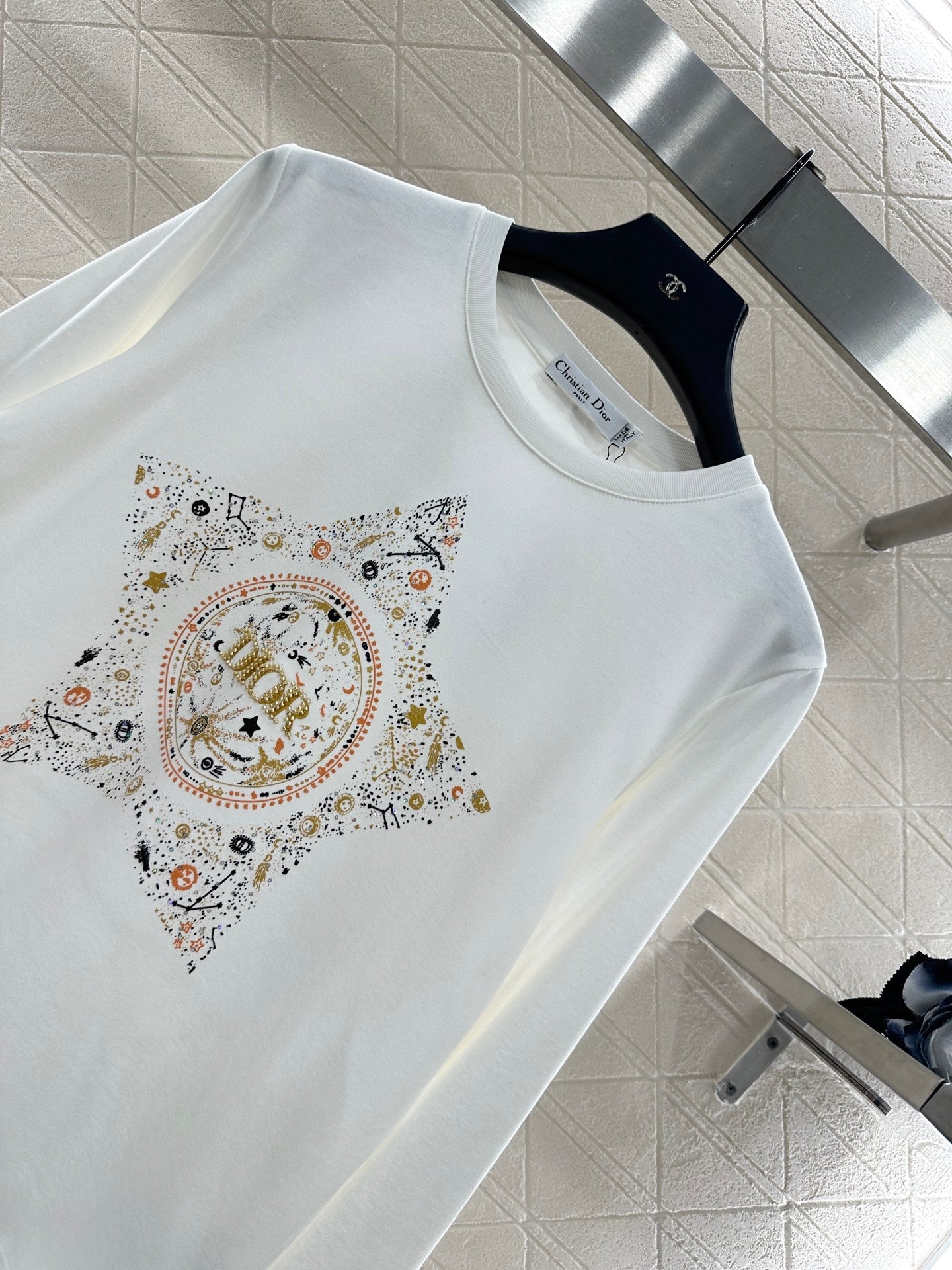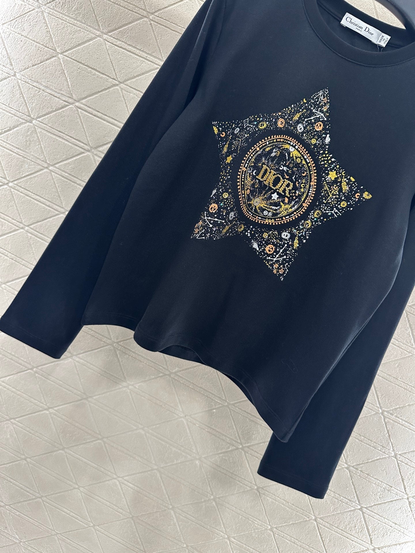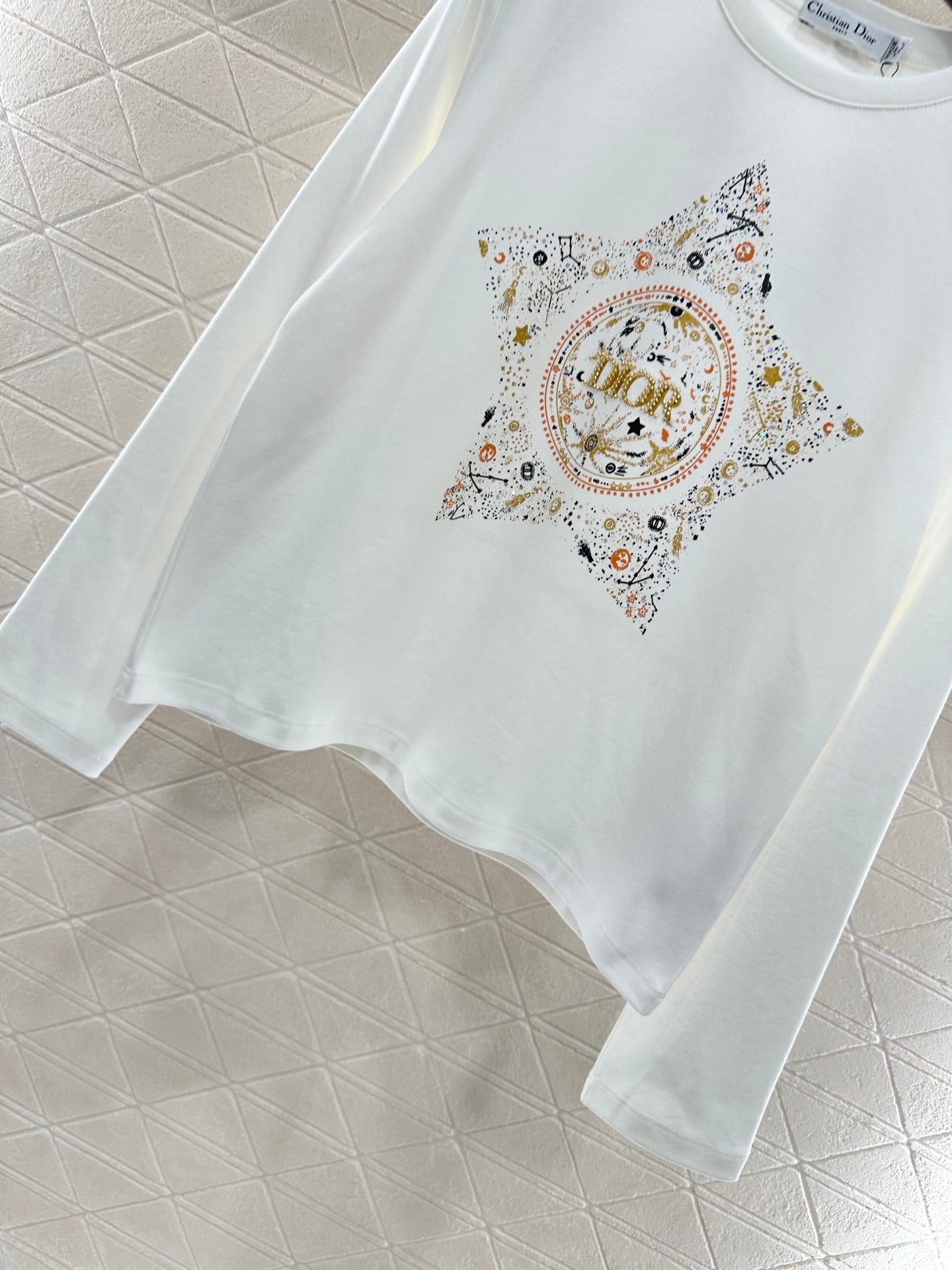 Made of all cotton material, it has a comfortable texture and good elasticity to wear. The round neck long sleeved top is cut, and the chest is embellished with a complete rhinestone letter logo with nail bead technology. The outer contour is decorated with irregular sequin prints to form a five pointed star pattern, jumping black, white, brown, and yellow colors to add a playful touch. The regular fit pattern shows vitality on the upper body, refreshing and anti-aging. It is the first choice for wearing inside and outside in autumn and winter.