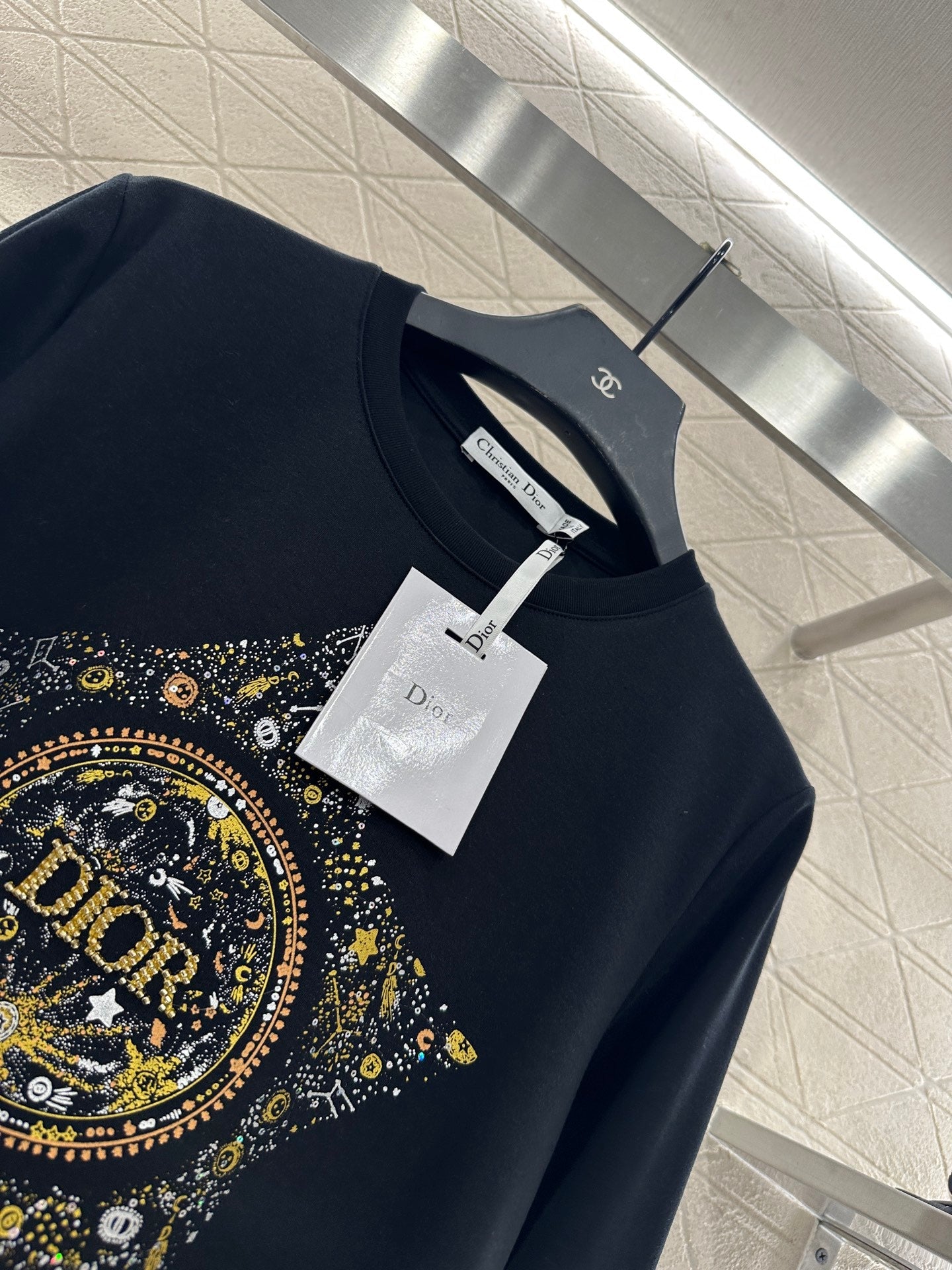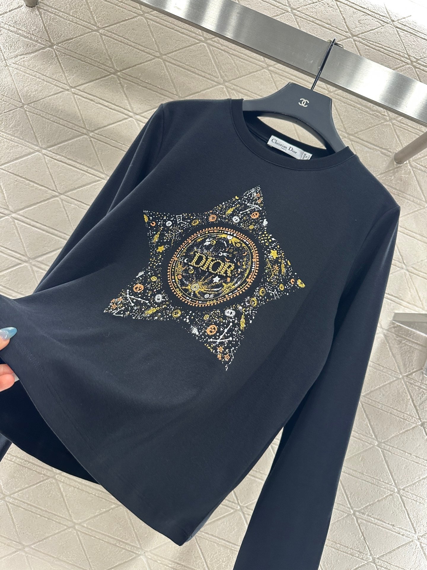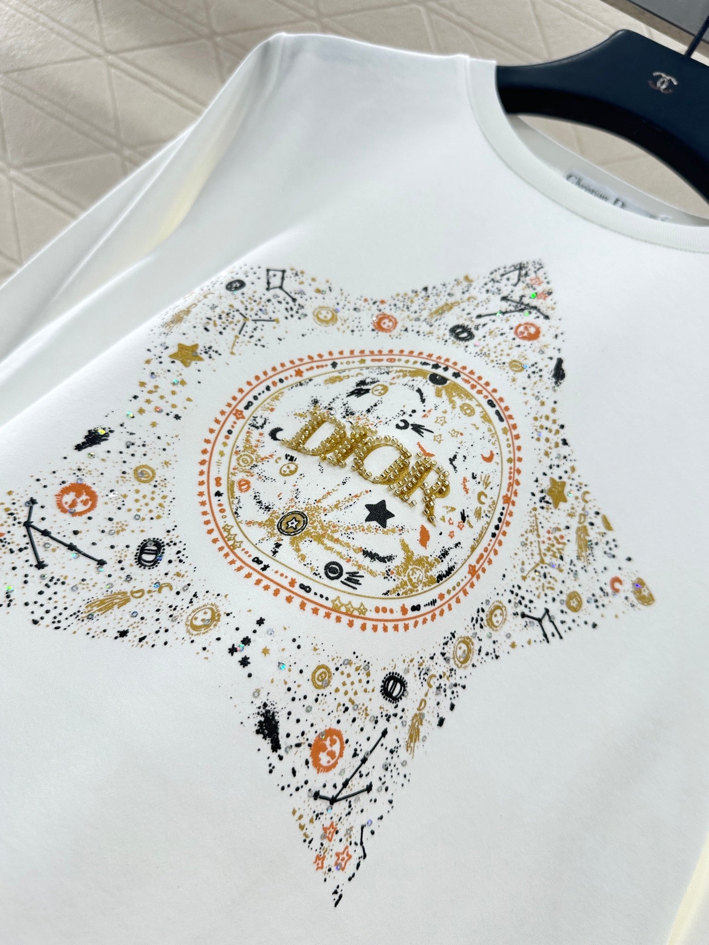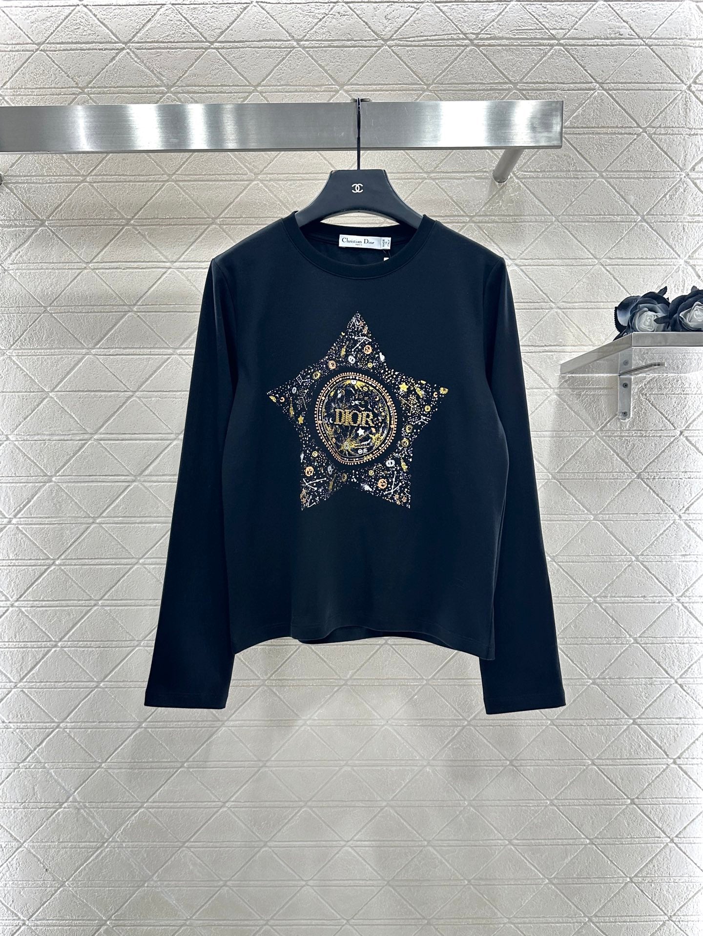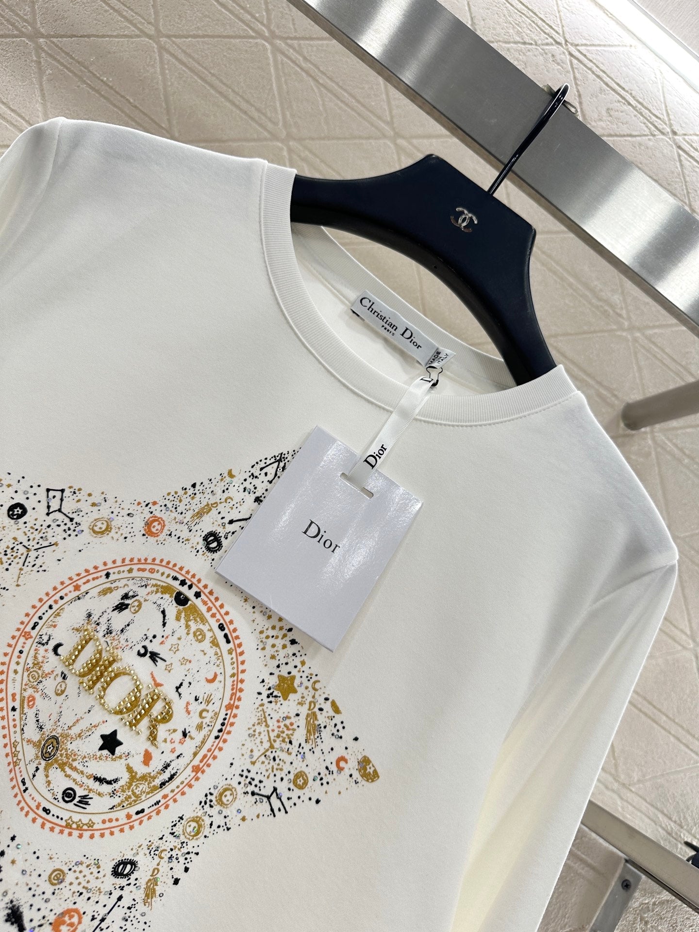 Made of all cotton material, it has a comfortable texture and good elasticity to wear. The round neck long sleeved top is cut, and the chest is embellished with a complete rhinestone letter logo with nail bead technology. The outer contour is decorated with irregular sequin prints to form a five pointed star pattern, jumping black, white, brown, and yellow colors to add a playful touch. The regular fit pattern shows vitality on the upper body, refreshing and anti-aging. It is the first choice for wearing inside and outside in autumn and winter.