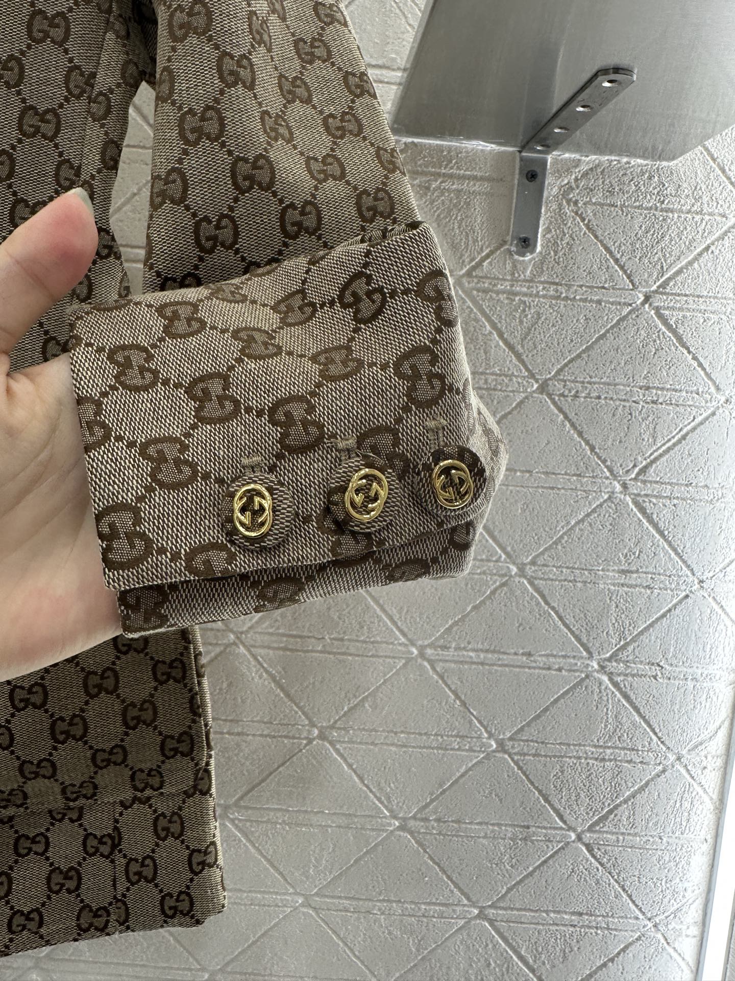 Jacquard material texture, high-end and stylish lapel, shoulder length suit jacket, tailored with a gun collar and letter lapel, adjustable cutting, simple and atmospheric all body double G jacquard full printed cufflinks ➕ Buckle pocket ➕ The rear slit with ample details is low-key, luxurious, and fully detailed, echoing the brand's style and showcasing the elegance of a knowledgeable old man