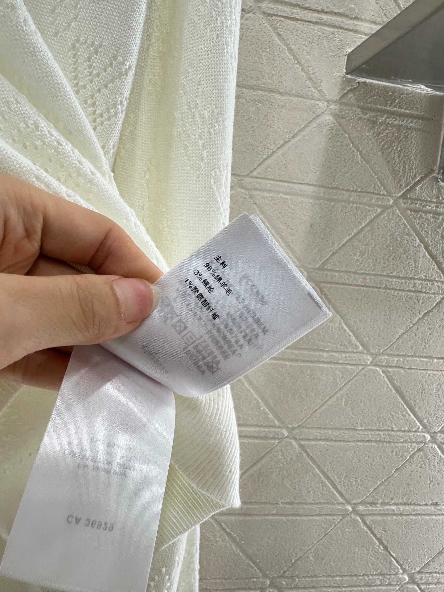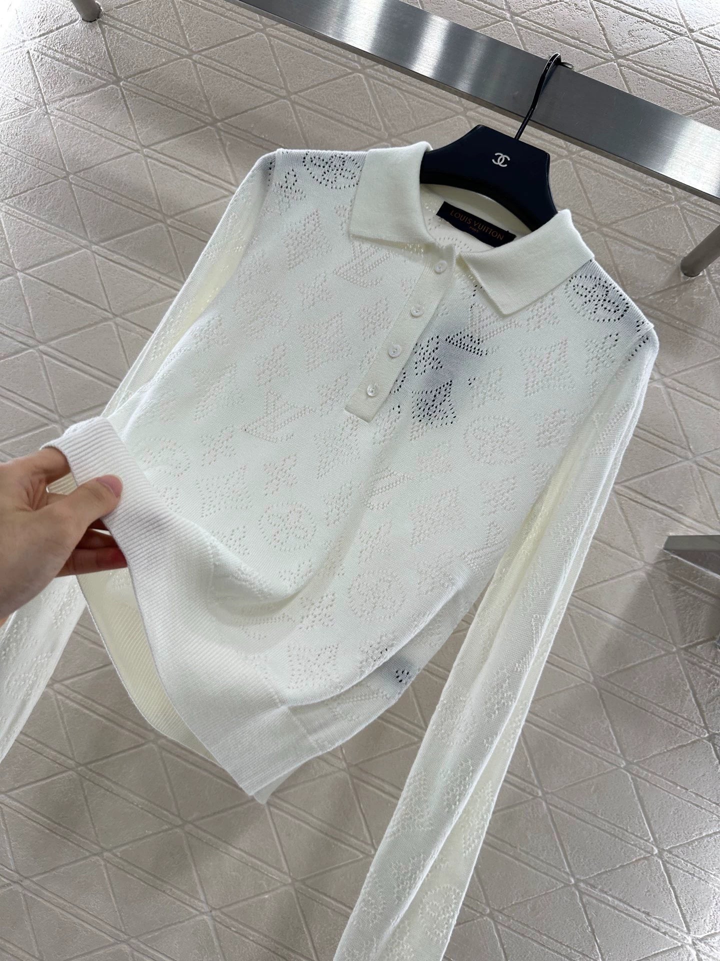 Premium and comfortable texture, soft lapel knit polo top, cut with hollowed out hooks and flowers throughout the body to form a letter logo, clover element texture, rich sense of money, combined with half open buttons for easy skin exposure, highlighting perfect details, exquisite and stylish, versatile, autumn and winter pure white base shirt, wearing college temperament